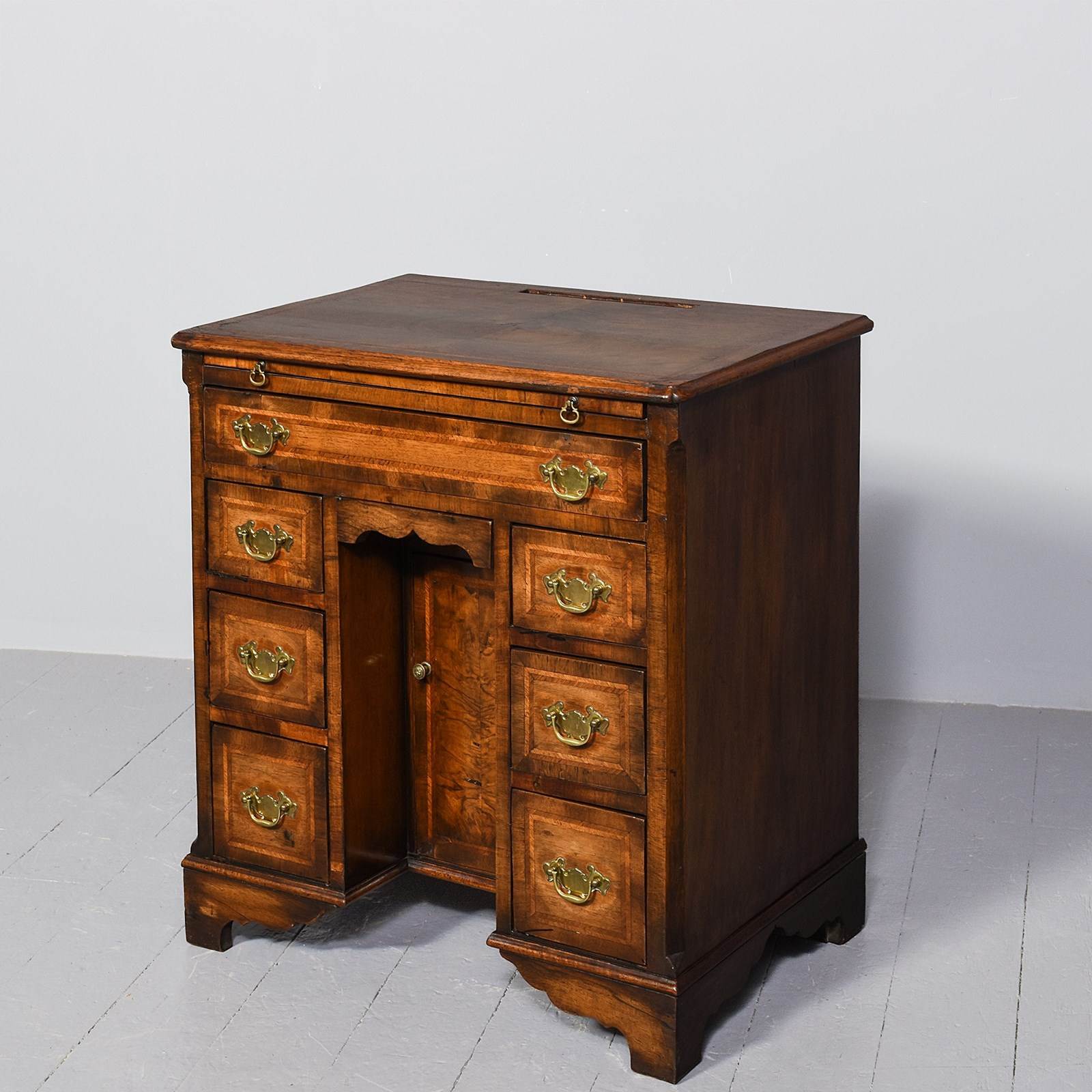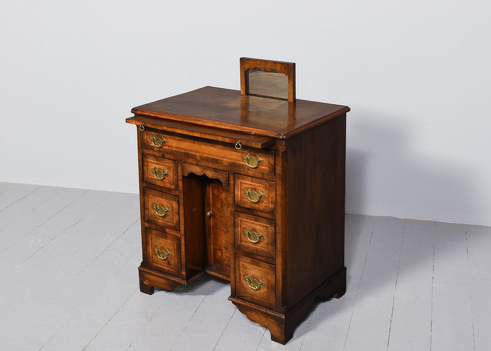 Circa 1880. George II style inlaid figured walnut kneehole dressing chest. The rectangular top with inset corners in mirror-matched figured walnut, herringbone inlay and crossbanding and a moulded fore-edge, bearing a hidden pop-up mirror when the brushing slide is pulled out. Beneath the brushing slide is a long crossbanded and herringbone inlaid drawer with cut brass handles above banks of three smaller drawers on each side of the knee hole with a cupboard. All supported on shaped bracket feet.