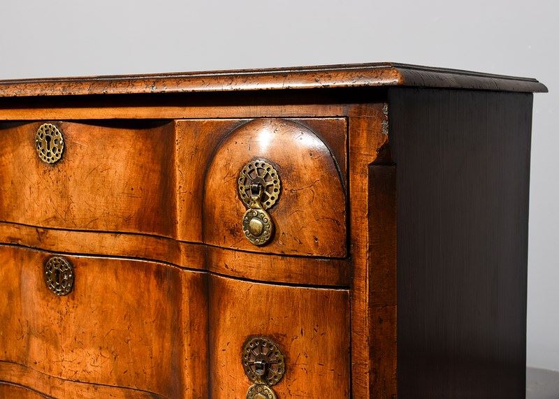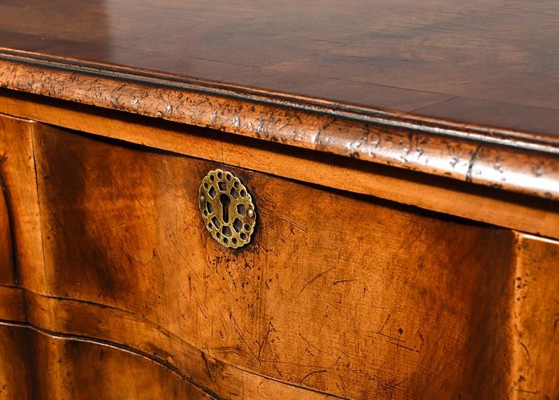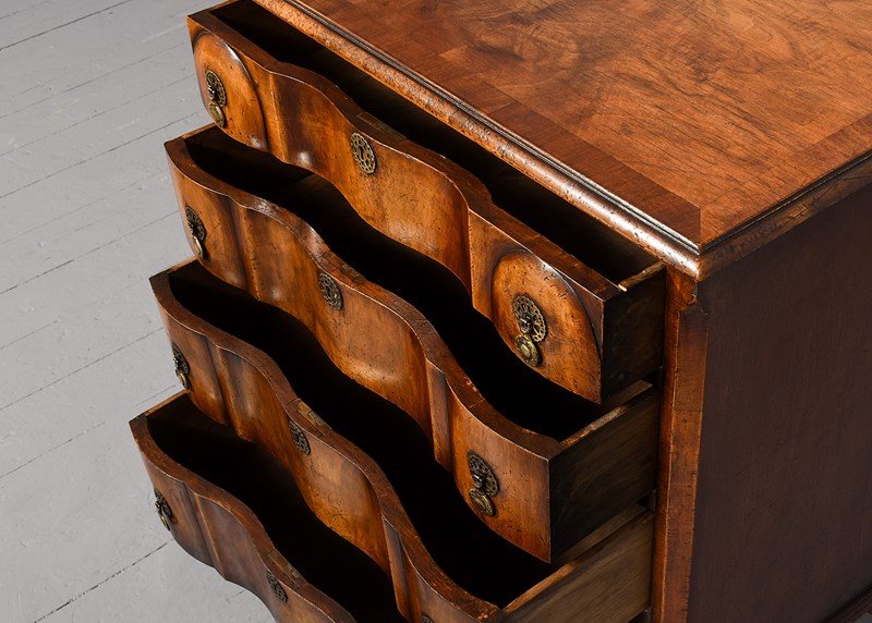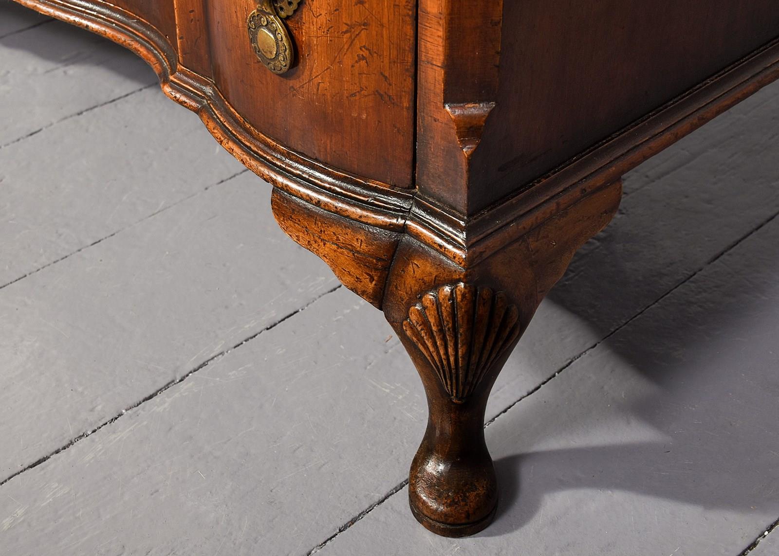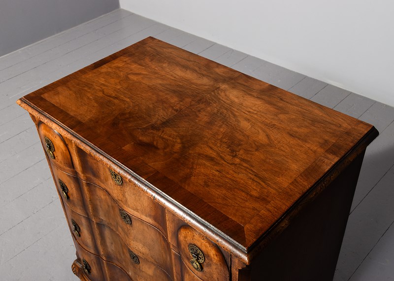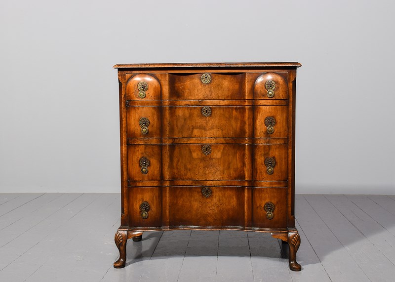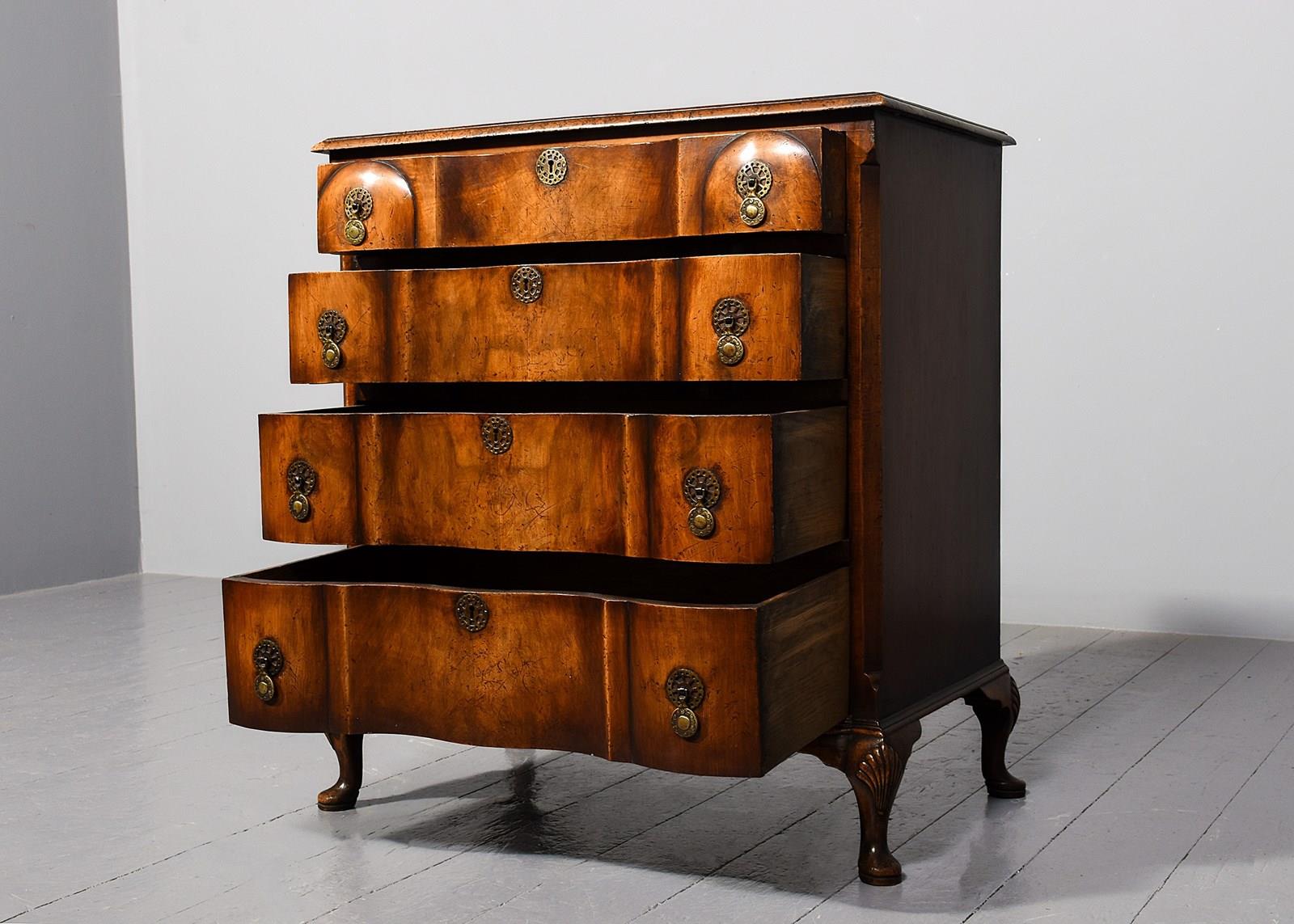 Circa 1920s. George II style shaped front chest of drawers, the top in book matched walnut with broad cross banding, simple moulded fore-edge, the serpentine fronted drawers with a raised section at each end, with elegant pierced circular escutcheon, cast brass circular drop handles with a pierced back plates, the shaped drawers graduate from top to bottom, the chest with canted corners, beneath the bottom drawer there is a simple moulding, resting on four squat cabriole legs with quarter blocks, carved scallop shells on the facing, finishing on pad foot.