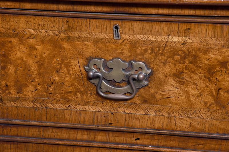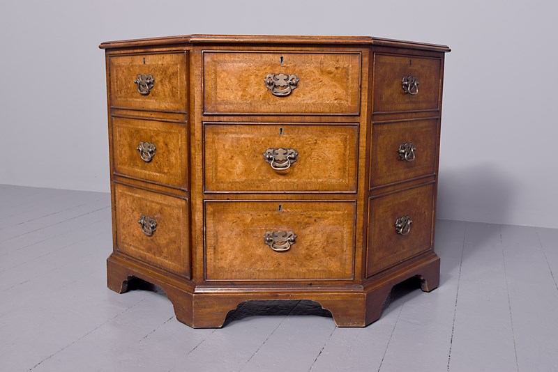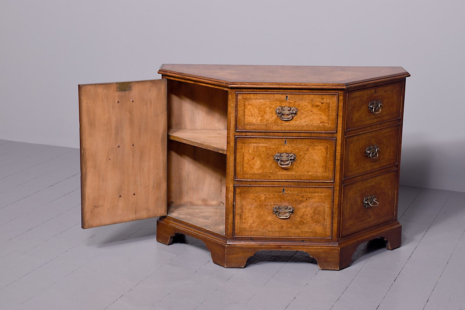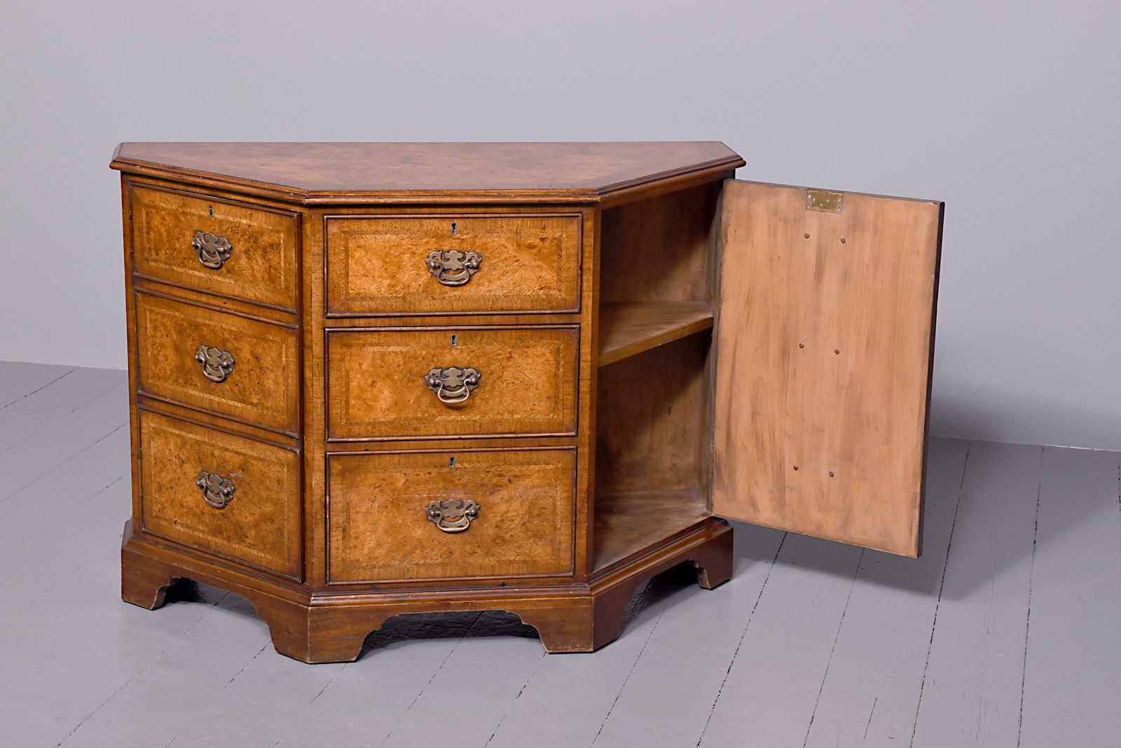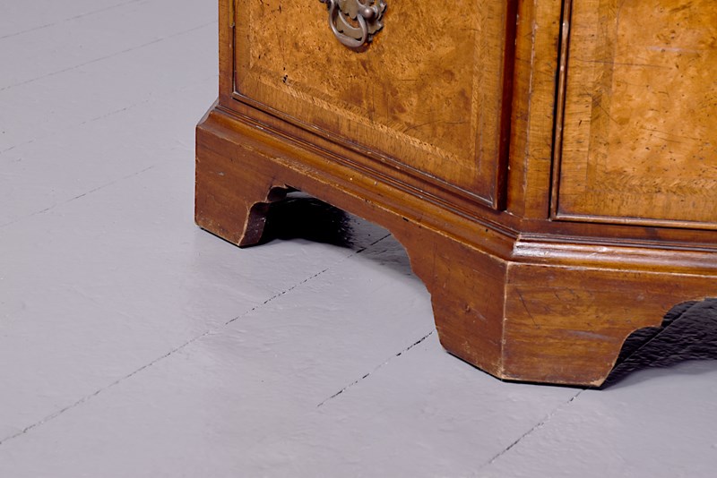 Circa 1920s. A George II style shaped floor standing cabinet, the top with burr walnut, with herringbone inlay and broad cross-banding with stylish moulded fore-edge, the front with a bank of three drawers with similar herringbone and banding as the top, each with cast brass swan neck handles with a pierced back plate and escutcheon, the chamfered sides each with a pair of doors with three faux drawers similar to the front, beneath the cupboards and drawers there is an elegant moulding all resting on bracket feet which follow the form of the top.