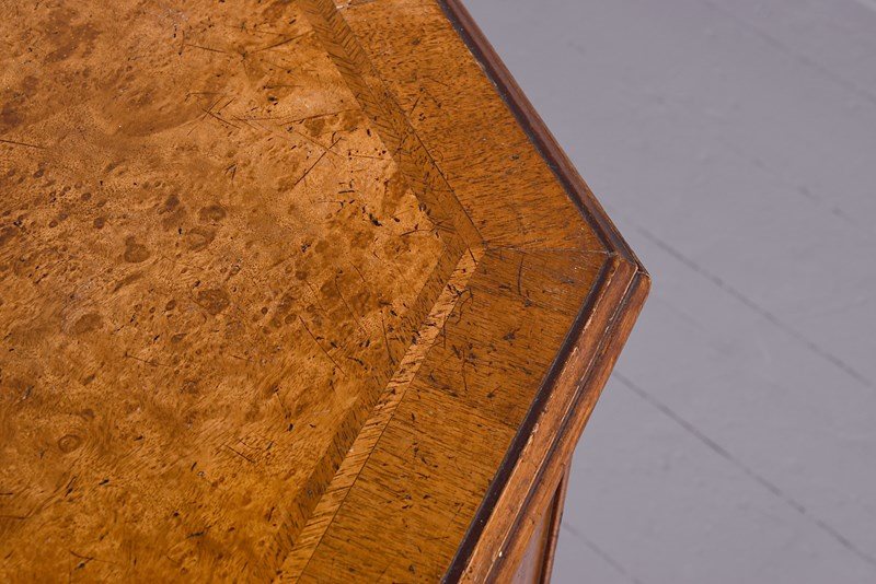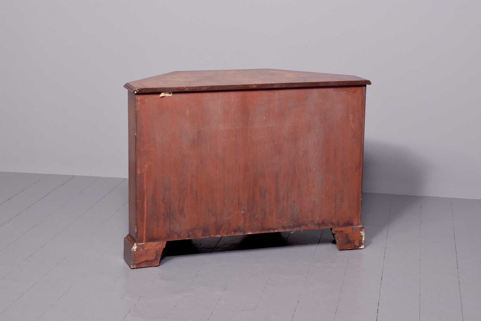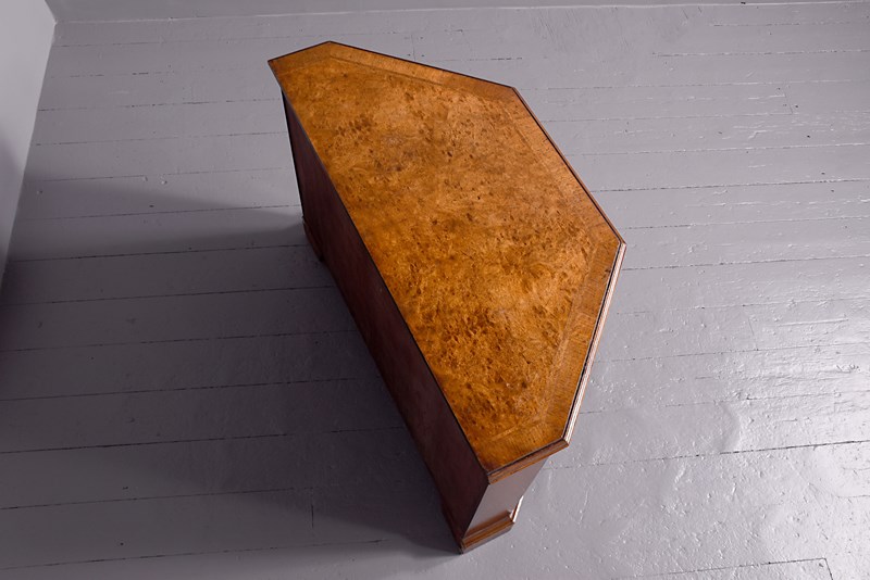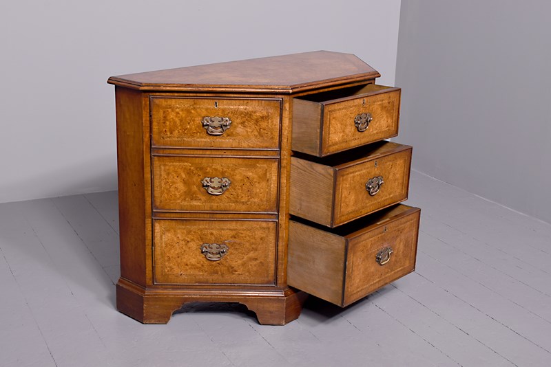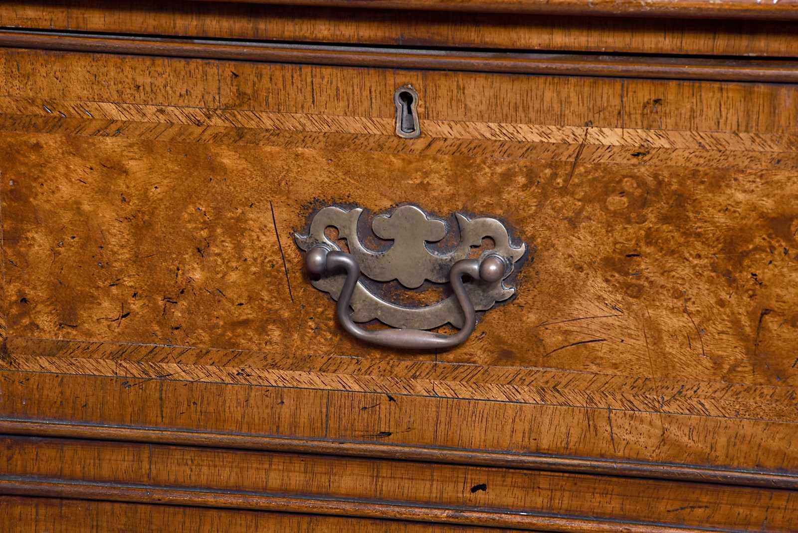 Circa 1920s. A George II style shaped floor standing cabinet, the top with burr walnut, with herringbone inlay and broad cross-banding with stylish moulded fore-edge, the front with a bank of three drawers with similar herringbone and banding as the top, each with cast brass swan neck handles with a pierced back plate and escutcheon, the chamfered sides each with a pair of doors with three faux drawers similar to the front, beneath the cupboards and drawers there is an elegant moulding all resting on bracket feet which follow the form of the top.