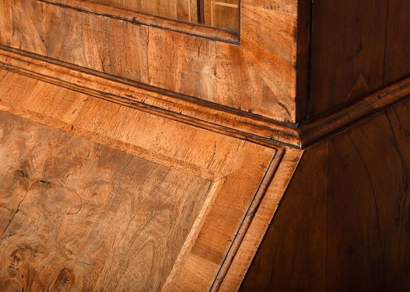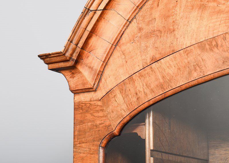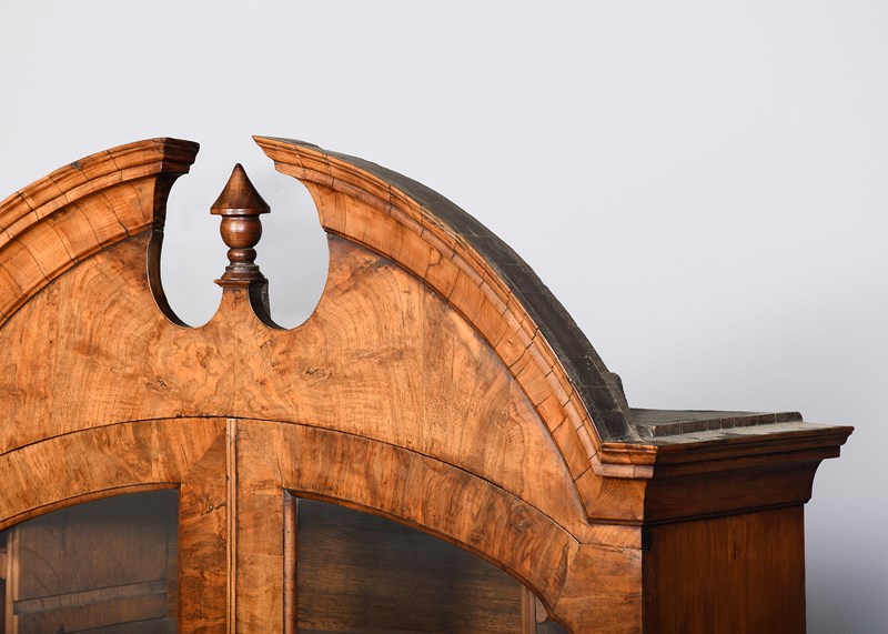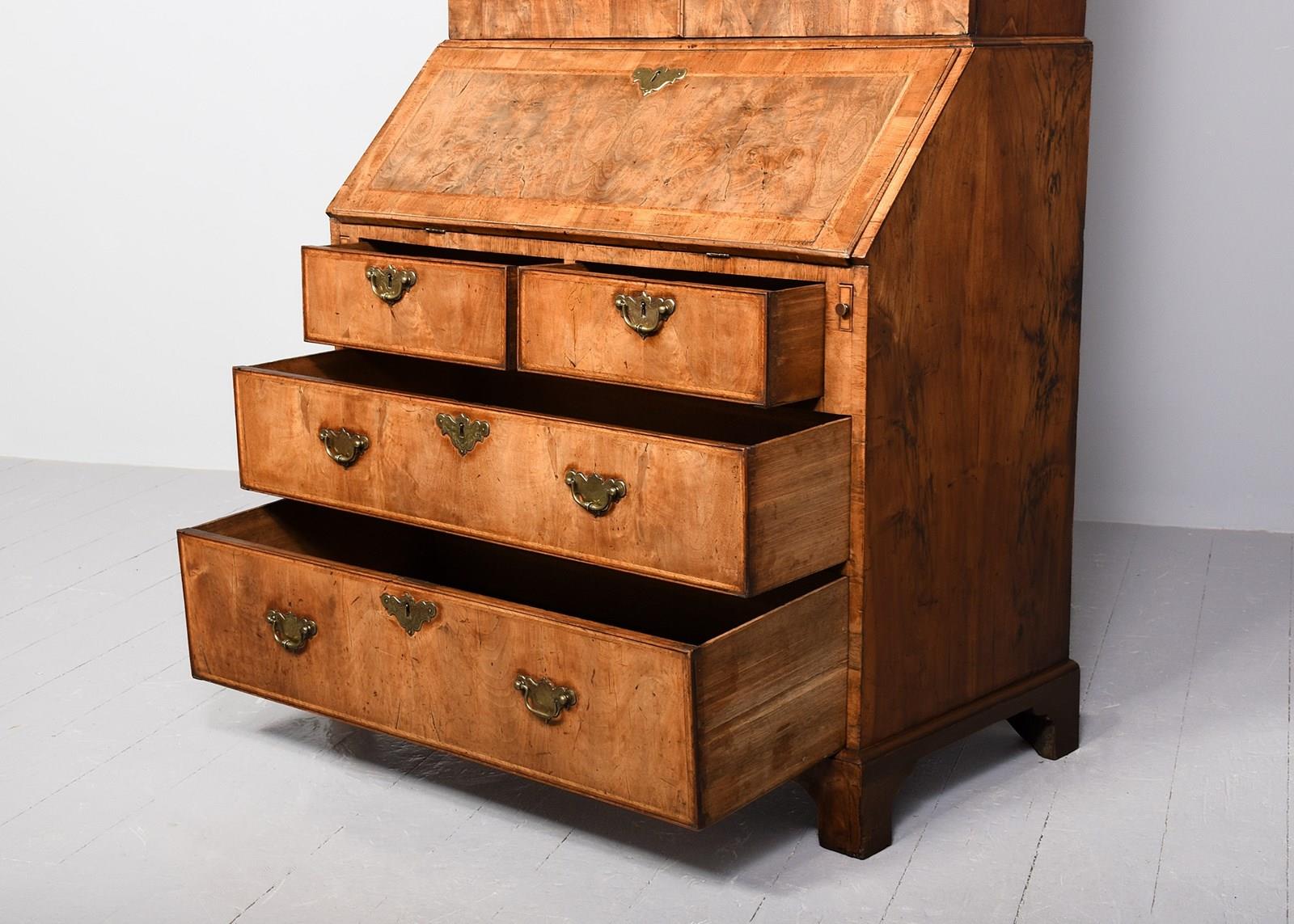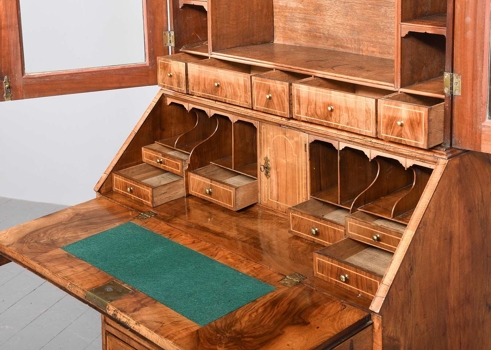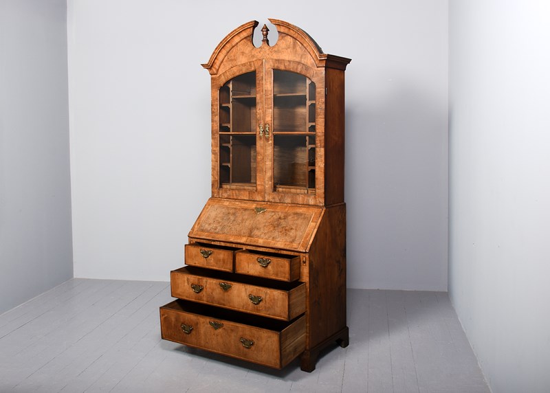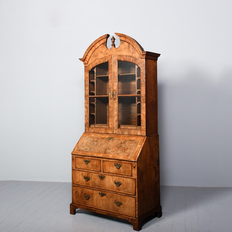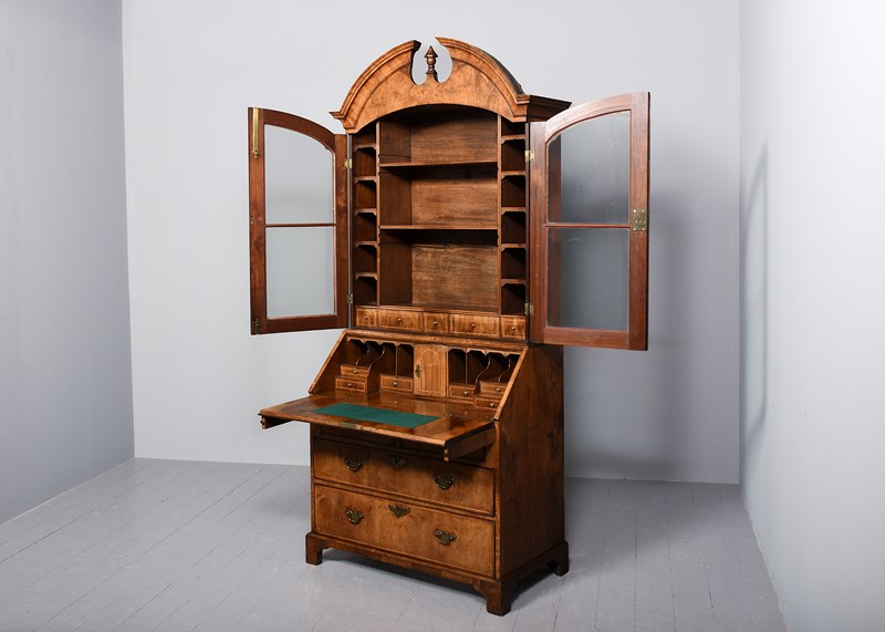 Circa 1740. A George II and later walnut cabinet bookcase, the top with a stylish architectural pediment centered with elegant finial, two glazed arch doors with simple astragals, revealing a well fitted interior with adjustable shelves, pigeon holes, and inlaid drawers, the base with herringbone banding with a burr walnut flap, opening to reveal a well-fitted interior, the writing surface with baize, with cupboard in the center with secret drawer, with various pigeon holes, drawers and a polished surface, the flap retains original engraved cast brass escutcheon, with a combination of two short over two full length drawers each with similar escutcheons and cast brass engraved back plates with elegant swan neck handles, resting on bracket feet.