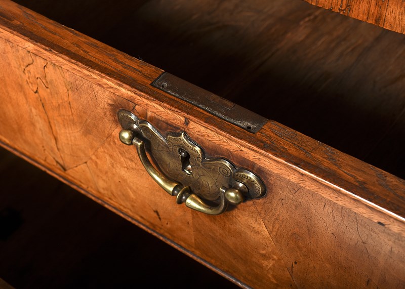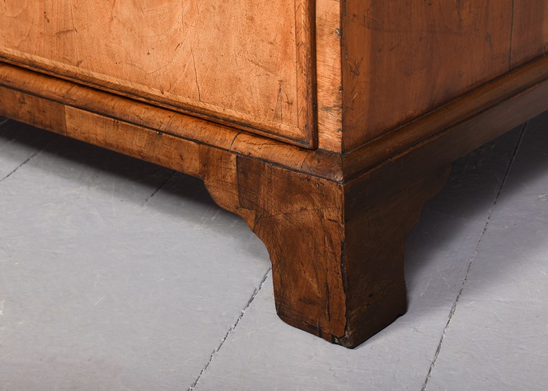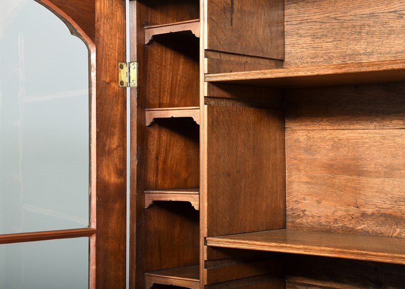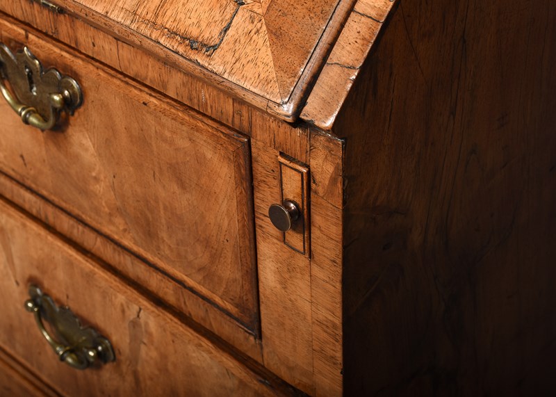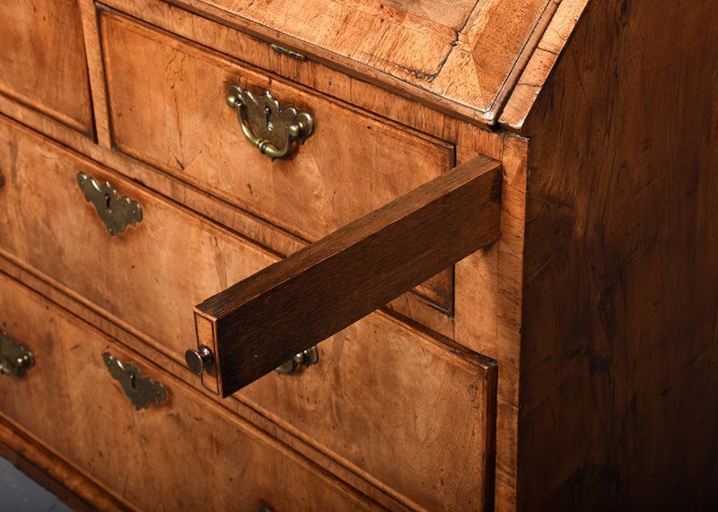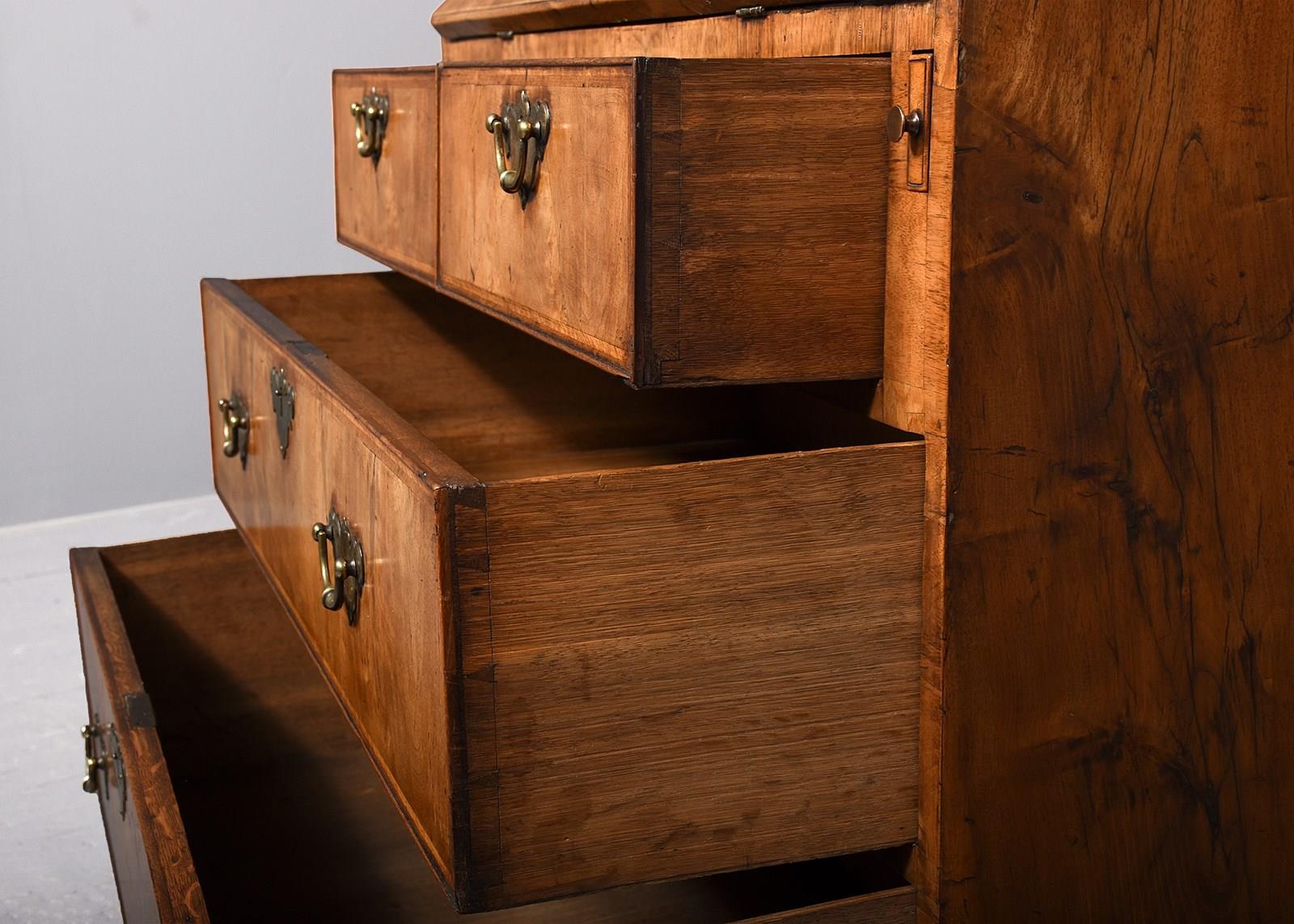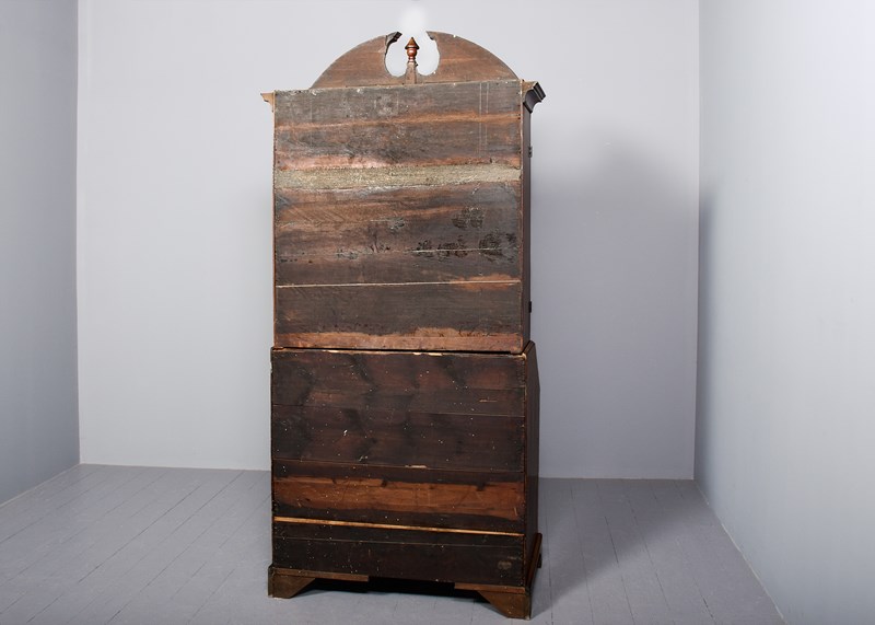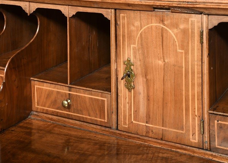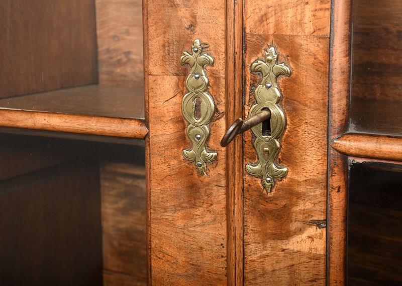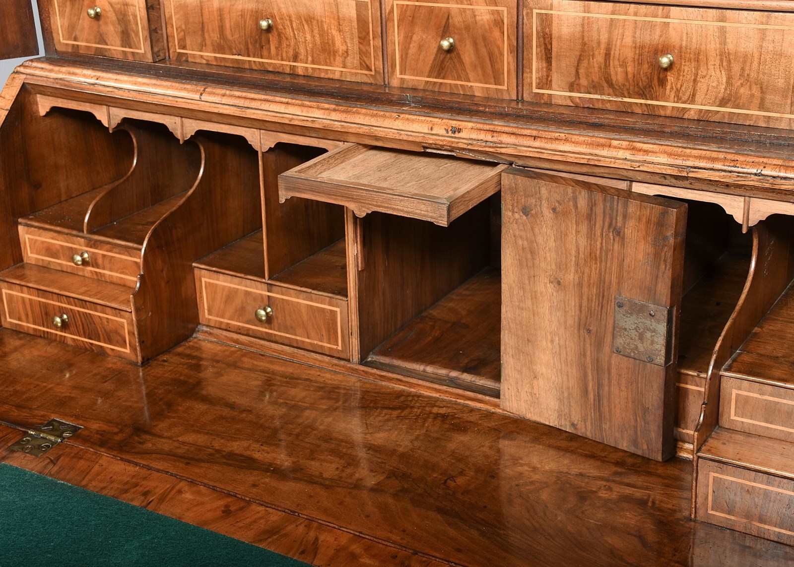Circa 1740. A George II and later walnut cabinet bookcase, the top with a stylish architectural pediment centered with elegant finial, two glazed arch doors with simple astragals, revealing a well fitted interior with adjustable shelves, pigeon holes, and inlaid drawers, the base with herringbone banding with a burr walnut flap, opening to reveal a well-fitted interior, the writing surface with baize, with cupboard in the center with secret drawer, with various pigeon holes, drawers and a polished surface, the flap retains original engraved cast brass escutcheon, with a combination of two short over two full length drawers each with similar escutcheons and cast brass engraved back plates with elegant swan neck handles, resting on bracket feet.