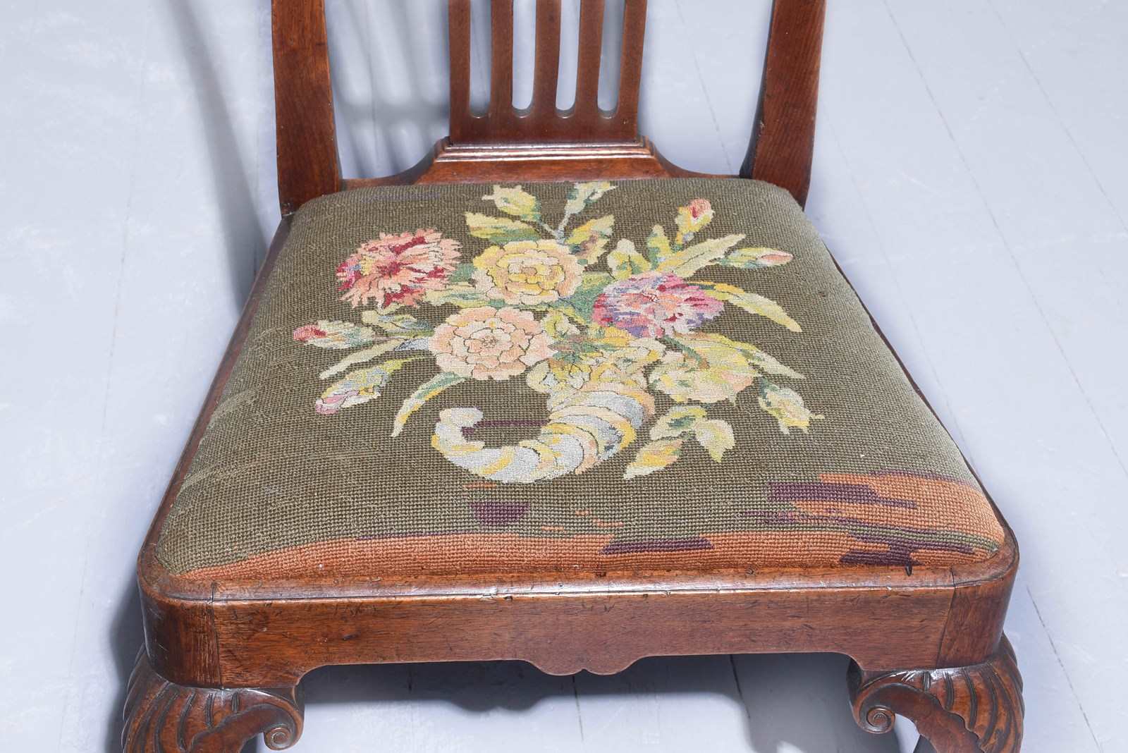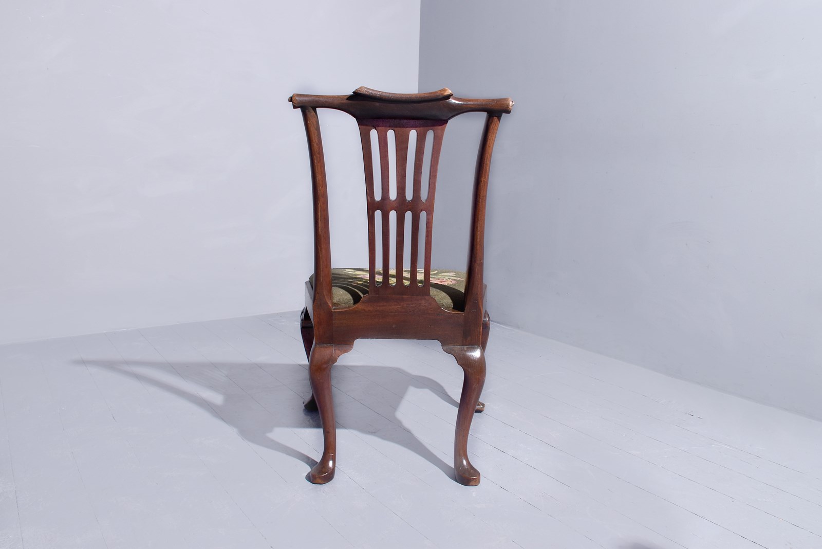 Circa 1740. A quality George II walnut hand chair, the shaped cresting rail with paper fold to the top and sides, with a pierced tapering splat, with a drop in seat with hand stitched needle point upholstery and a simple chair rail, shaped on the front, the visible peg joints on front and sides, the cabriole back legs with quarter blocks finishing on a stylish pad foot, the elegant front legs with foliate carving on the knees and quarter blocks finishing on a very stylish foot.