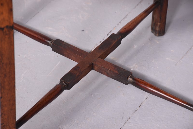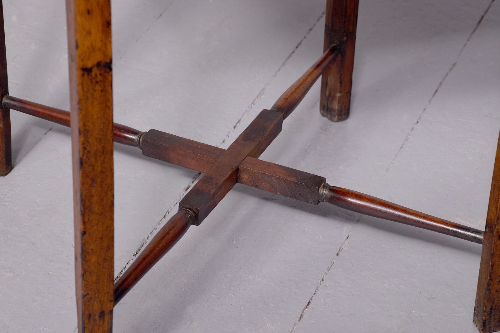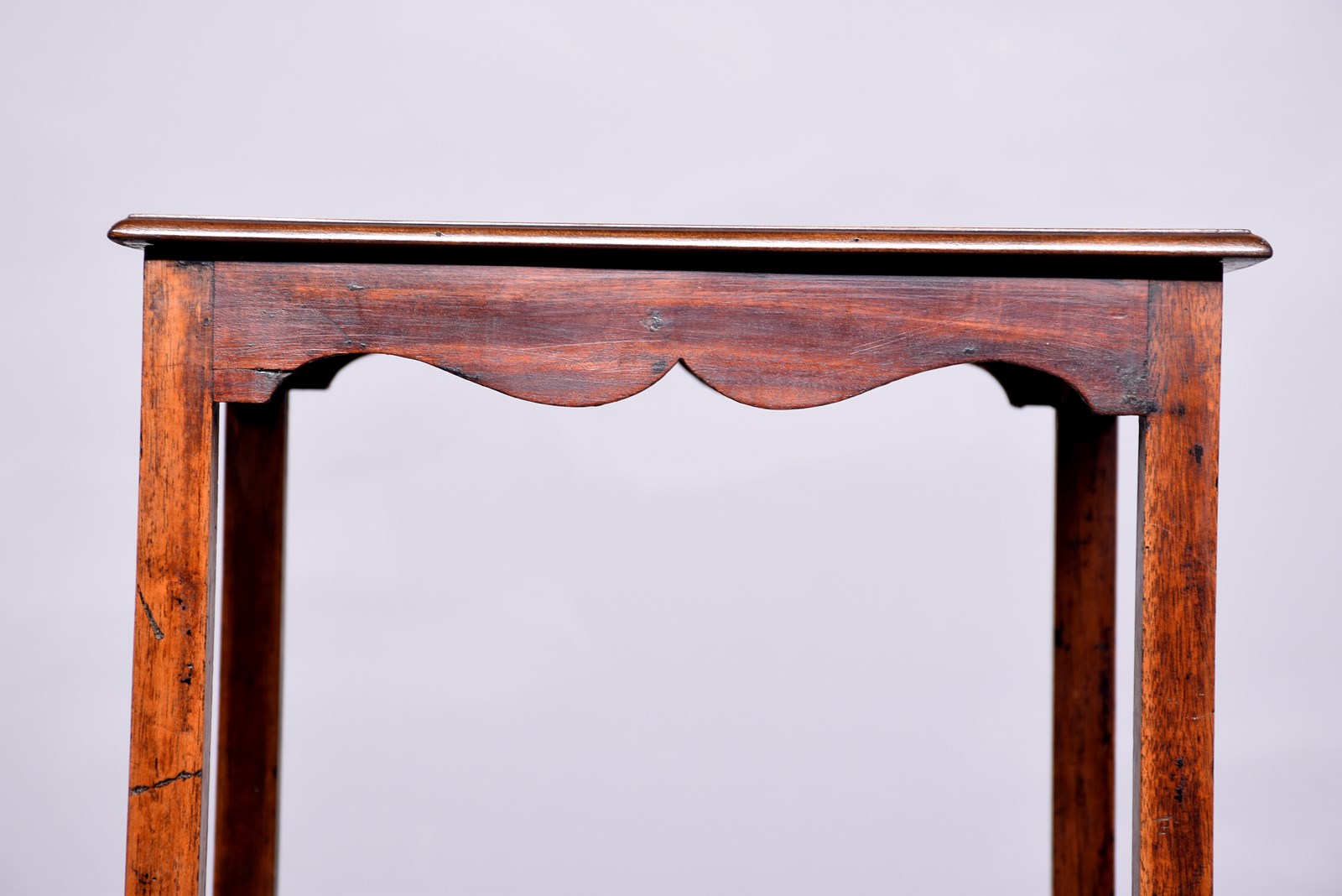 Circa 1780 George III mahogany 2 tier occasional table/stand. The square polished top with moulded edges and wavey frieze below above further mahogany shelf and square legs tapering down with turned cross stretchers.