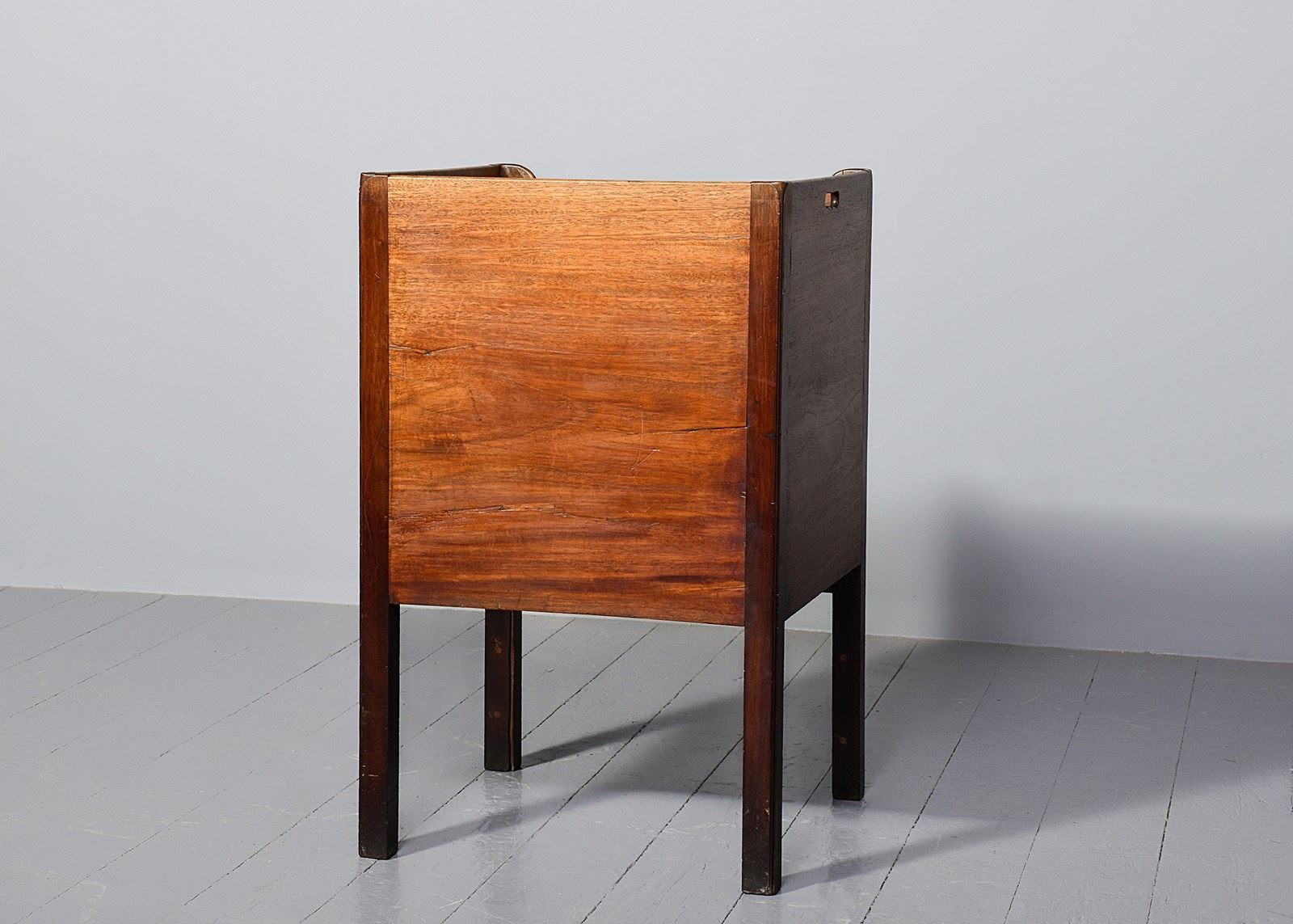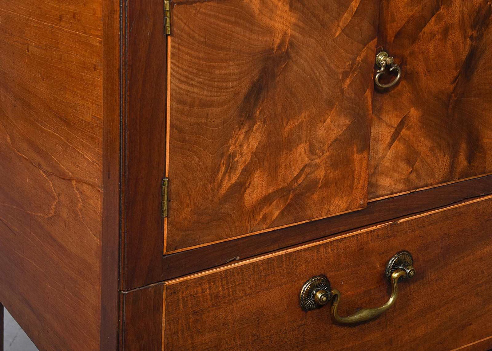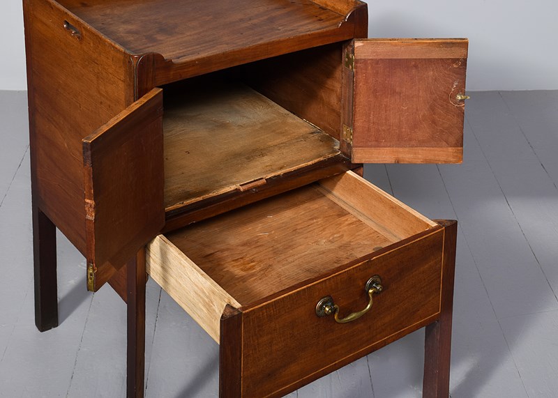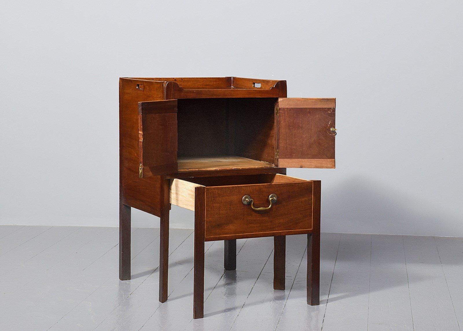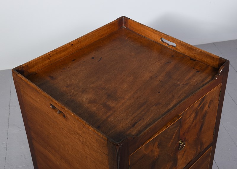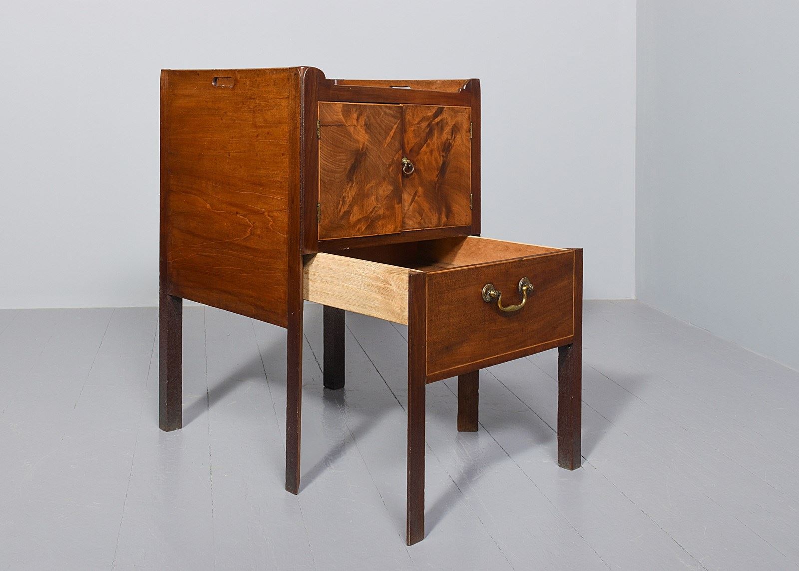Circa 1770. A late George III mahogany bedside cabinet of generous proportions (with adaptions), the three-quarter gallery with pierced lifting handles to the side and shaped and dipped to the front, with a pair of flame mahogany doors beneath with an elegant axe-head cast brass handle, opening to an uninterrupted interior, beneath a shallow drawer with a cast brass swan neck handle, all resting on four square legs with the front legs in two sections to support the drawer.