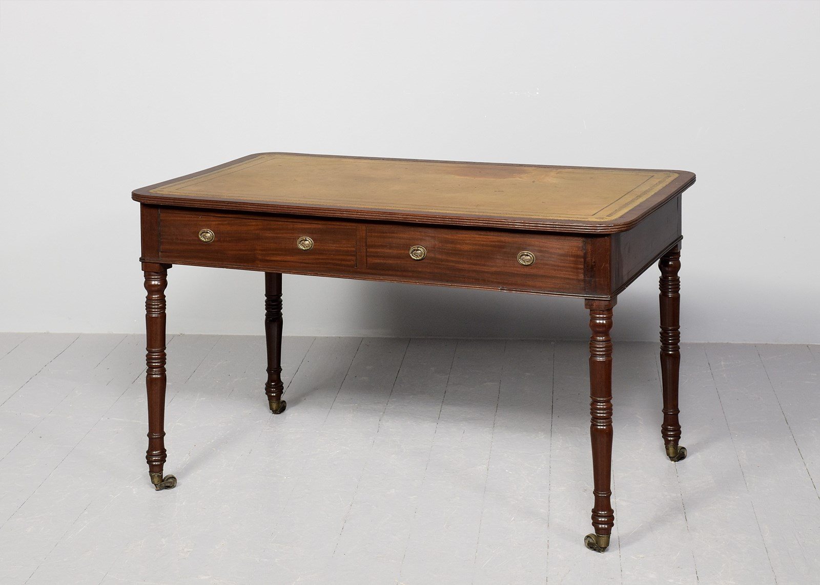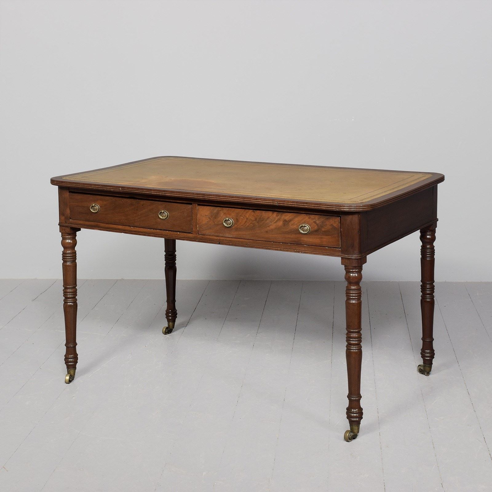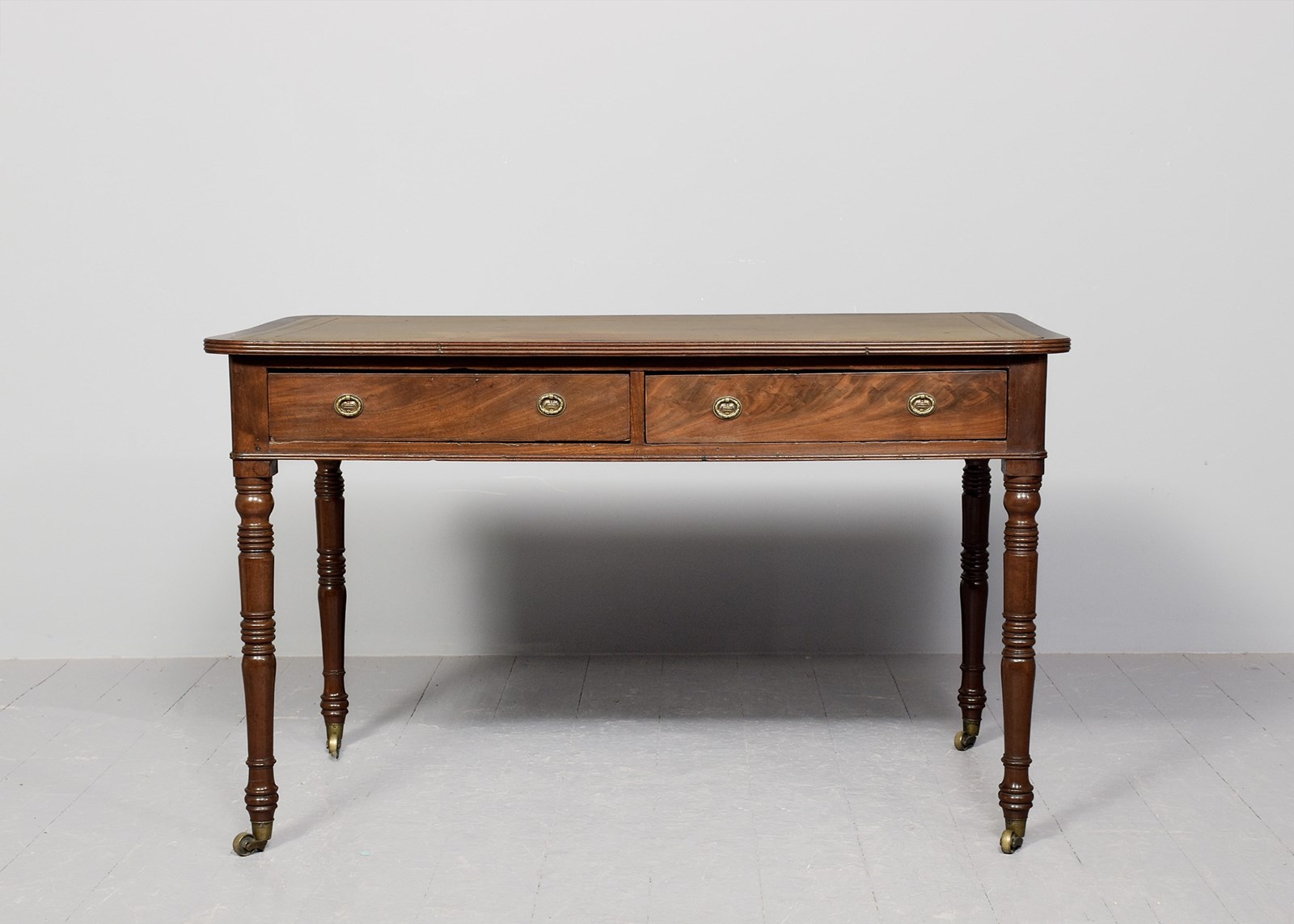 Circa 1800. A late George III mahogany two drawer library table, the top with insert tooled and gilded leather, banding and a stylish ribbed fore-edge, the frieze with two long drawers in flame mahogany with brass back plates and stylish decorated pulls, the back with two faux drawers, beneath the drawers is the double beading, resting on four elegant ring turned and tapering legs, finishing with a brass cup and the original brass castors beneath.