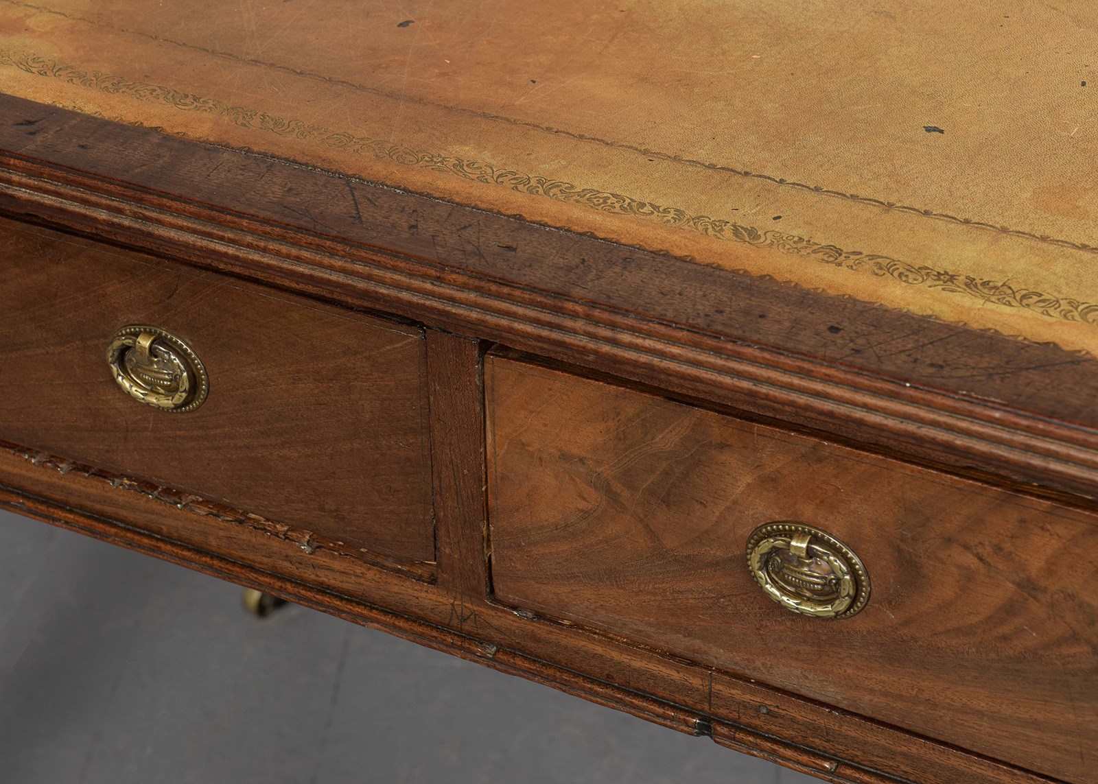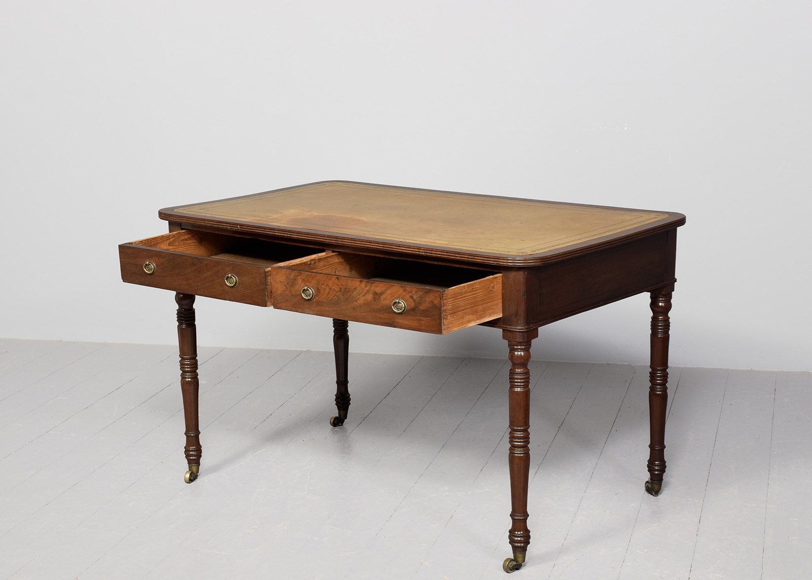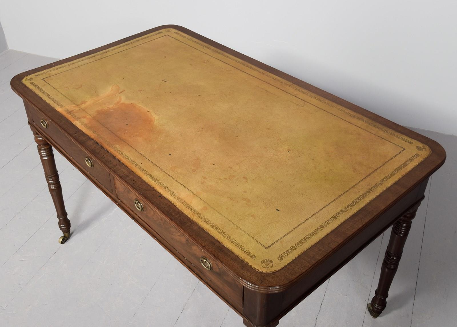 Circa 1800. A late George III mahogany two drawer library table, the top with insert tooled and gilded leather, banding and a stylish ribbed fore-edge, the frieze with two long drawers in flame mahogany with brass back plates and stylish decorated pulls, the back with two faux drawers, beneath the drawers is the double beading, resting on four elegant ring turned and tapering legs, finishing with a brass cup and the original brass castors beneath.