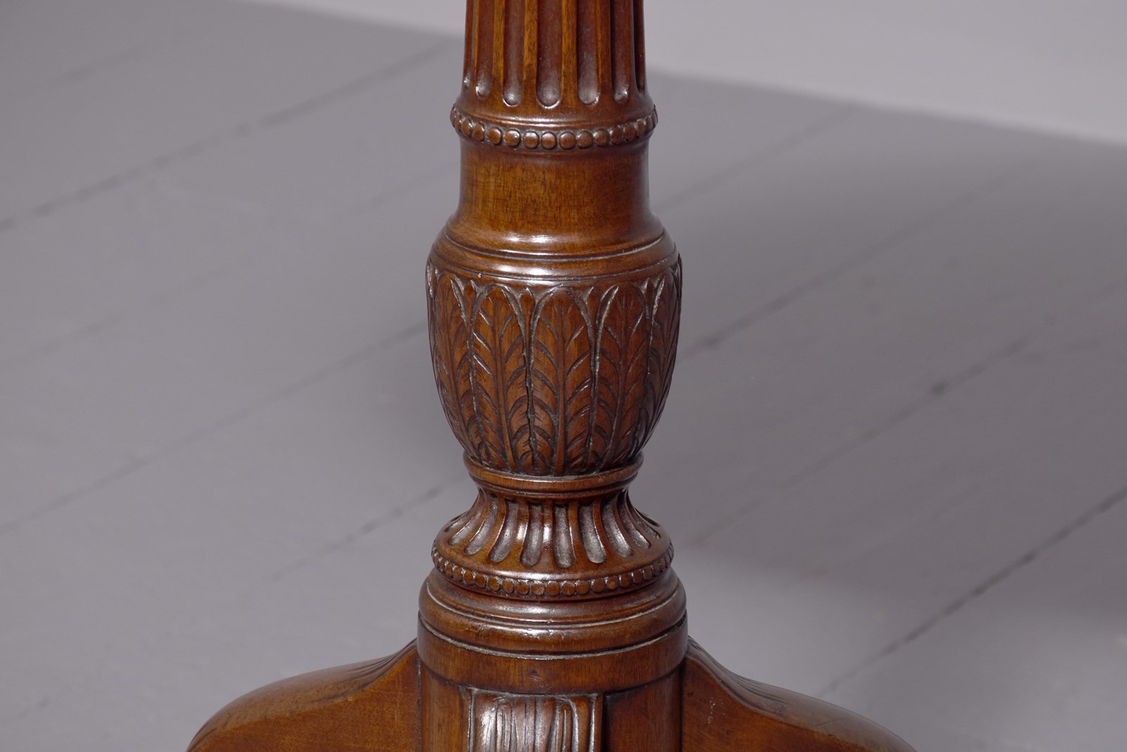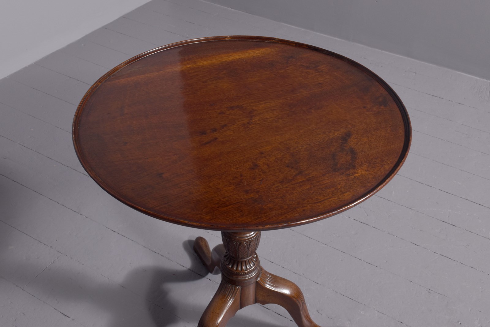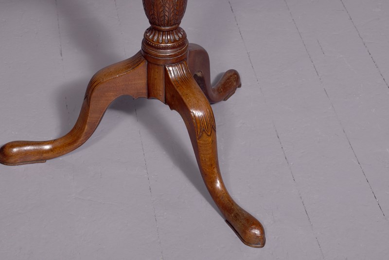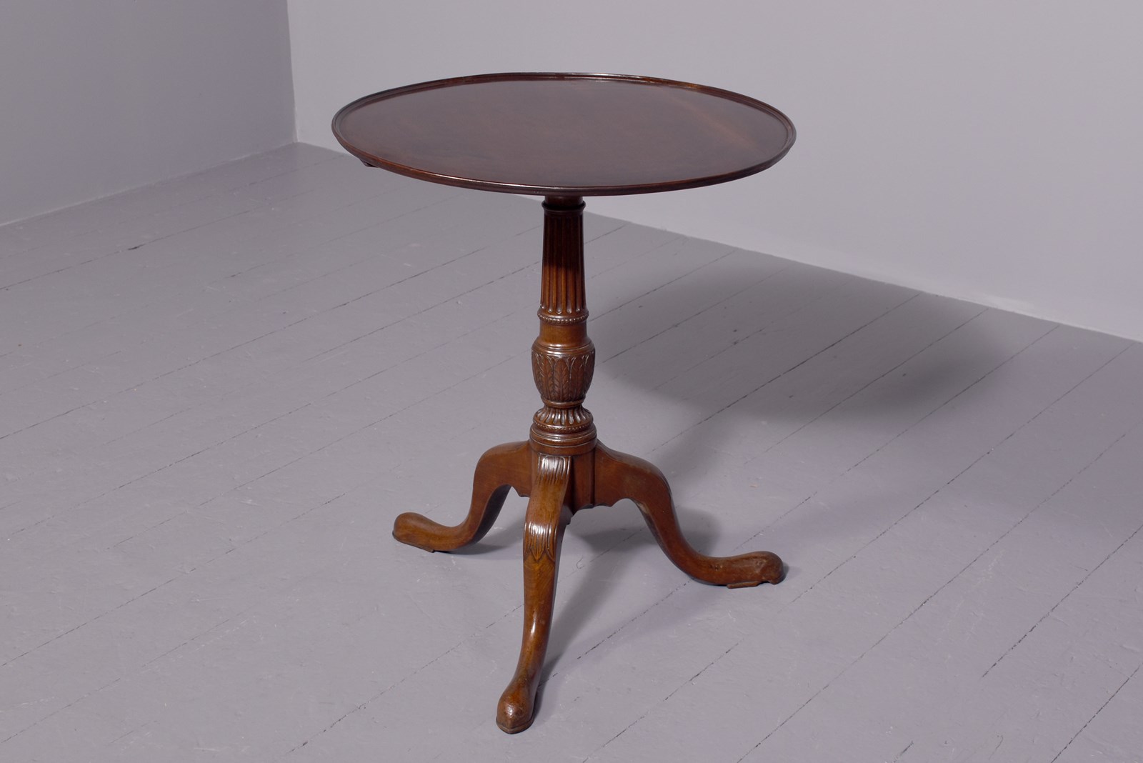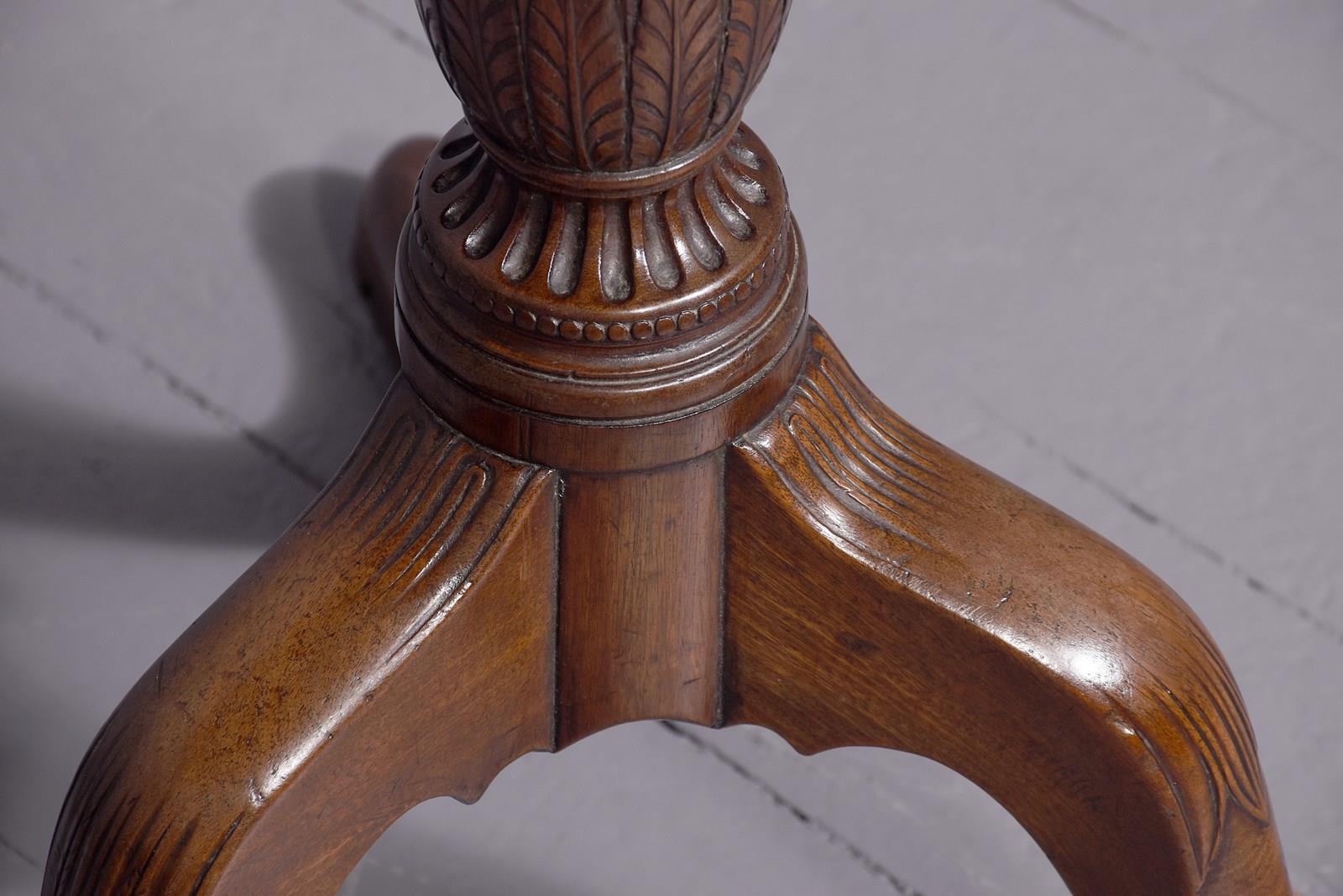 Circa 1800 and later, a stylish circular George III occasional table, the solid top with raised lip, resting on a classic stem – fluted, carved, turned with a stylish urn with foliate carving and a flared base, issuing three carved hipped cabriole legs finishing on an extended pad foot.