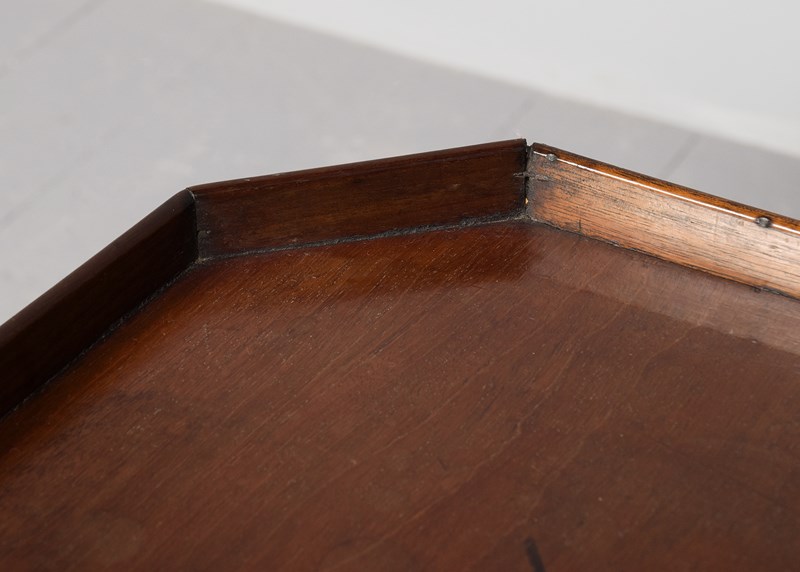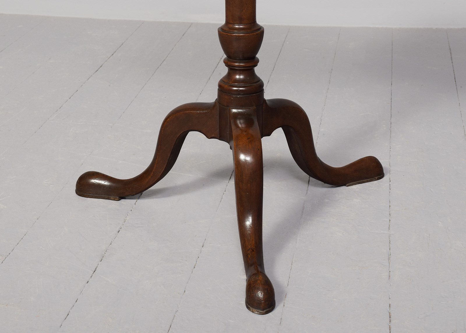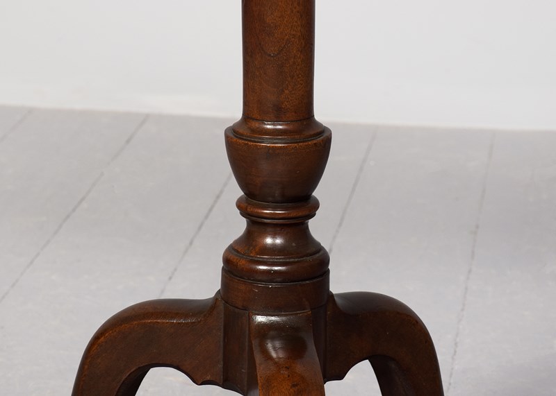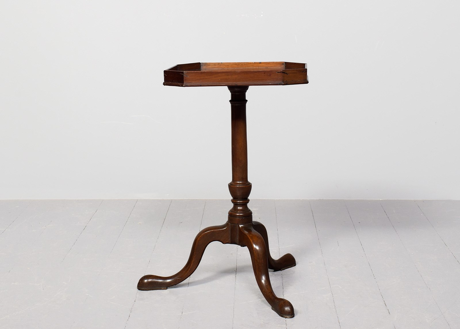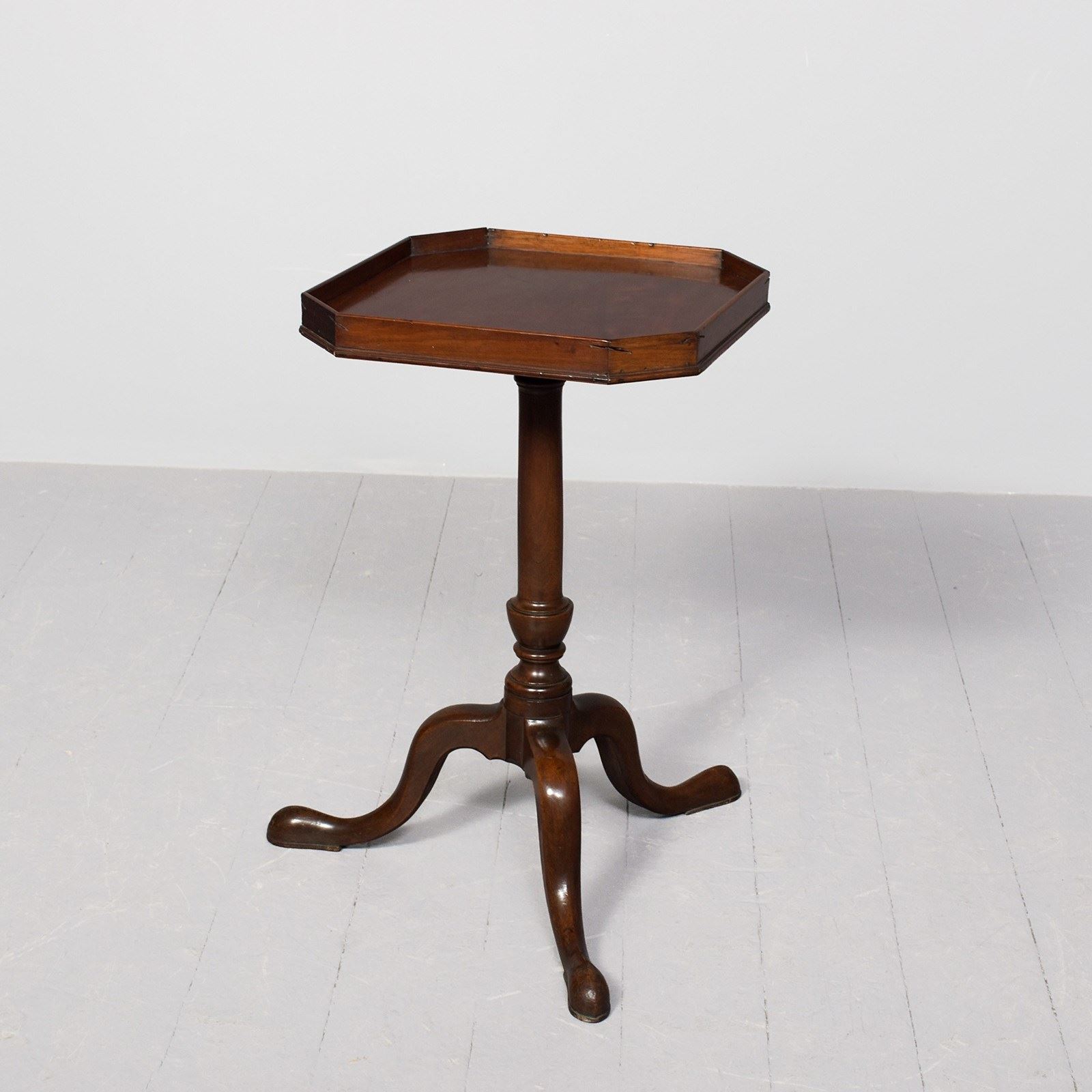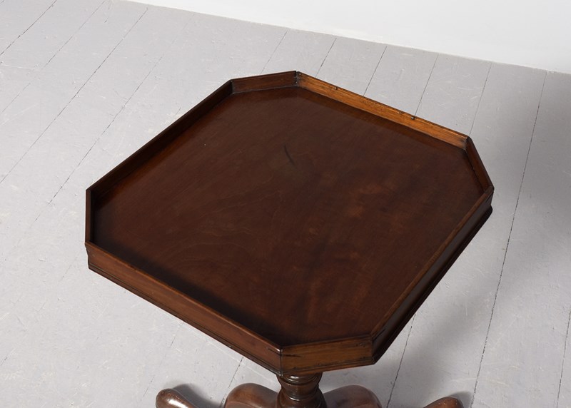 Circa 1760. An early George III mahogany occasional table, the top in finely figured mahogany with canted corners and wrap-around gallery, supported on elegant canon barrel stem with an urn shape towards the base, issuing three cabriole legs finishing on an extended pad foot.