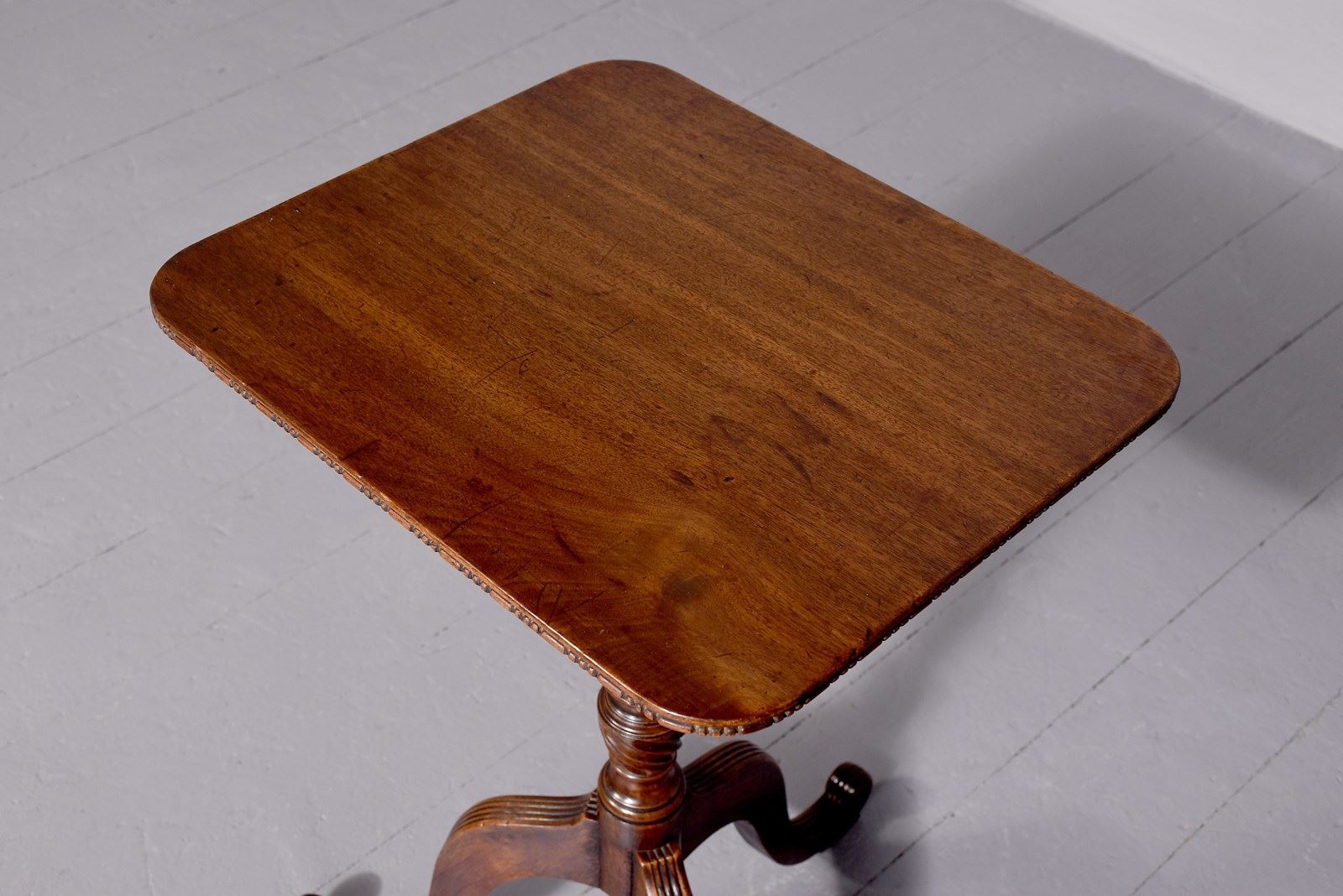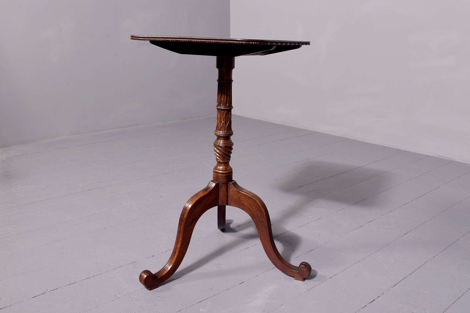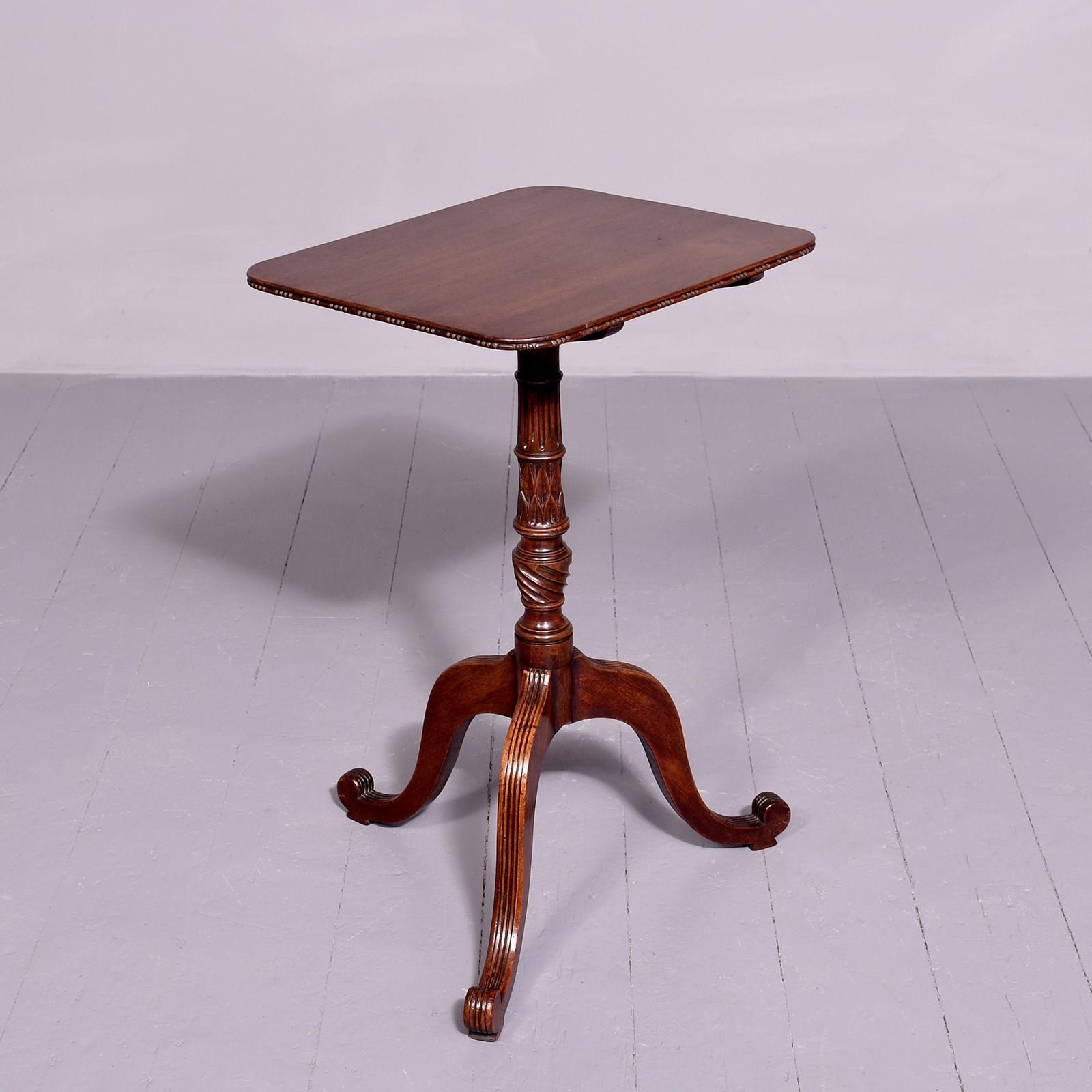 Circa 1800. A late George III mahogany rectangular snap top occasional table, the very fine thin top with a rounded moulded fore-edge with an egg and dart pattern beneath, the top retains its original brass clasp and block, resting on a stylish stem which includes reeding, foliate carving and a twisted urn, issuing 3 hipped and ribbed cabriole legs finishing on a curled toe with a small block beneath. The table is in excellent condition and has lovely patination.