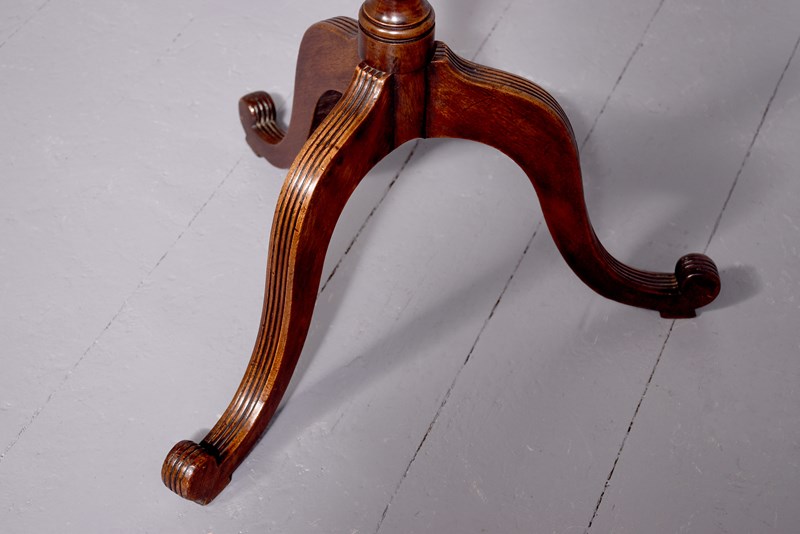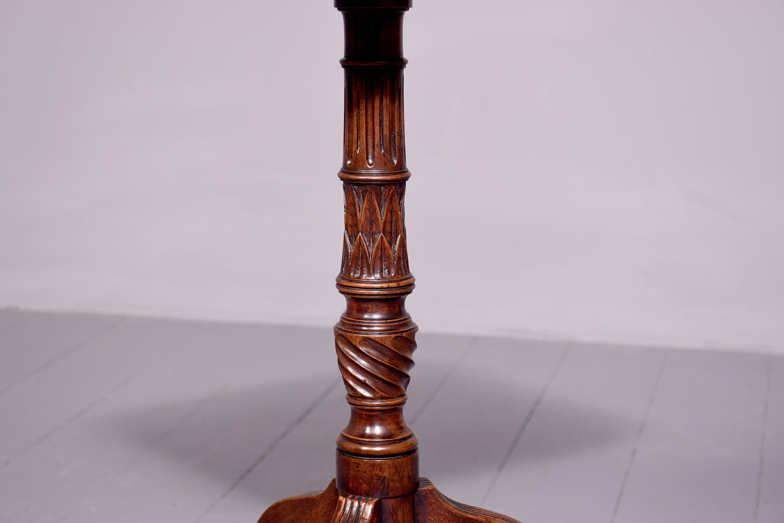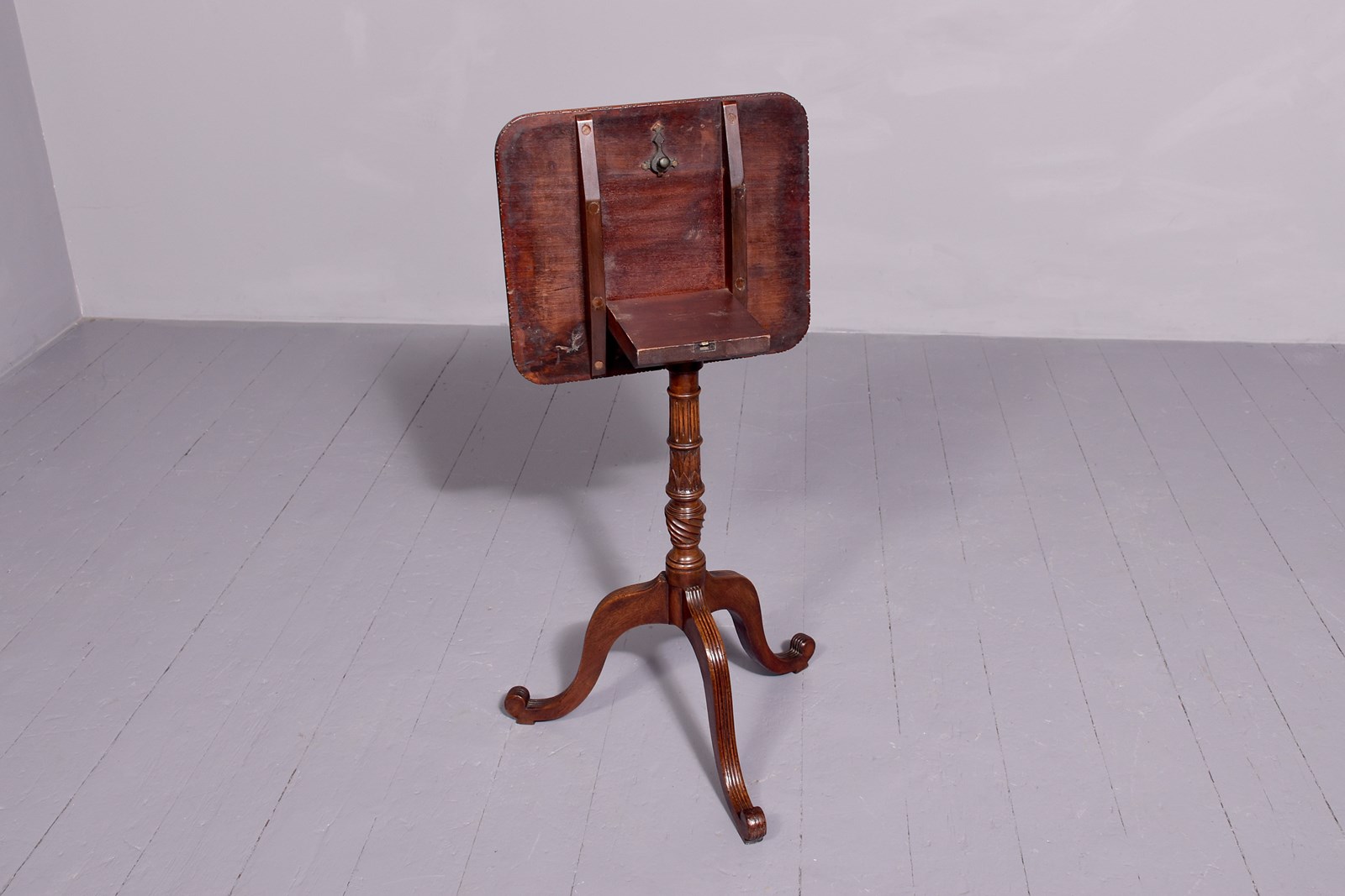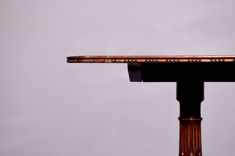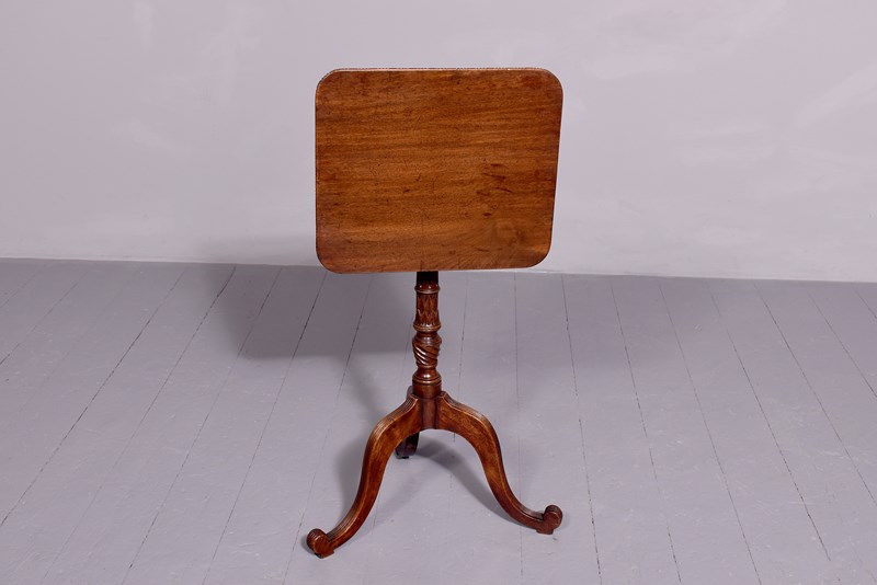 Circa 1800. A late George III mahogany rectangular snap top occasional table, the very fine thin top with a rounded moulded fore-edge with an egg and dart pattern beneath, the top retains its original brass clasp and block, resting on a stylish stem which includes reeding, foliate carving and a twisted urn, issuing 3 hipped and ribbed cabriole legs finishing on a curled toe with a small block beneath. The table is in excellent condition and has lovely patination.