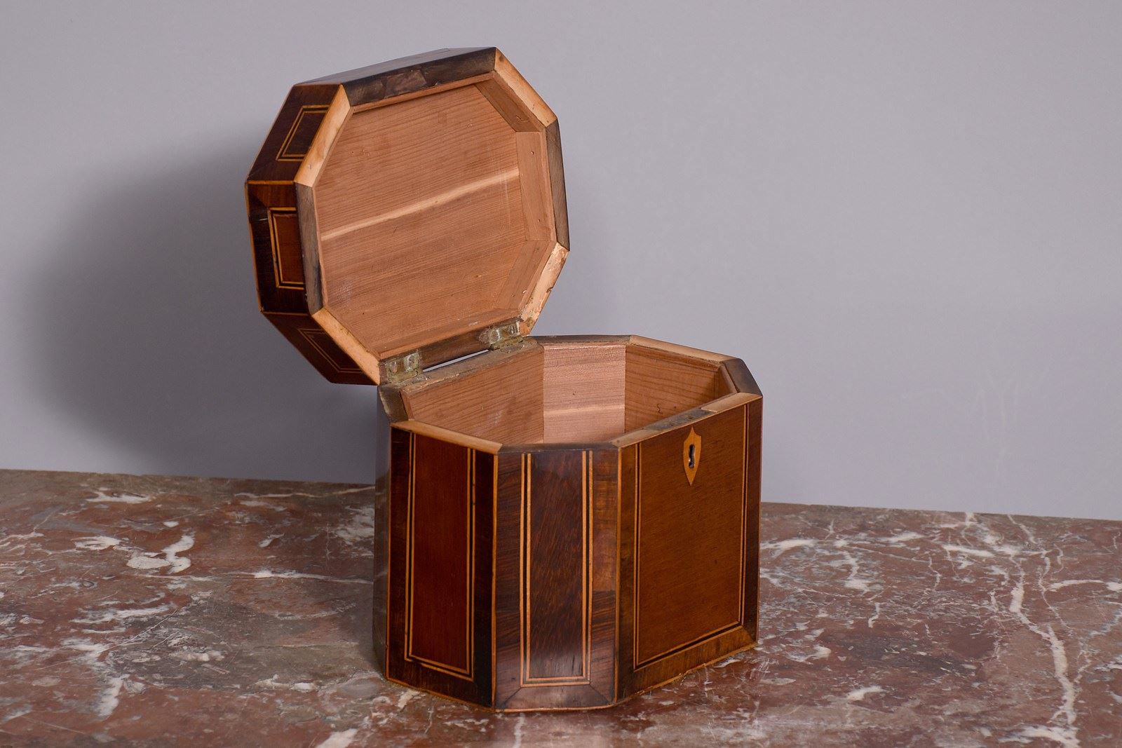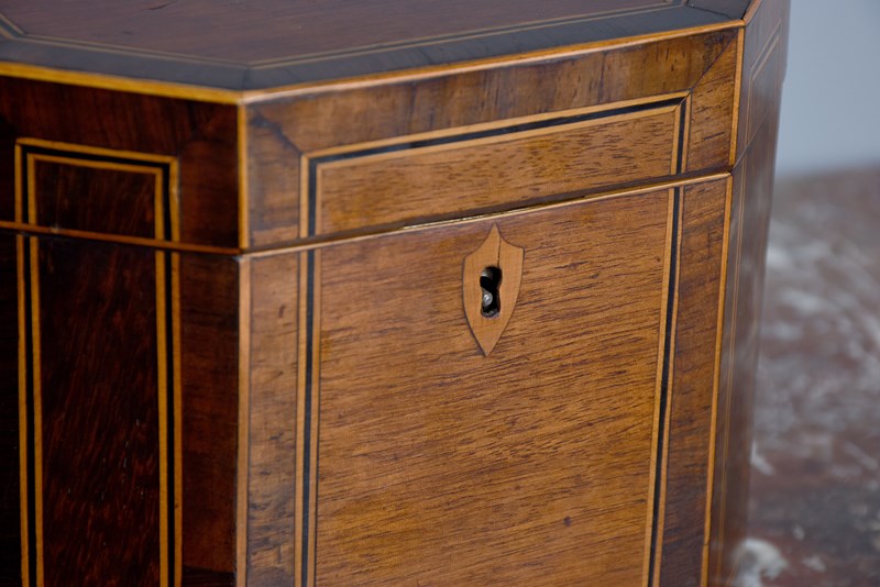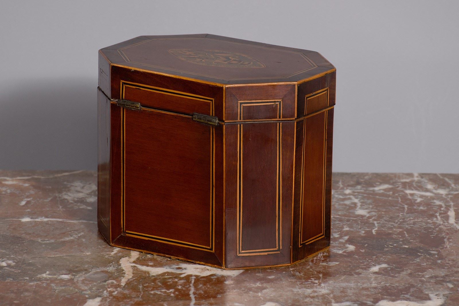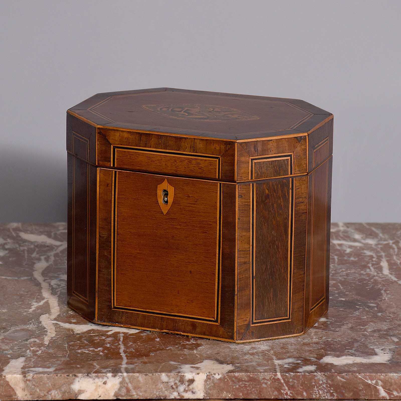 Circa 1800. A large George III mahogany and inlaid tea caddy, the oblong octagonal shaped caddy with oval shell inlay at the top, broad banding in boxwood, ebony and rosewood, the deep hinge lid opens to reveal and uninterrupted interior, the front with a heraldic shaped escutcheon and cross banding and inlay on all sides, the underside with felt protection.