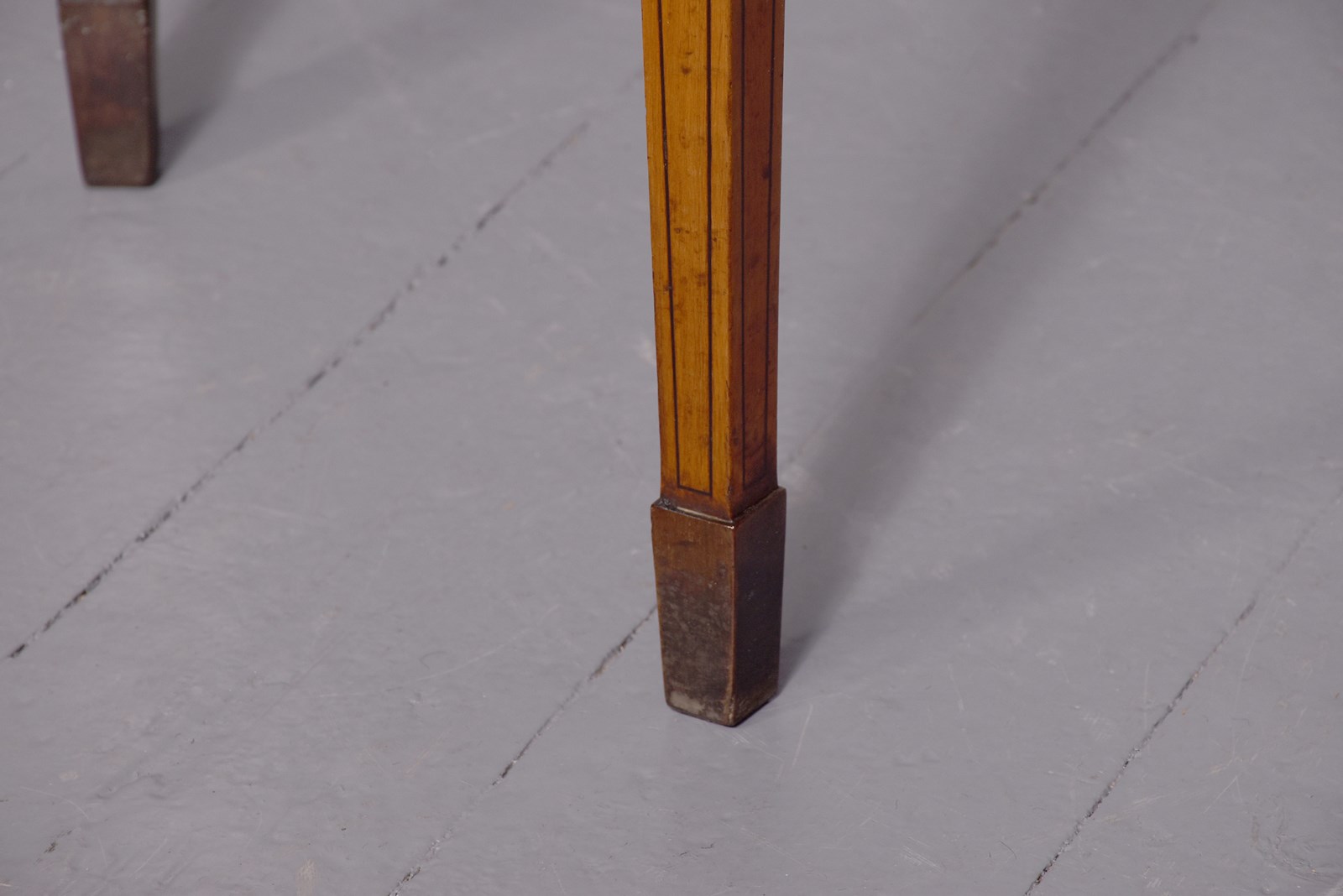 Circa 1790. A late George III satinwood and painted demi lune fold over card table, the top in silky satinwood with a painted classical scene of Greek goddesses, the border with foliate painted pattern in rosewood with boxwood banding, the hinged top opens to reveal a crossbanded and felt lined interior, the back legs are hinged and swing out to support the table when open, the frieze with inlay on the top and bottom, resting on four square tapering legs with raised panels above the legs with a small gothic arch beneath, with string inlay on all sides finishing on an extended splayed toe.