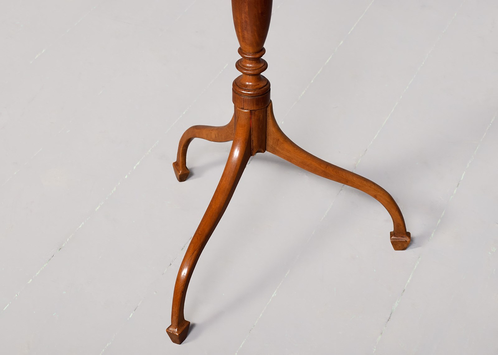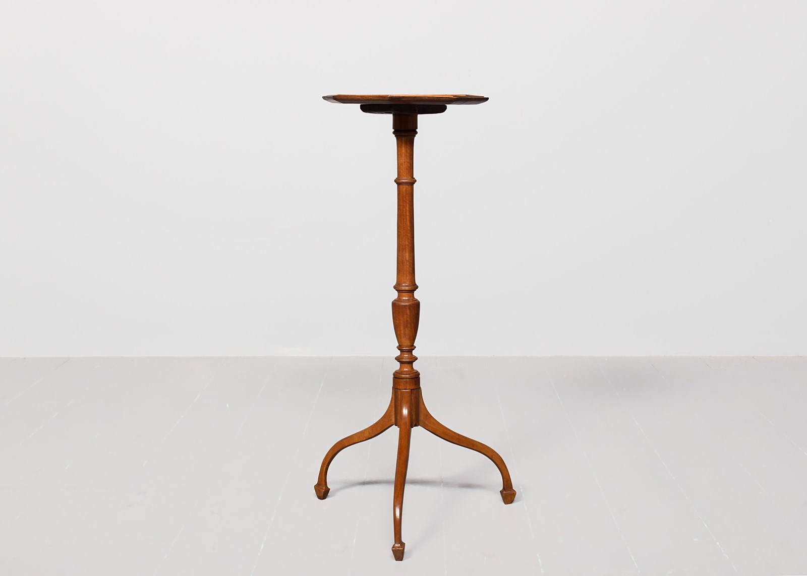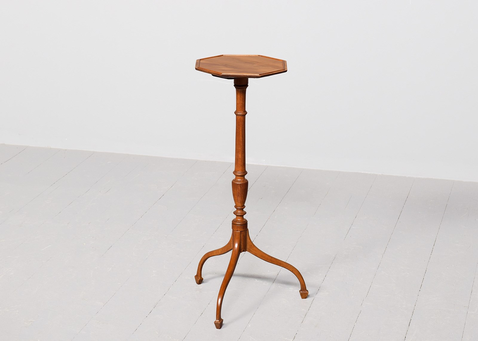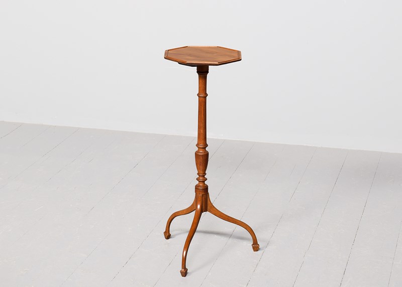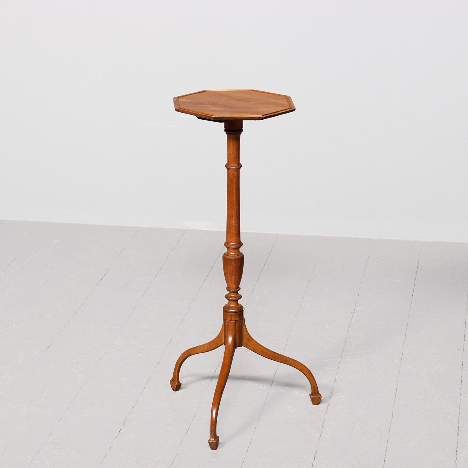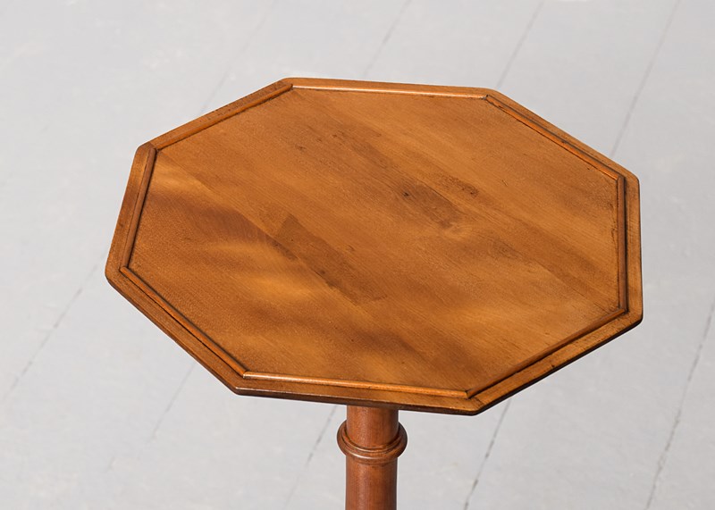 Circa 1900. A stylish George III-style octagonal satinwood occasional table, the top in wonderful, figured satinwood with a small raised beaded section, resting on an elongated turned stem with urn shapes towards the base, issuing three downward-facing cabriole legs finishing on a tapering spay toe.