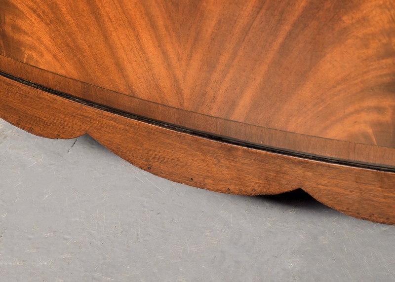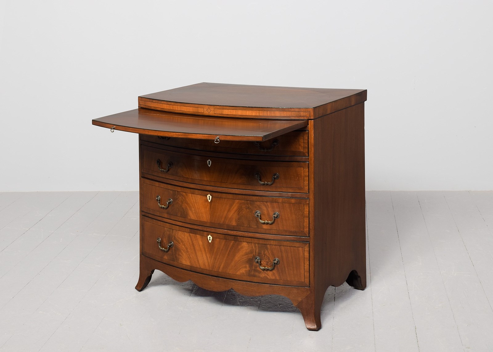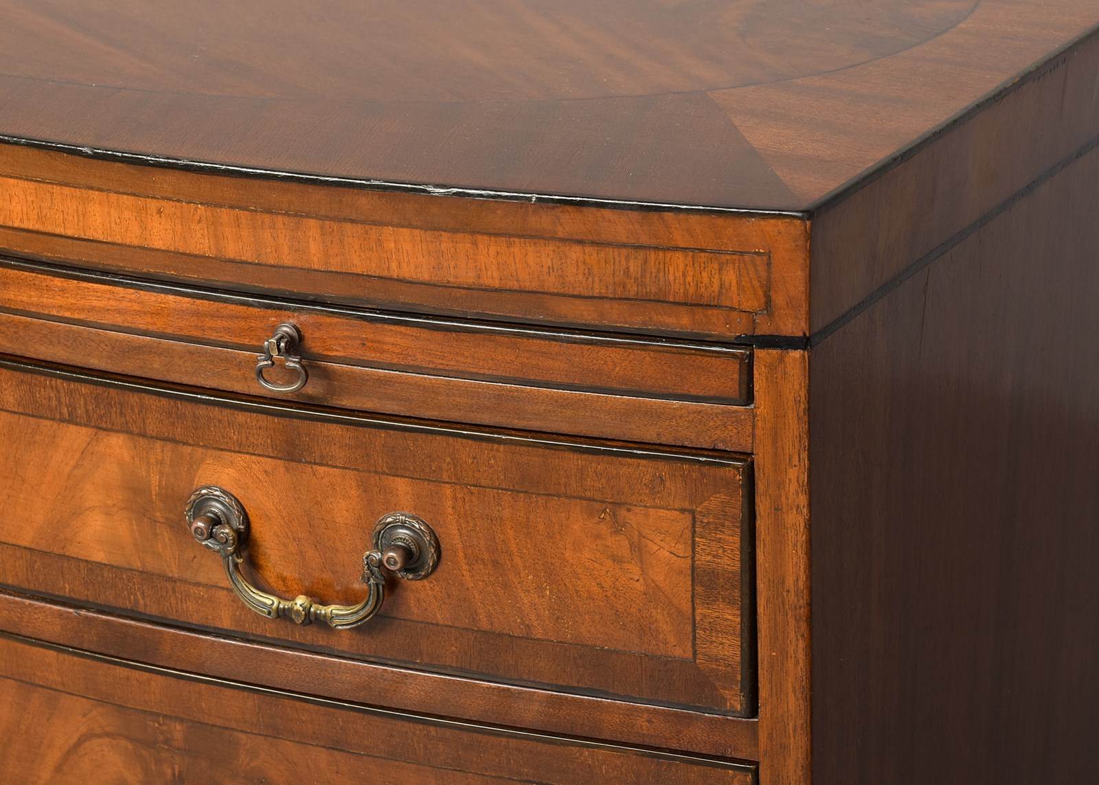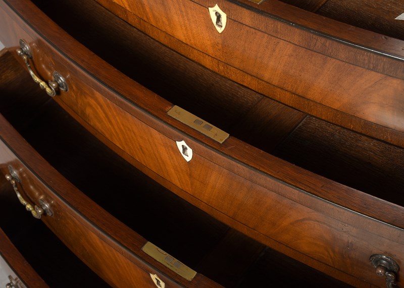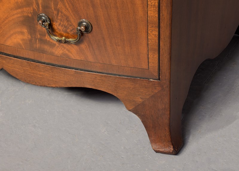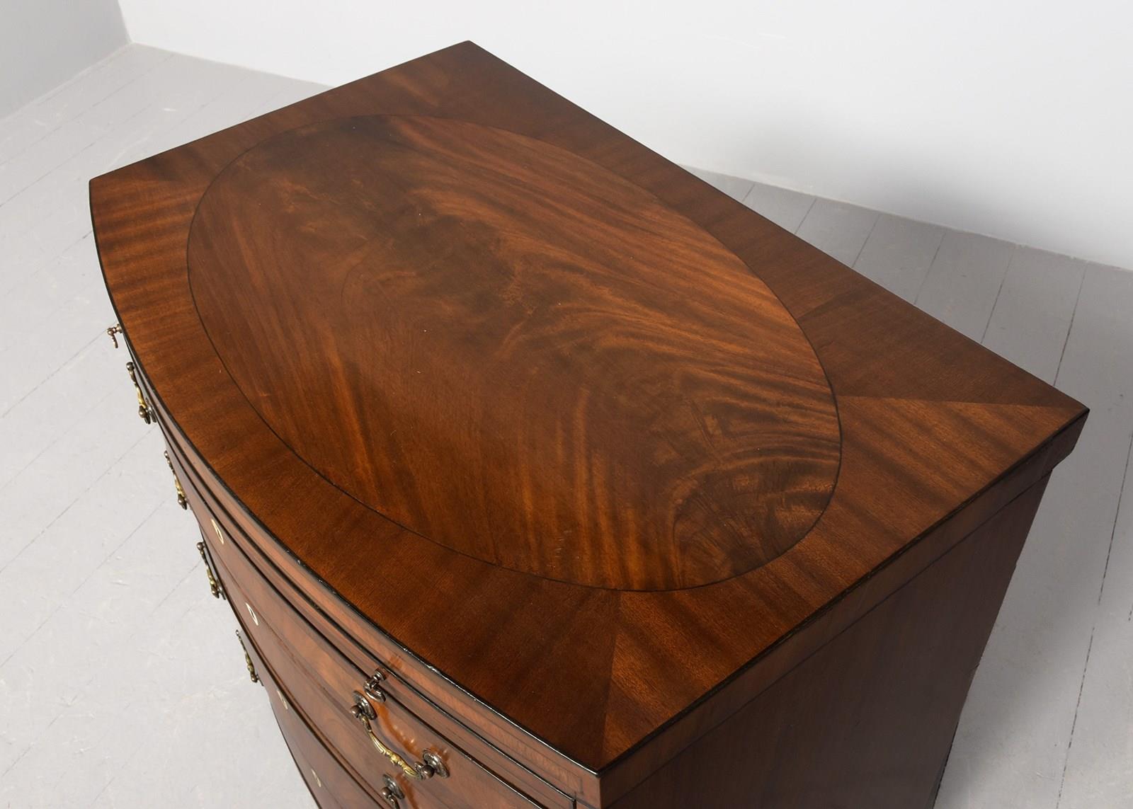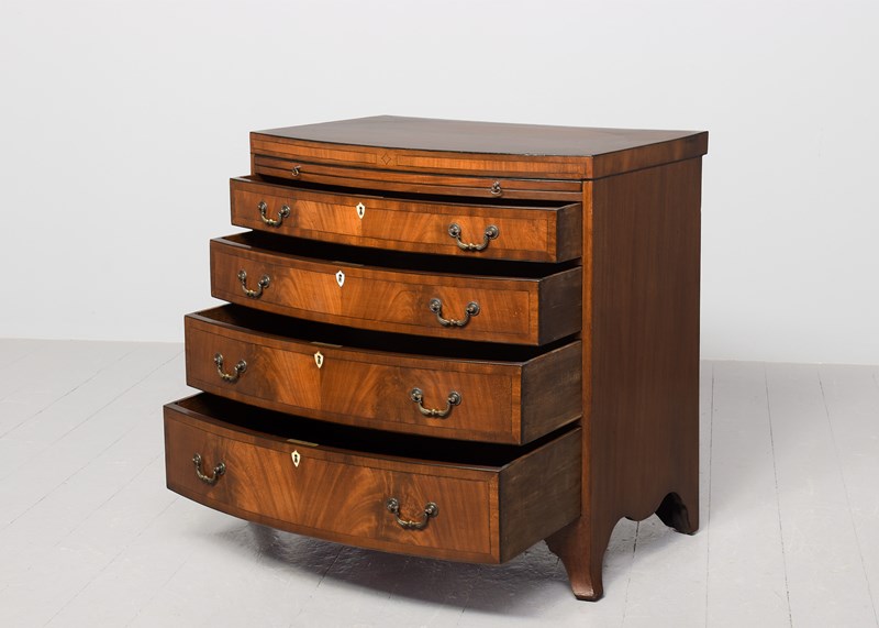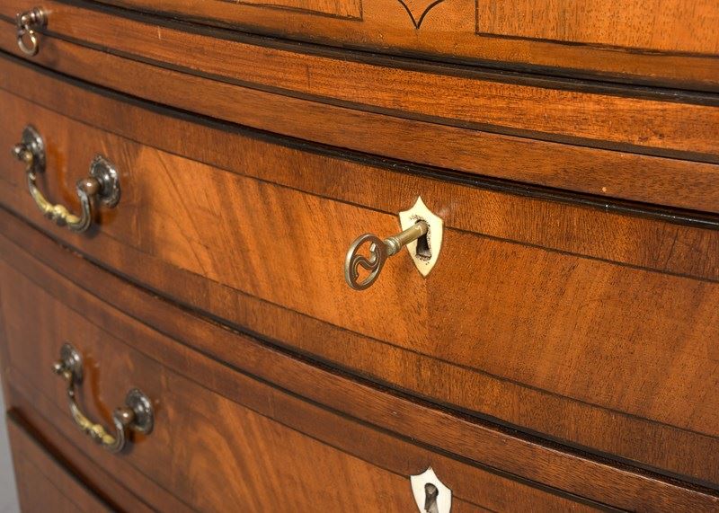 Circa 1880. A George III style bow fronted and inlaid chest of drawers, the top in finely figured mahogany framed in an oval panel of ebony string inlay, all of the fore-edges with ebony string inlay, with a simple inlaid frieze with a pull-out slide beneath, with four full-length bow fronted graduated drawers, each with flame facings, crossbanding, heraldic ivory escutcheons and cast brass swan neck handles, beneath the bottom drawer there is a shaped frieze on the front and sides, all resting on four squat French bracket feet.
