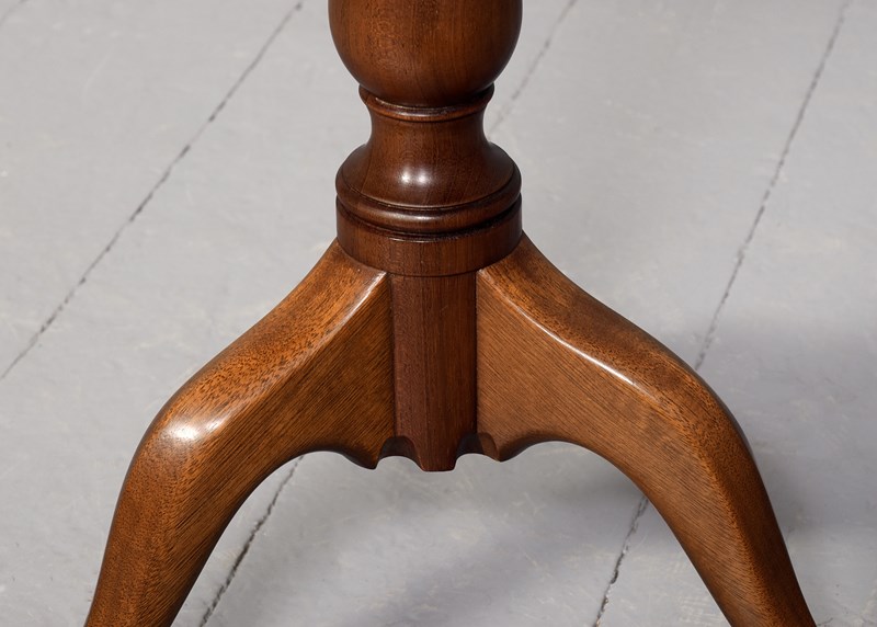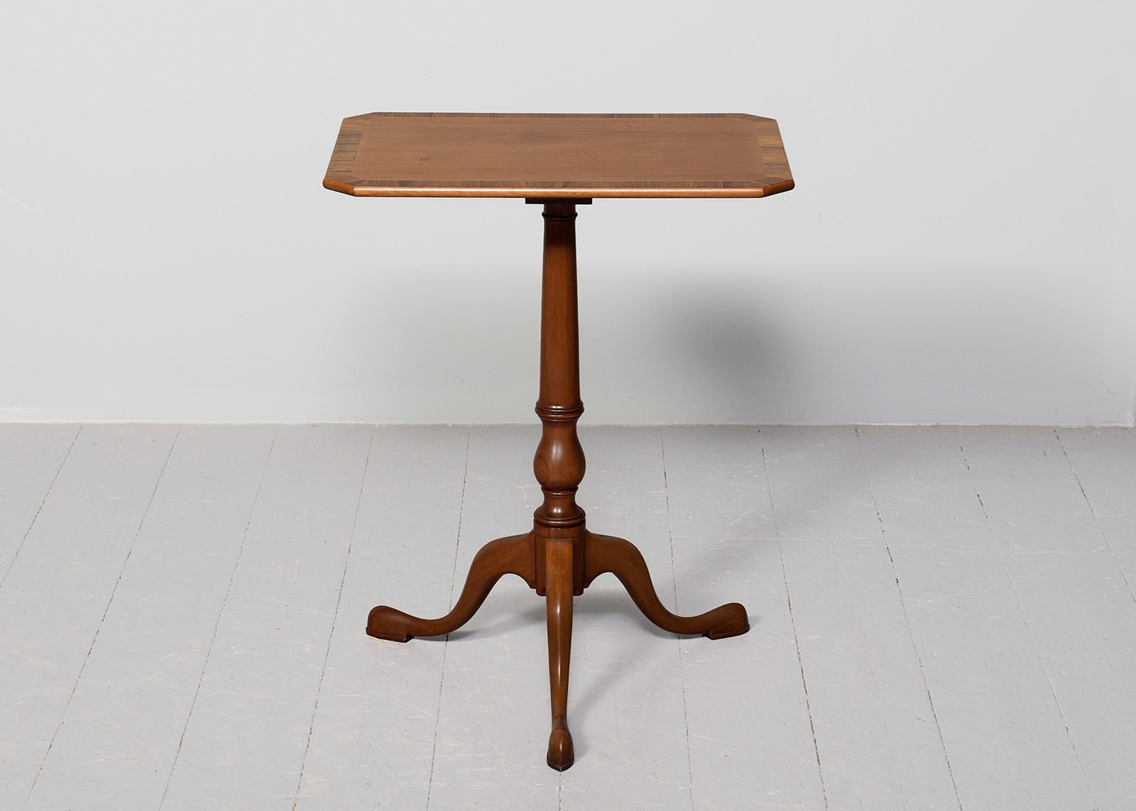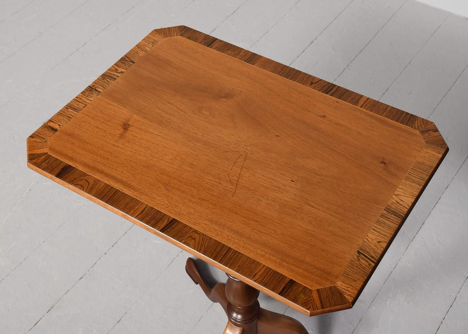 Circa 1900. A stylish George III style mahogany and rosewood banded occasional table, the rectangular top with canted corners with string inlay and broad rosewood crossbanding, with simple rounded fore-edge, resting on a classic cannon barrel stem with urn shape towards the base, issuing three hipped cabriole legs and finishing on an elegant extended foot, to the underside of the top there’s a makers label ‘Redman and Hales Ltd, Hatfield, Chelmsford, Essex’, the neat size table has great colour and style.