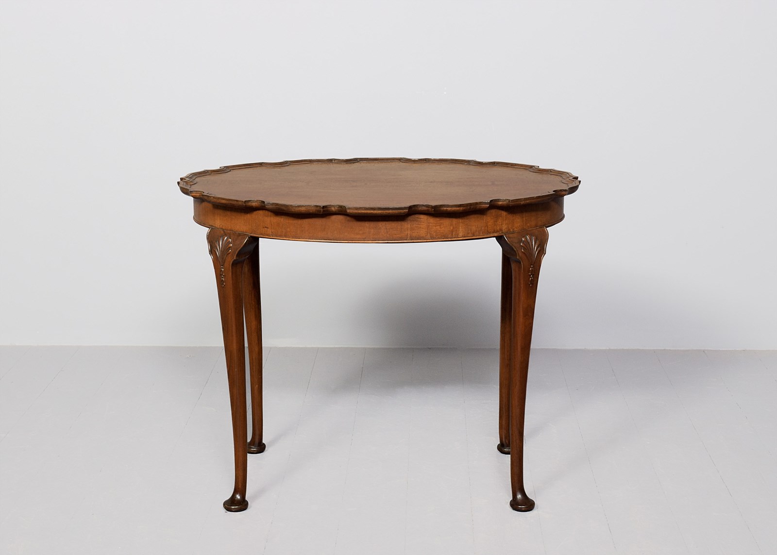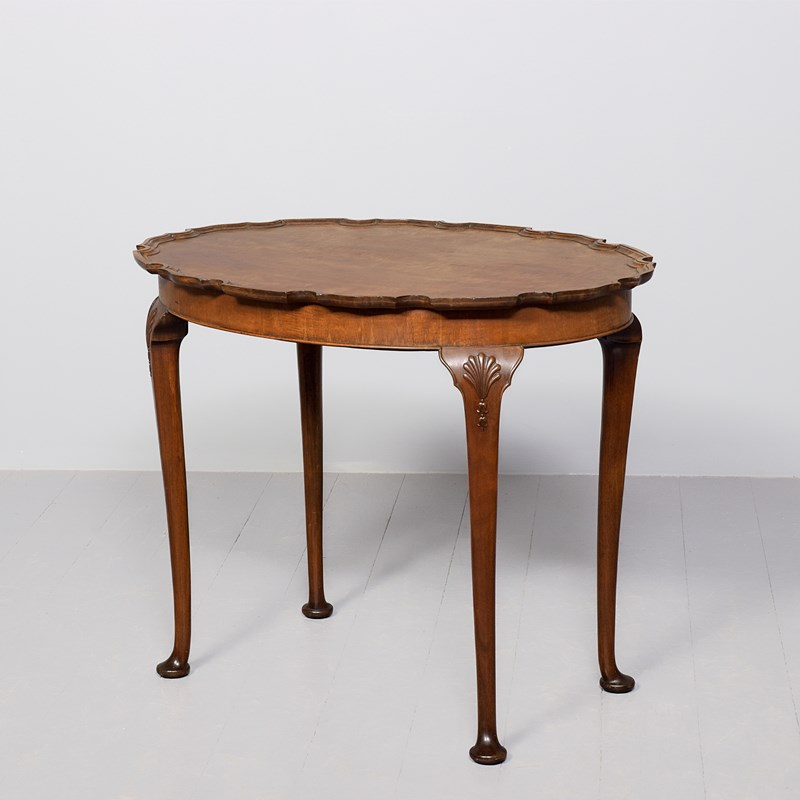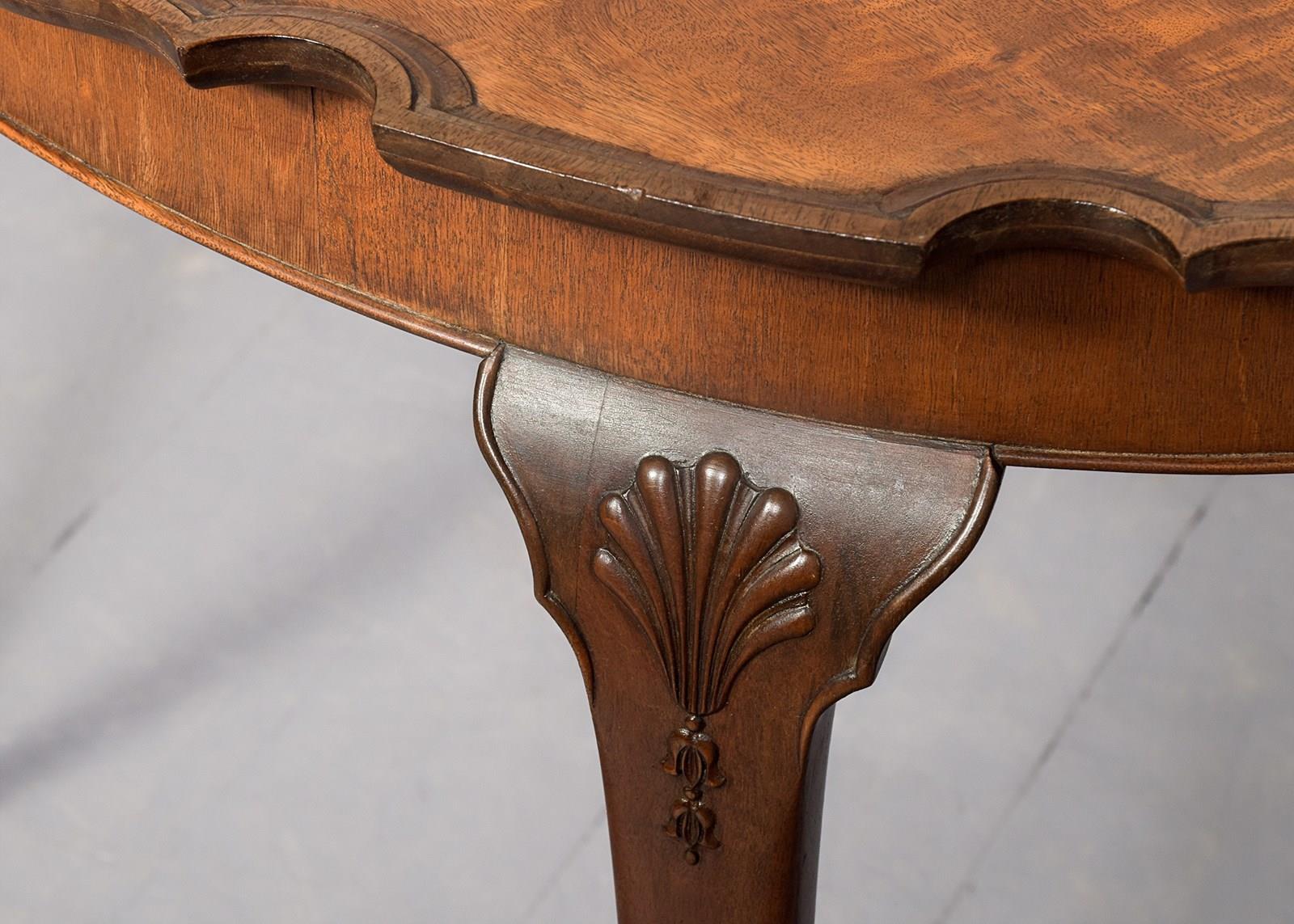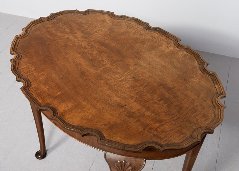Circa 1900. A stylish George III mahogany occasional table, the oval top with a well-carved and shaped pie crust edge, the simple frieze with beading beneath, resting on four turned and tapering legs, headed by carved scallop shell with harebells beneath with shaped quarter block, finishing on a simple pad foot.