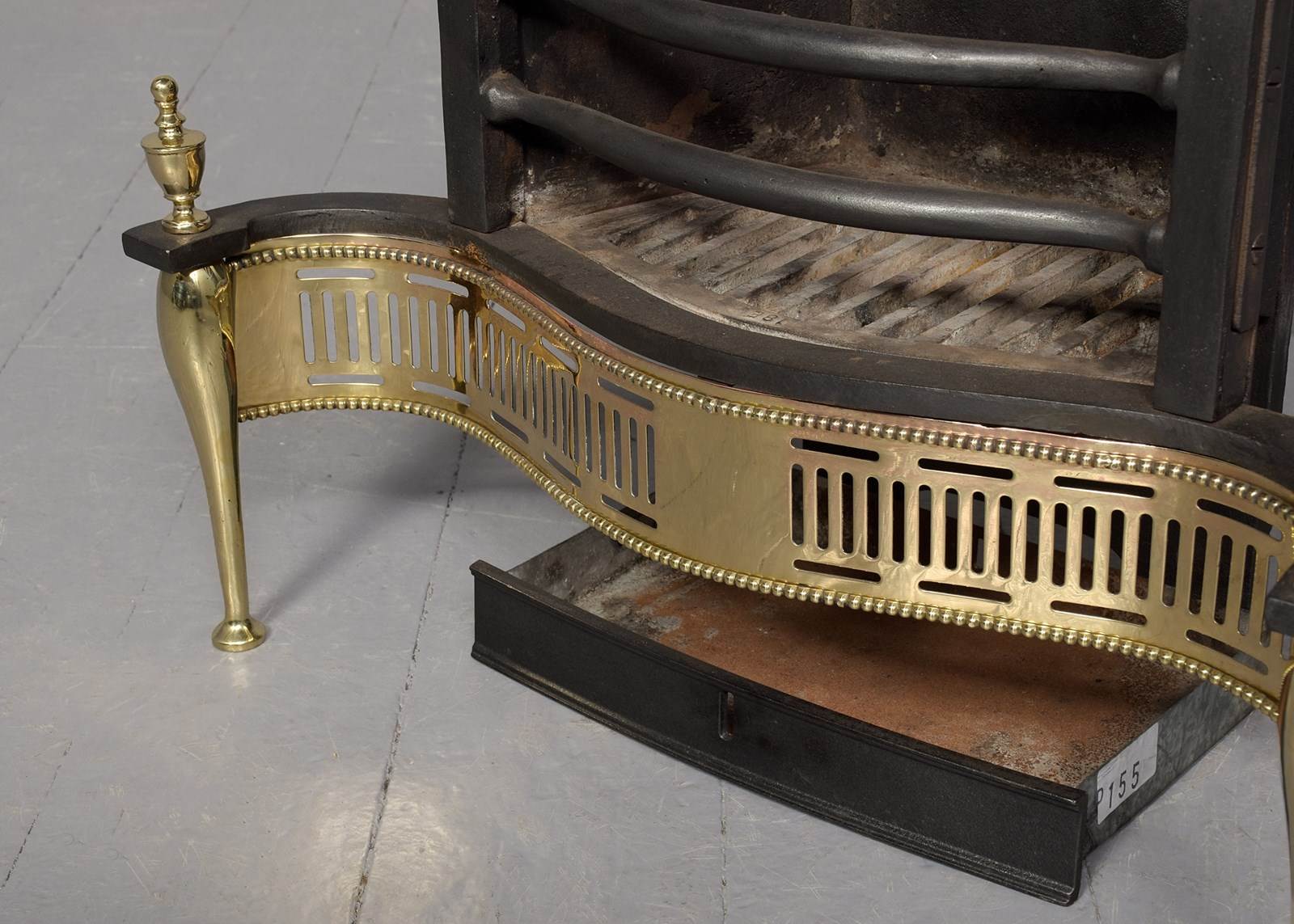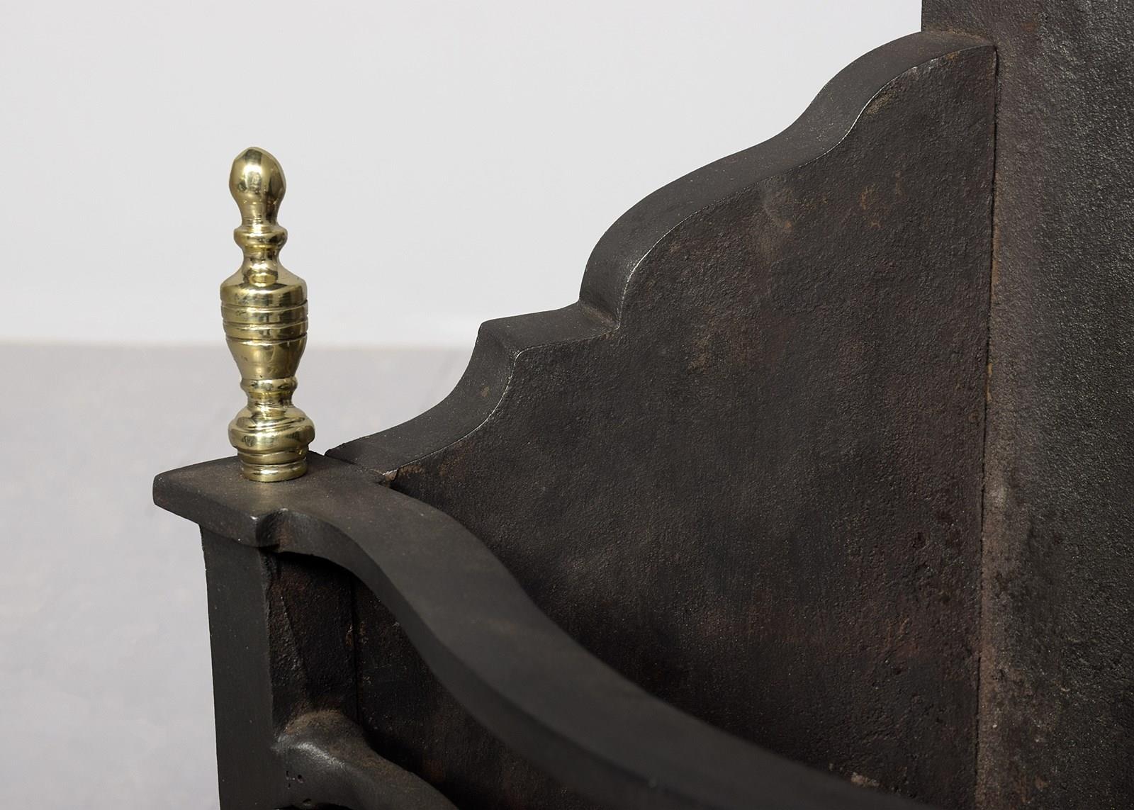 Circa 1900. A George III style steel and brass serpentine fronted fire grate of diminutive proportions, the cast back with foliate casting in the centre, the serpentine front surmounted by a pair of cast brass finials, with the slatted floor beneath, the serpentine front with pierced and embossed brass facing, the ends with brass finials, resting on a pair of brass legs finishing on turned toes, the back on a solid base with a small ash pan beneath.