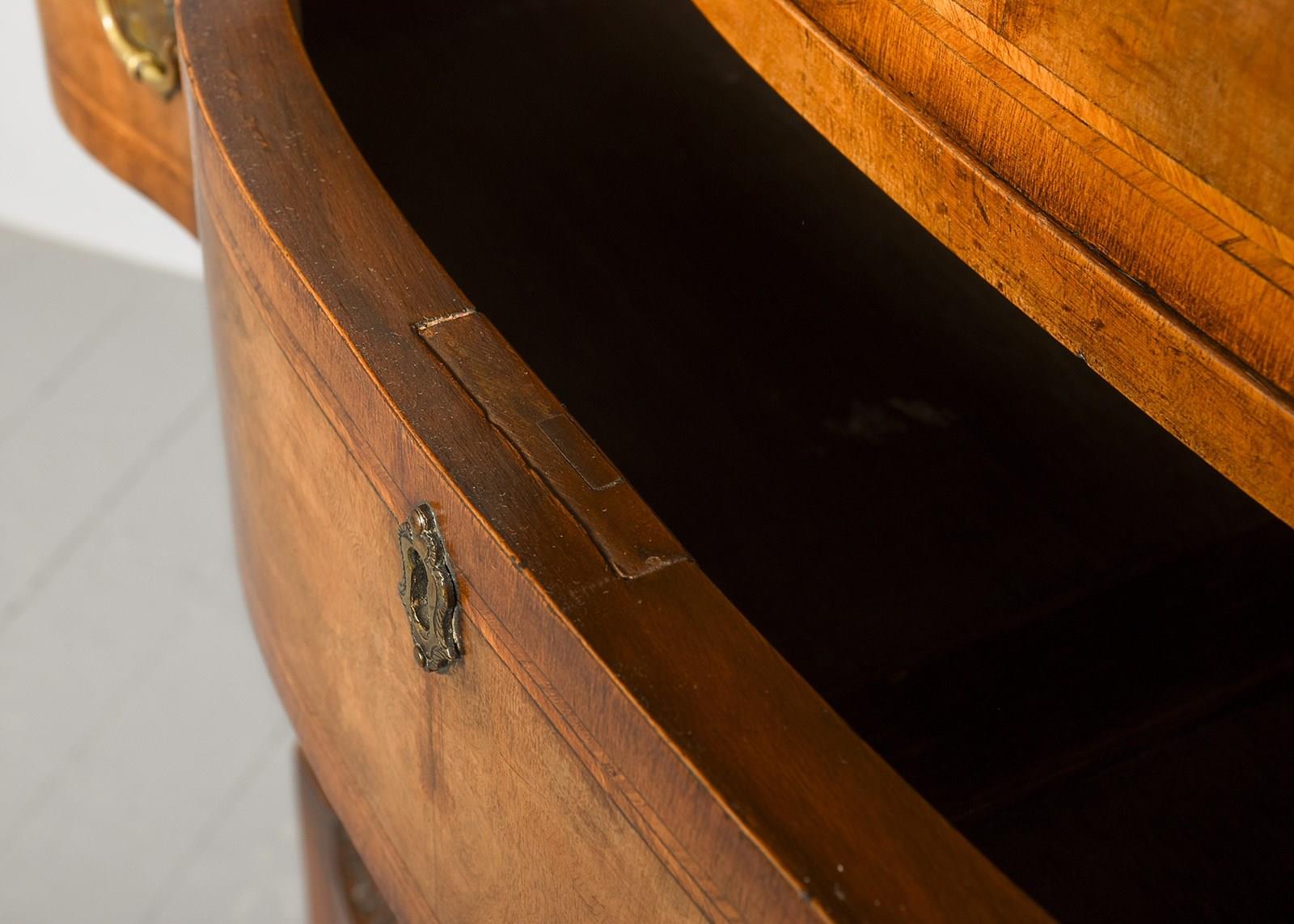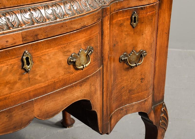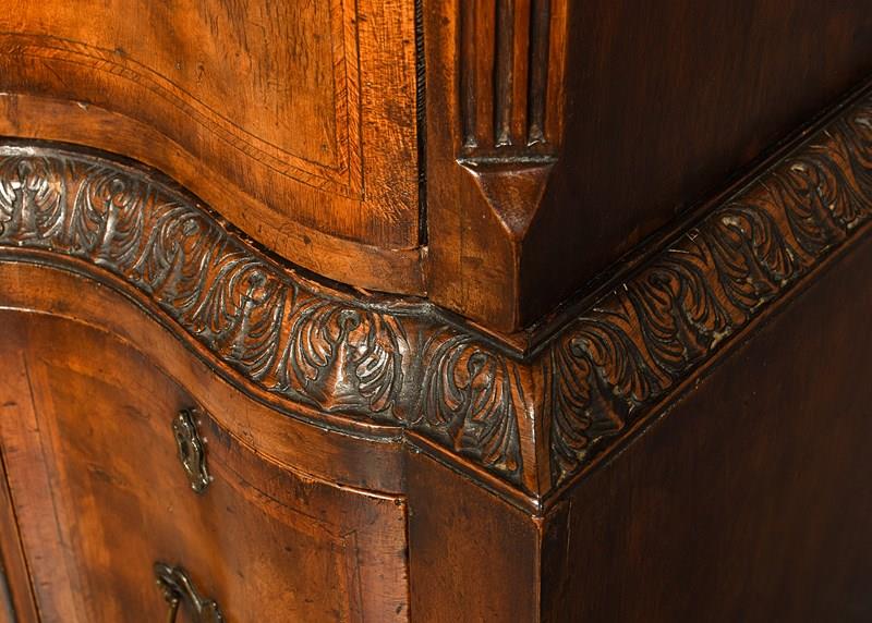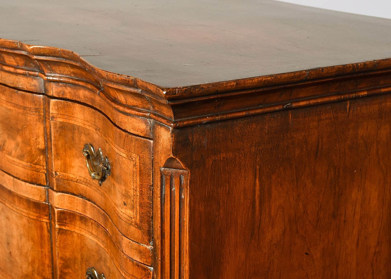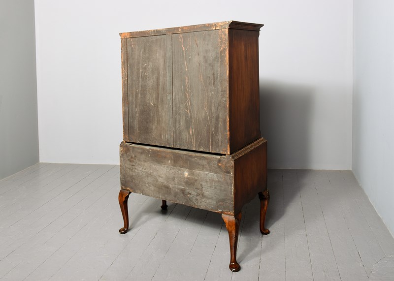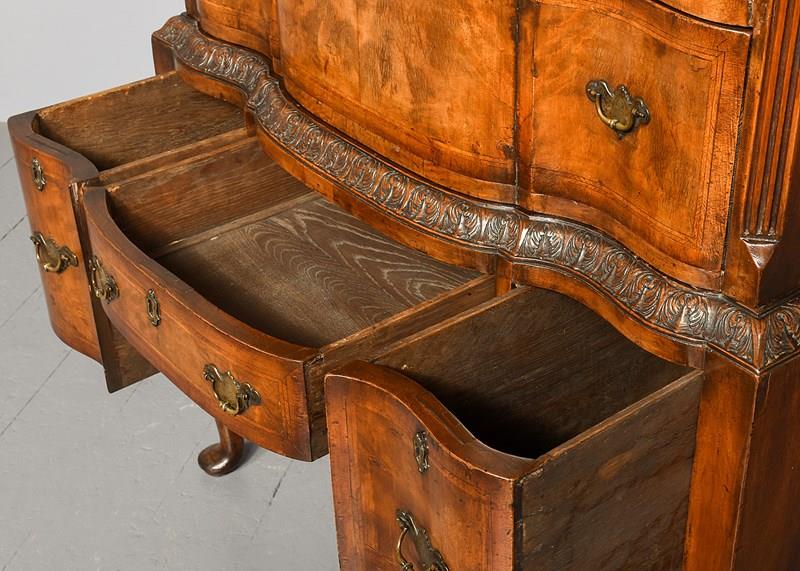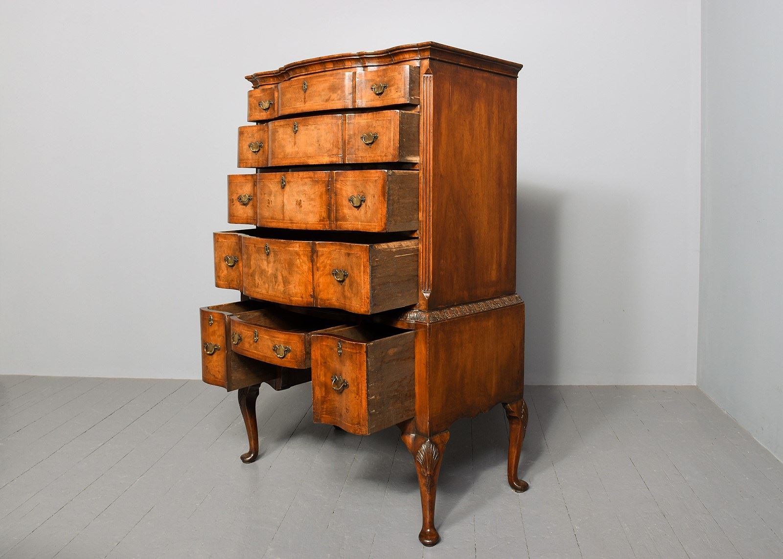Circa 1900. George I style crossbanded, figured walnut chest on stand with a lovely mellow colour. The polished top in quarter-matched figured walnut, above a moulded segmented cornice and 4 shaped-front graduated drawers with crossbanding, herringbone inlay, engraved cut brass handles and escutcheons, and solid oak drawer linings. The upper section with canted corners. The base with a foliate carved moulding and two short and one long drawer with matching details, all supported on short cabriole legs with shell carved knees and pad feet.