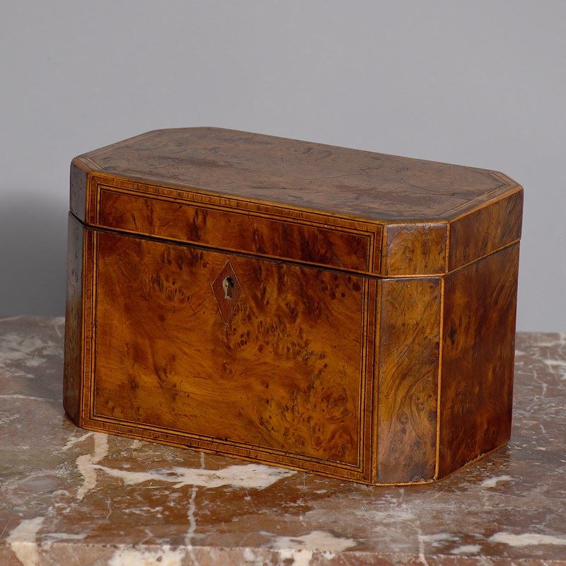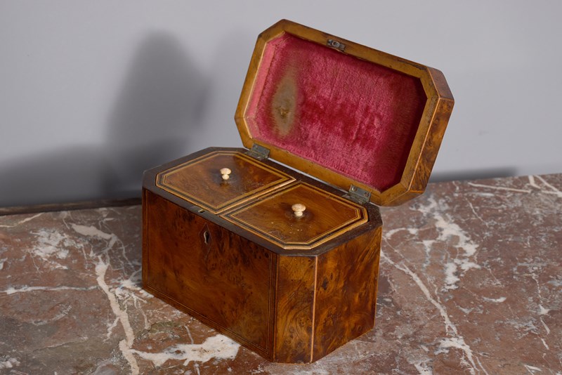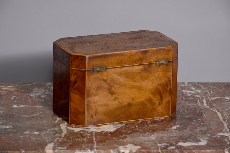 Circa 1820. A good George IV Burr-Elm and inlaid tea caddy, the rectangular caddy with canted corners and broad banding inlay on the top, the deep lid opens to reveal a fitted interior with two compartments in burr elm with inlaid borders, the front with a heraldic diamond escutcheon and original lock and key, the body is in the finest Burr-Elm with inlay on the front and boxwood inlay on the corner and fore-edges