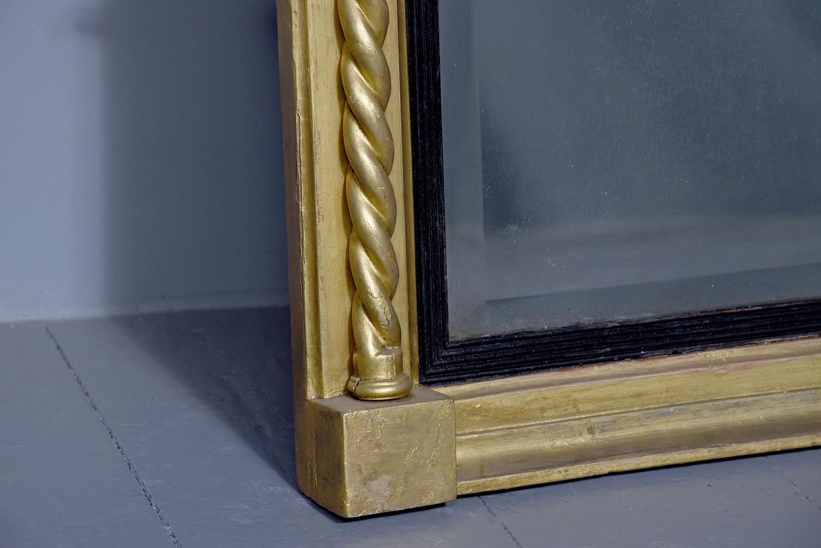 A stylish George IV gilded and ebonized pier mirror. The moulded top with breakfront section on each end, with ribbing on the fore-edge with gilded balls on the underside, and a frieze depicting cherubs at harvest. The original rectangular bevel edged mirror, contained in a stylish ebonized ribbed slip with a gilded moulding to the outside and a pair of barley sugar columns running from the top to the bottom, resting on simple blocks with further mouldings.