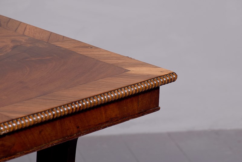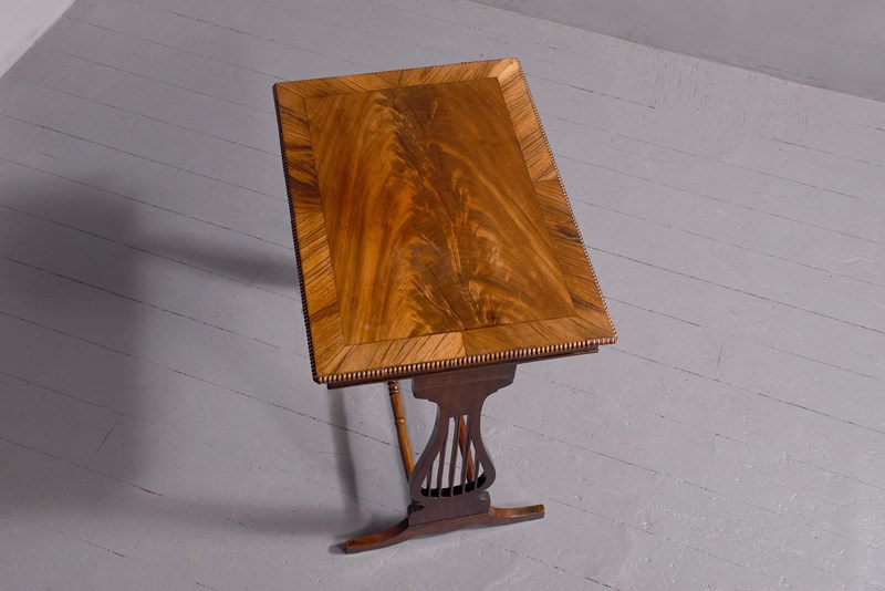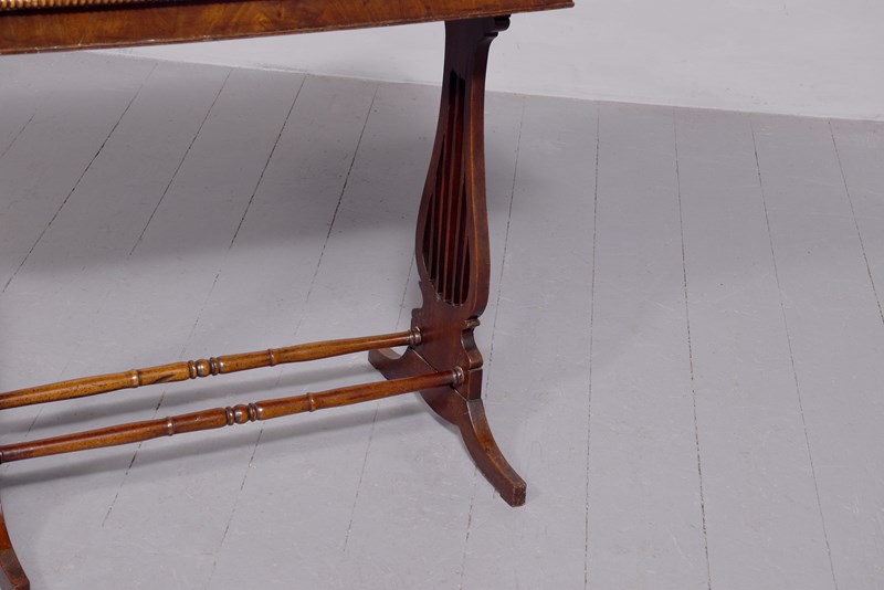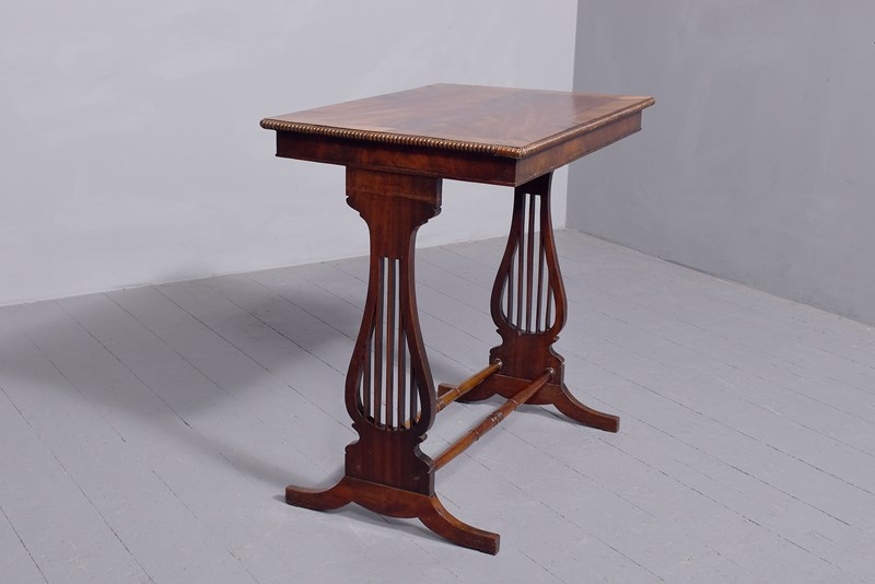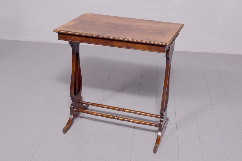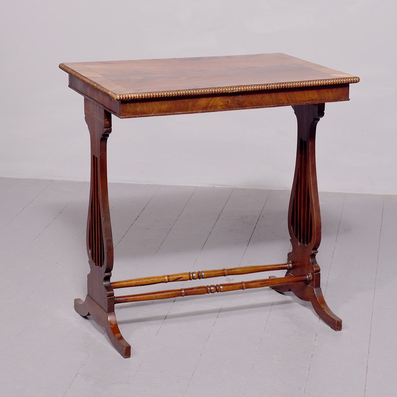 Circa 1820. A quality George IV mahogany side table, the rectangular top in flame mahogany with broad cross banding in ebony, a finely beaded fore-edge, and simple frieze in flame mahogany, supported on a pair of trestle ends, each with a pierced Lyre design, the legs braced by a pair of turned stretchers, all resting on four squat low saber legs, with great colour and patination.