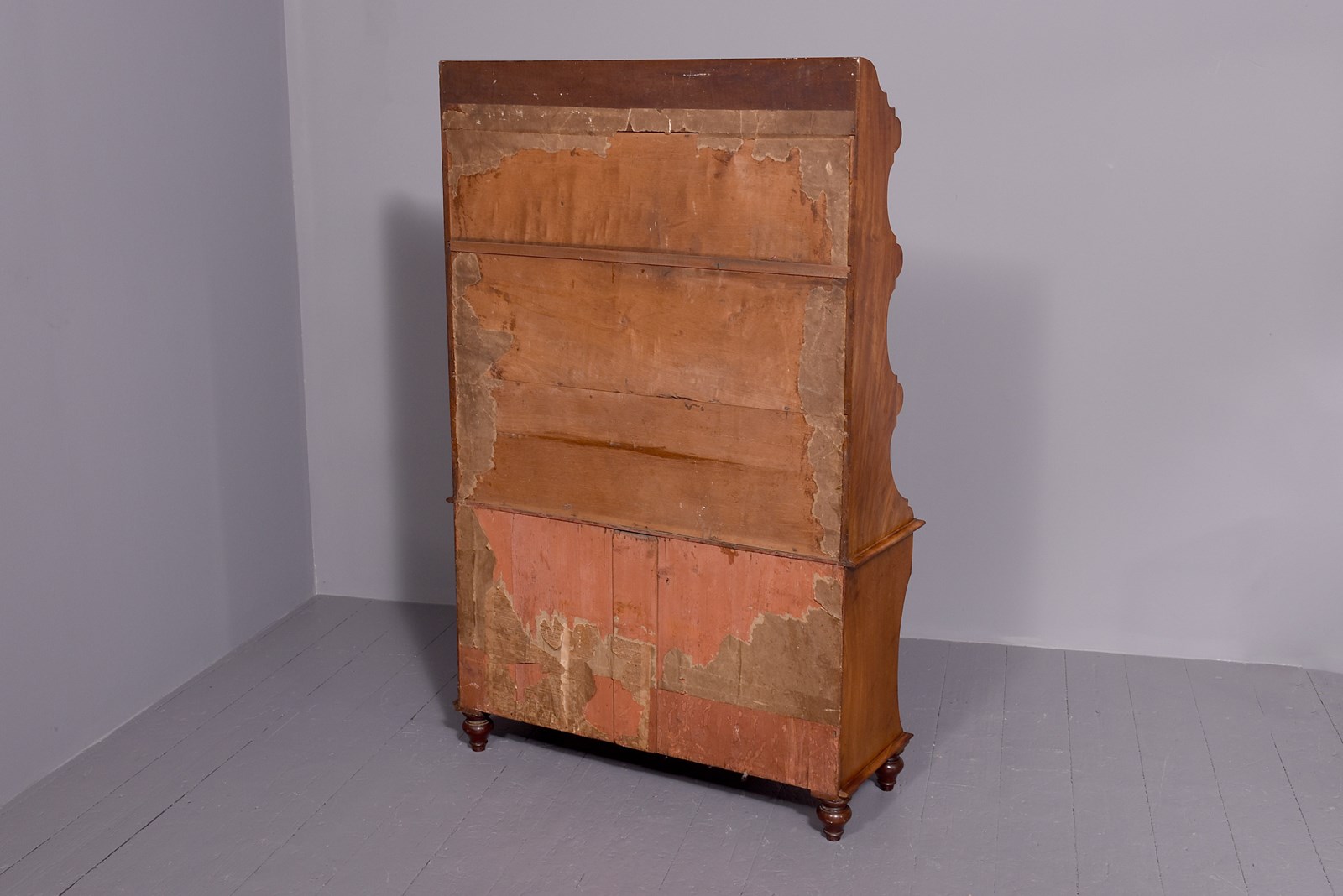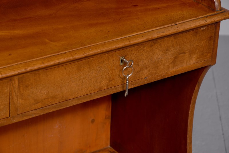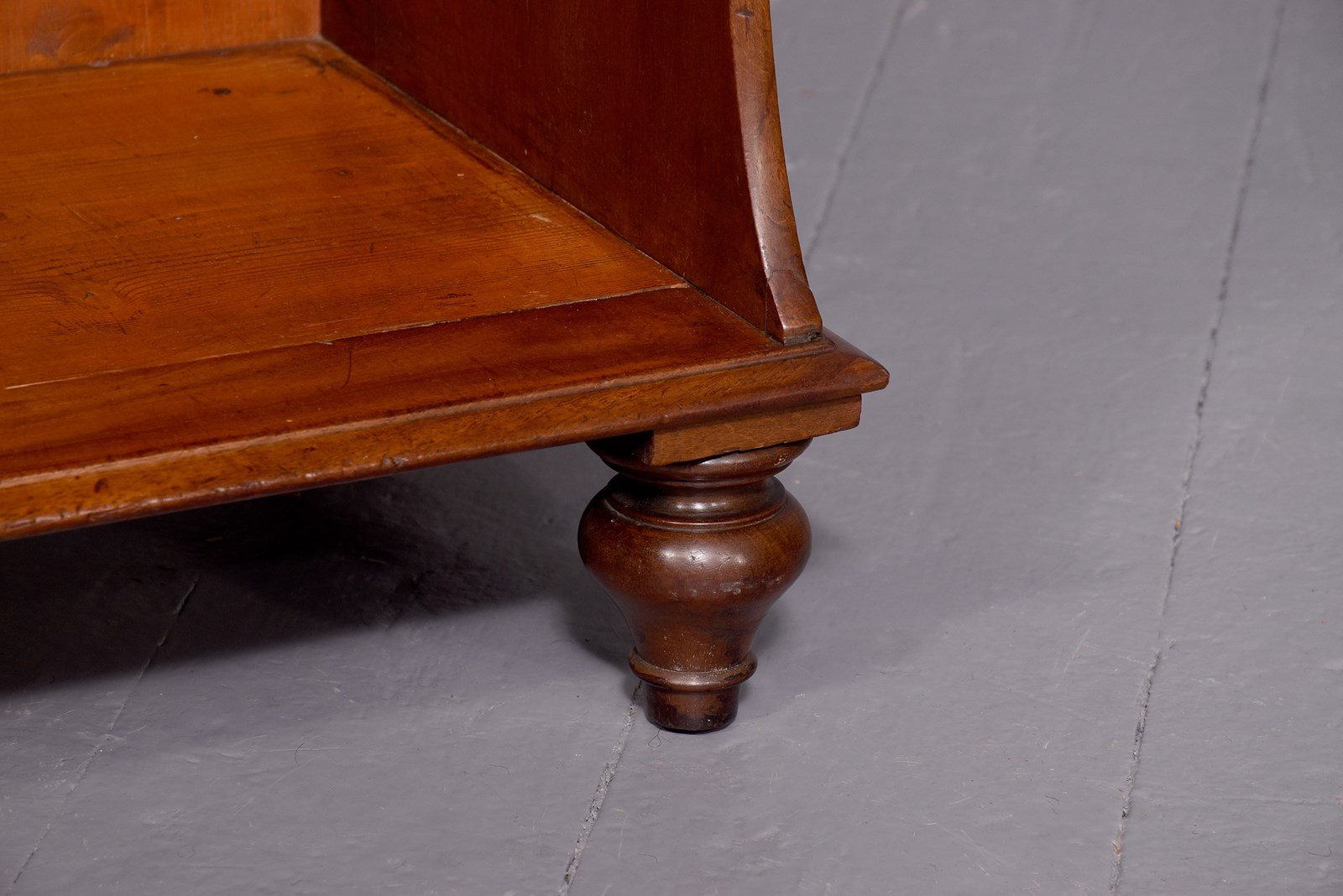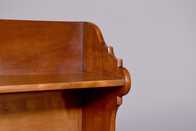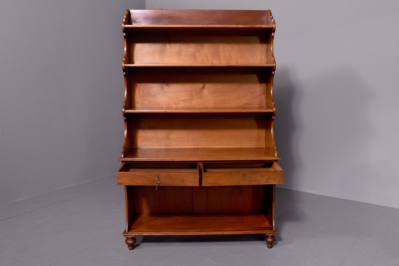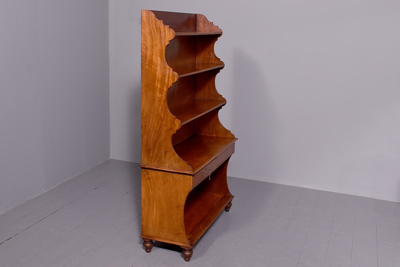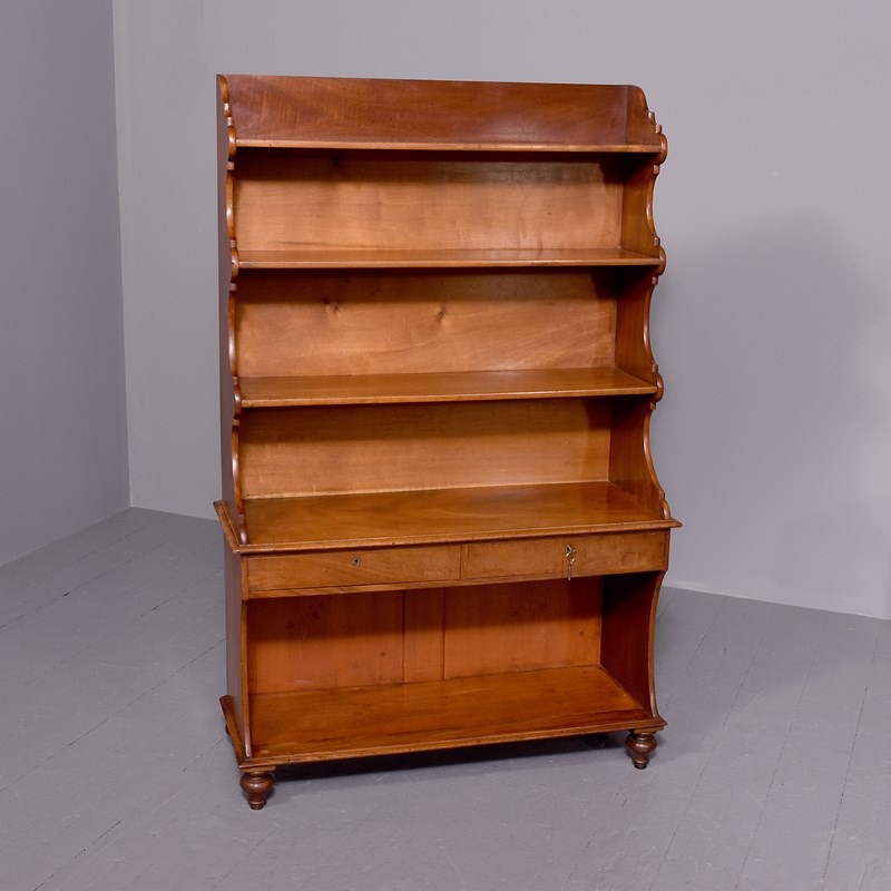 Circa 1820. A quality George IV mahogany waterfall open bookcase, the top shelf with ¾ gallery shaped on the front, the shelves all with stylish uprights varying in size slightly, the largest shelf in the center with simple moulded fore-edge, with a pair of lockable drawers in the frieze, with a single shelf beneath, all resting on four squat bun feet.