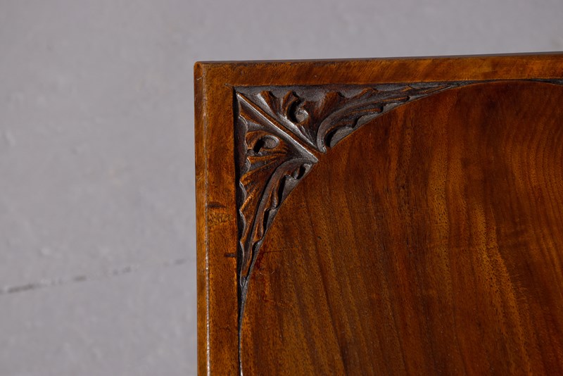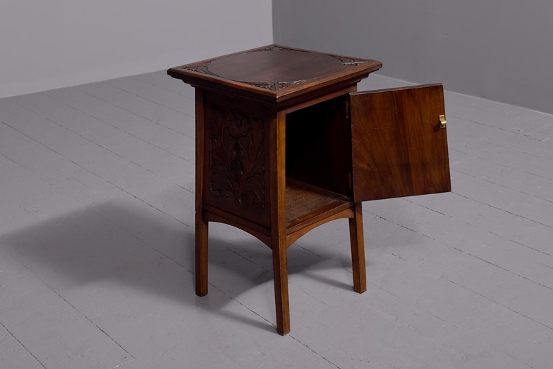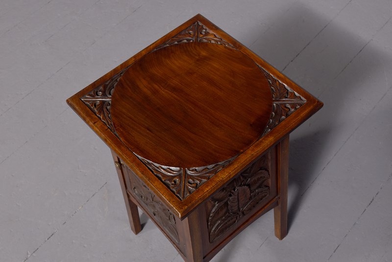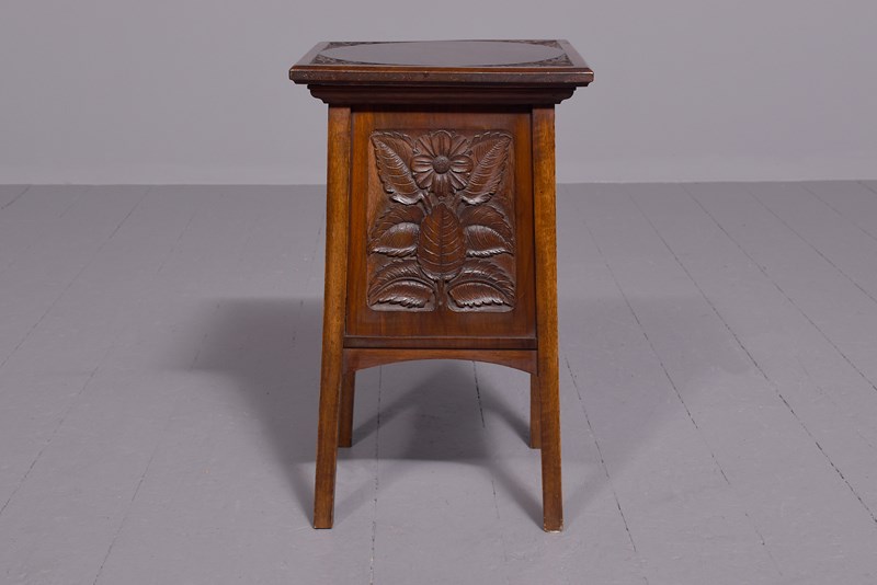 Arts And Crafts Neat-Size Mahogany Carved Side Table With Cupboard