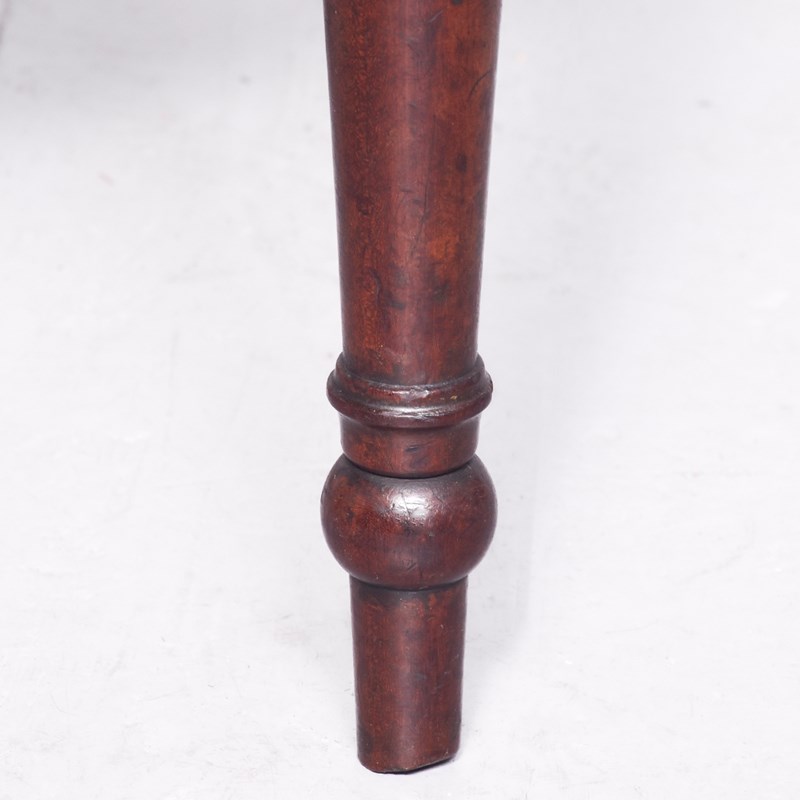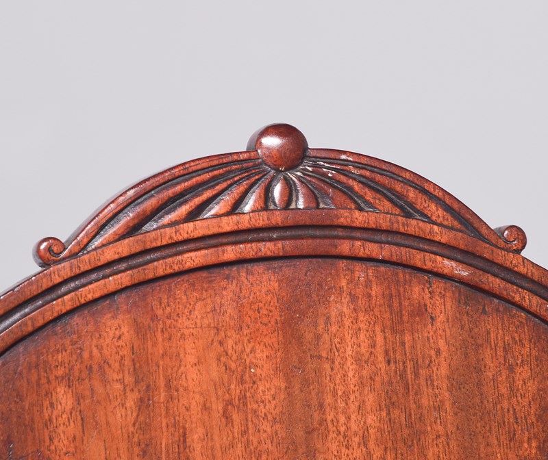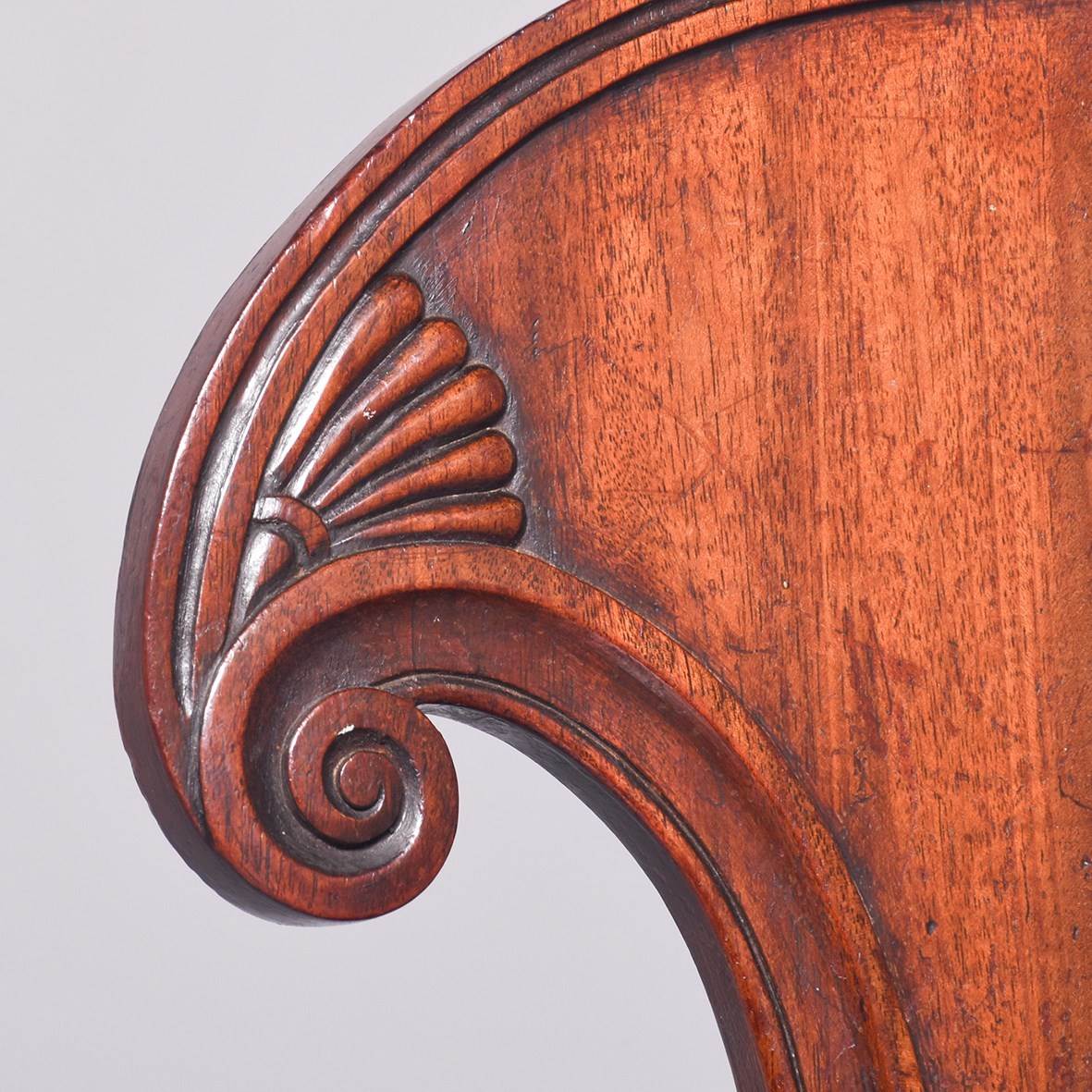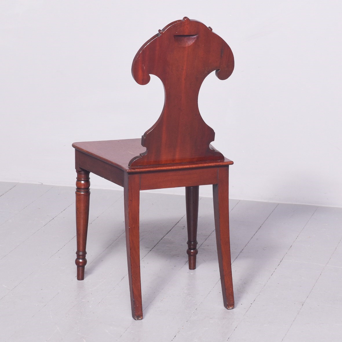 Circa 1820. A quality mahogany George IV hall chair. The elegant well carved pelta back, resting on a shaped solid seat with rounded corners, with simple seat rail. Back legs are square and slightly out swept and front legs are turned ring turned and tapering.