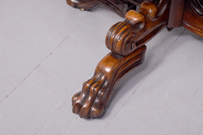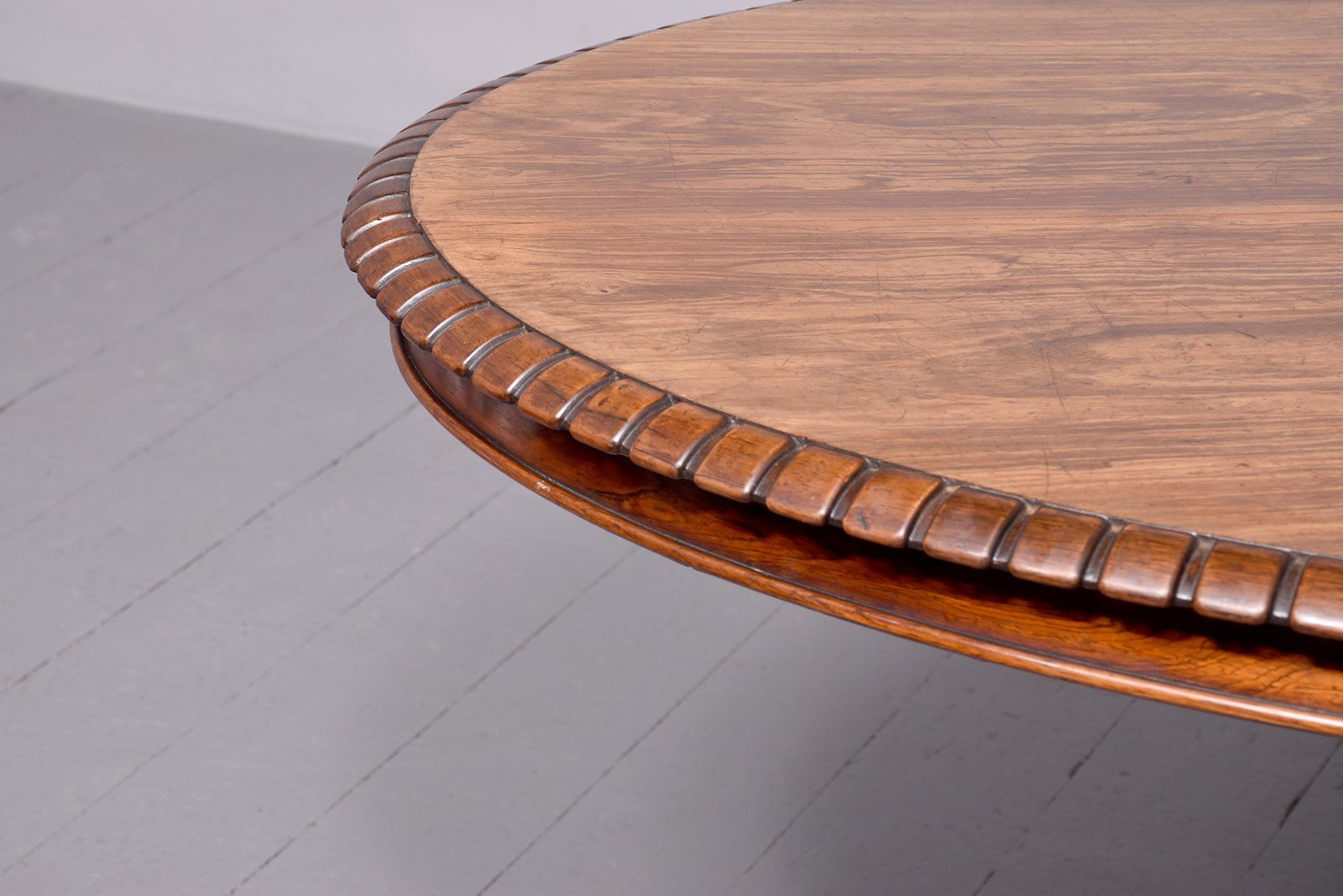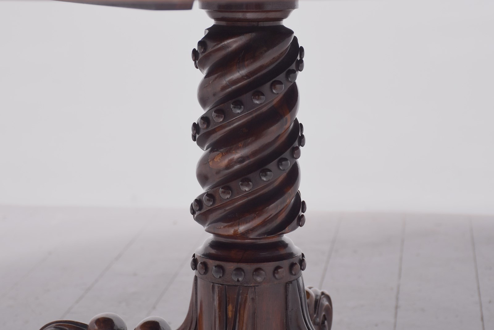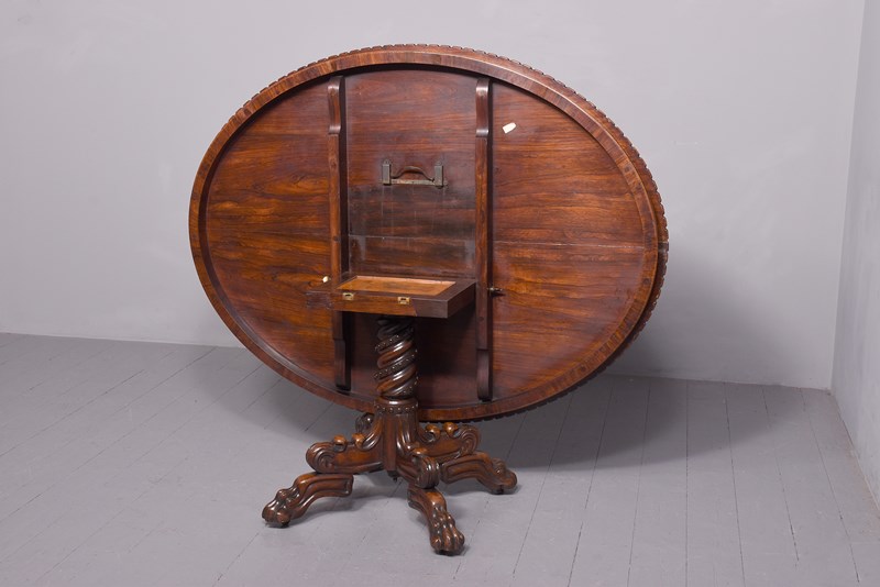 Circa 1820. A quality George IV oval rosewood snap top breakfast table, the top in finely figured rosewood with carved fore-edge with a simple frieze with beading beneath, unusually the table opens on the length, which is held in place by a double brass clasp and brass pins, resting on a rosewood veneered block, all supported on a twisted stem with beadings on the facings, issuing four stylish and profusely carved feet with foliate carving on the knees, resting on four hairy paw feet with concealed castors beneath. The table has wonderful colour and patination.