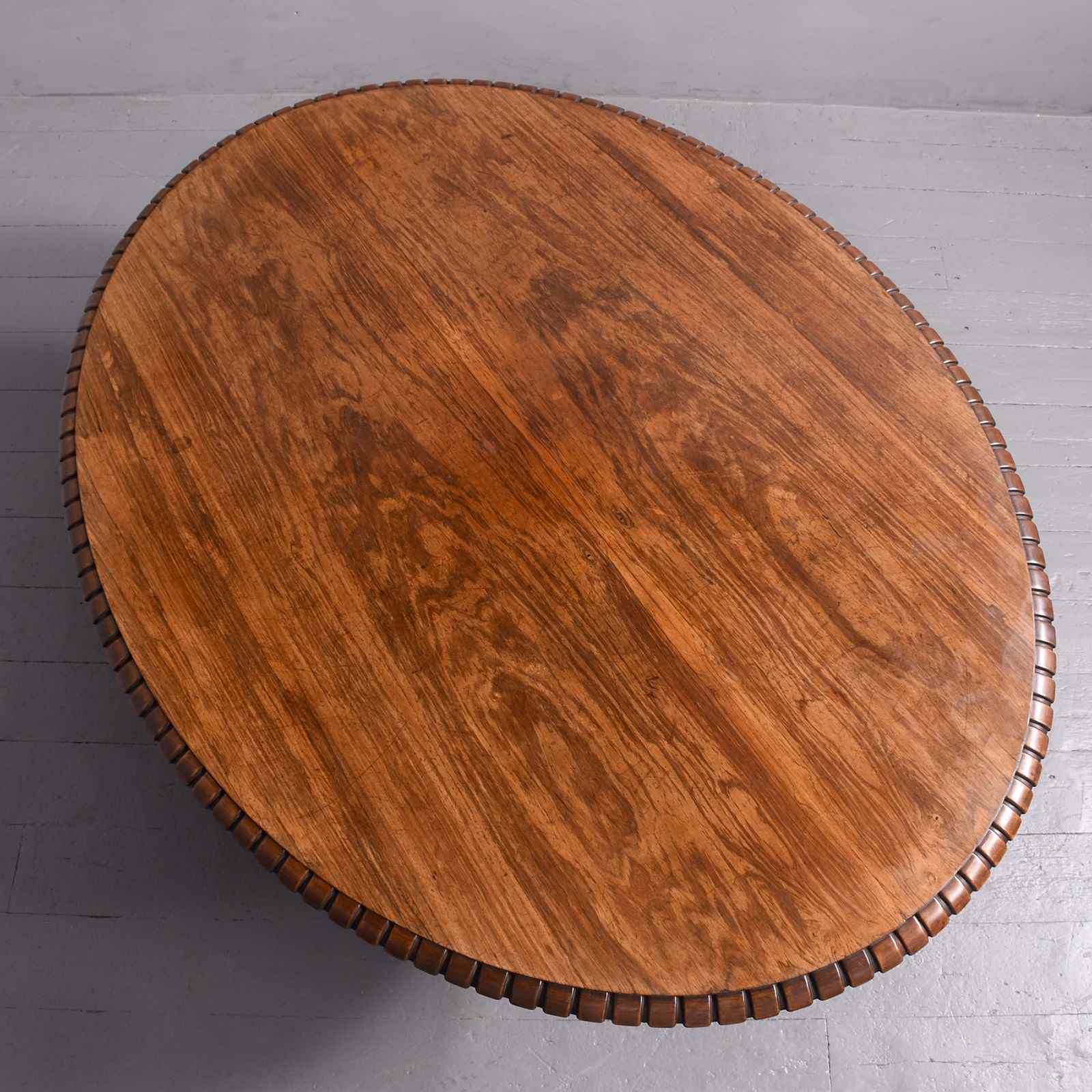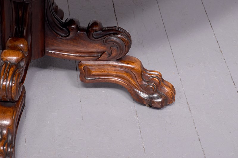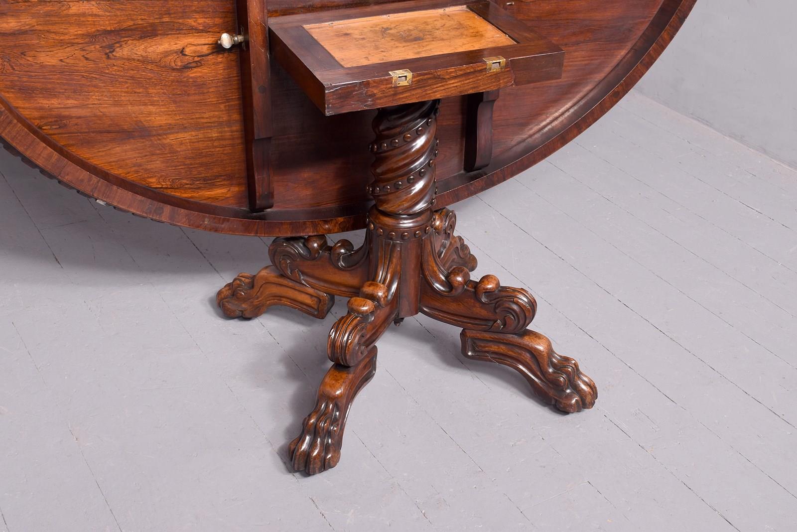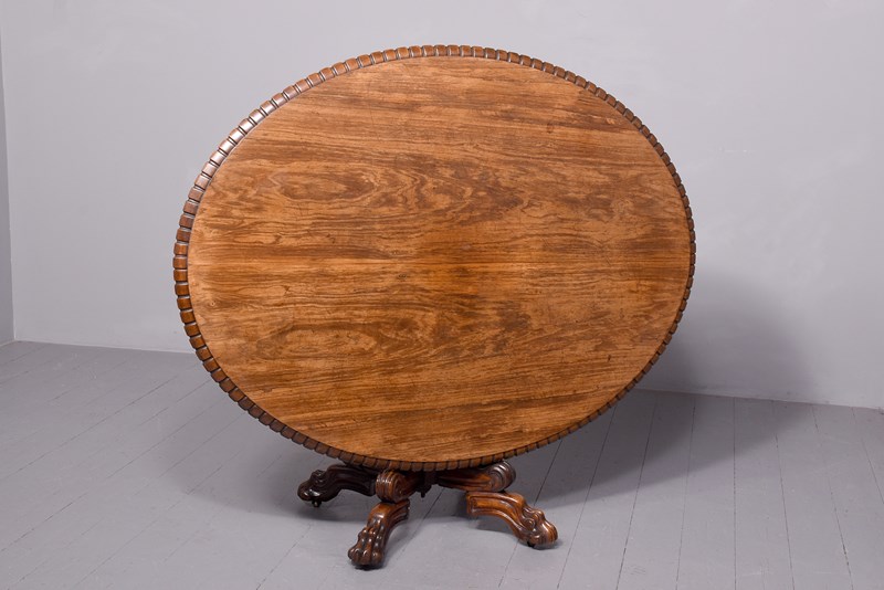 Circa 1820. A quality George IV oval rosewood snap top breakfast table, the top in finely figured rosewood with carved fore-edge with a simple frieze with beading beneath, unusually the table opens on the length, which is held in place by a double brass clasp and brass pins, resting on a rosewood veneered block, all supported on a twisted stem with beadings on the facings, issuing four stylish and profusely carved feet with foliate carving on the knees, resting on four hairy paw feet with concealed castors beneath. The table has wonderful colour and patination.