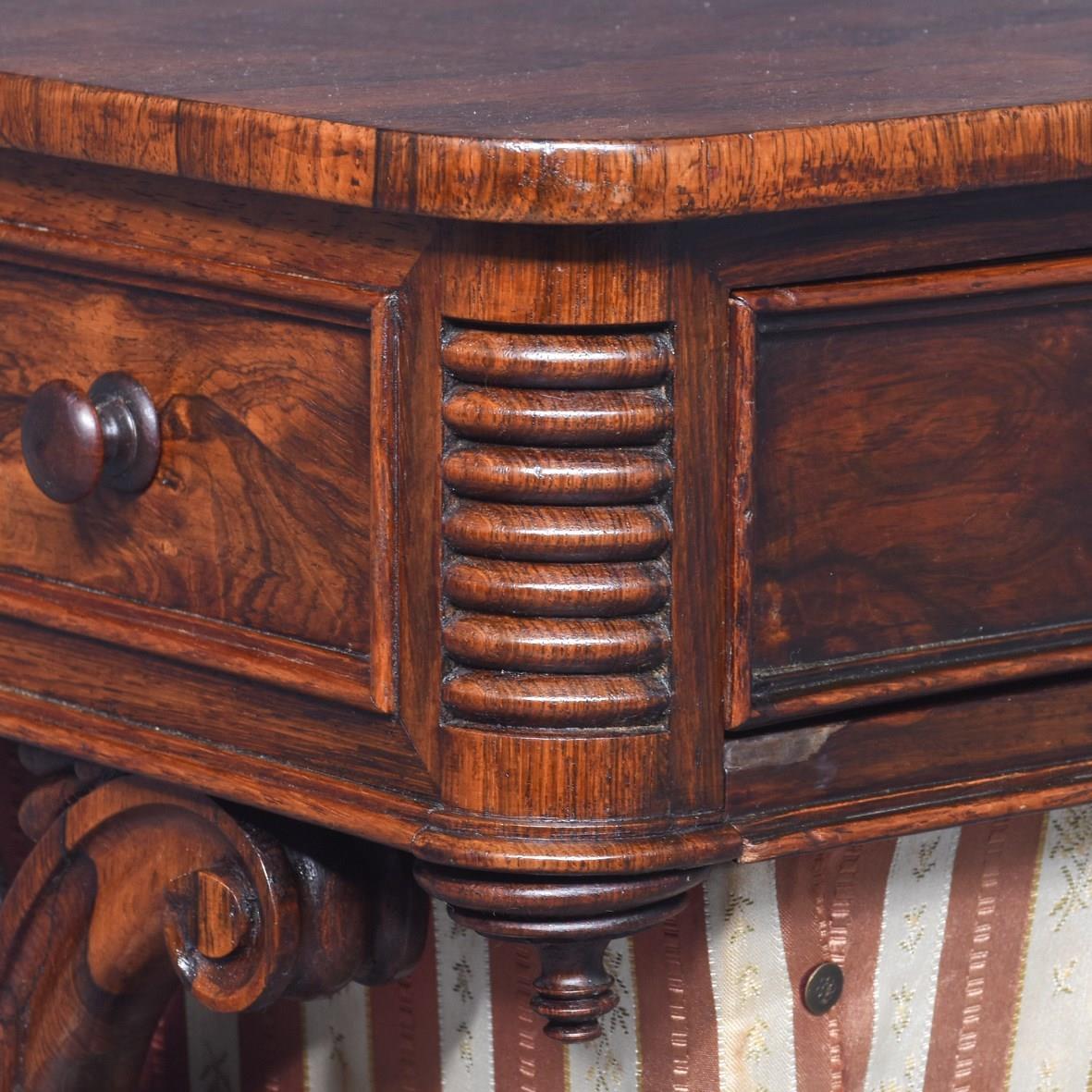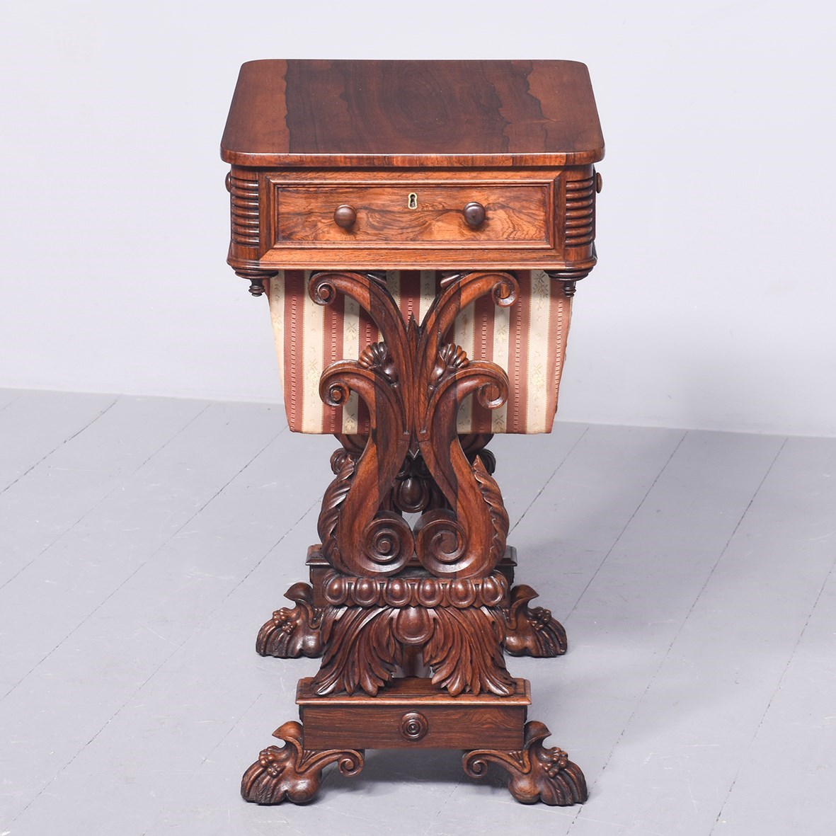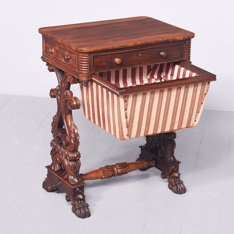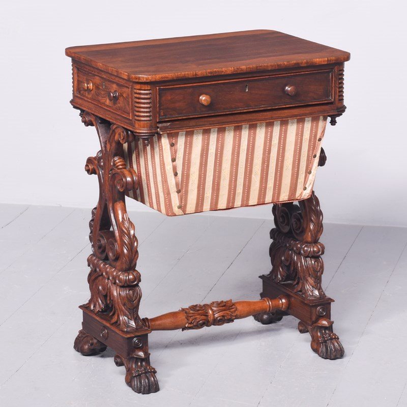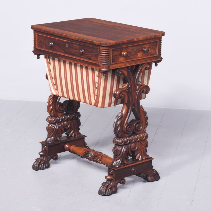 Circa 1830. A quality George IV rosewood work table, the rounded top well-figured rosewood with ribbing on the corners, with a full-length drawer with knob handles with similar faux drawers on the sides and the back, beneath there is a pullout basket lined in fabric, resting in a pair of profusely carved and pierced trestle ends, sitting on a platform base, braced a by a well-carved and stylish stretcher, the platform is resting on four finely carved feet with scrolling.