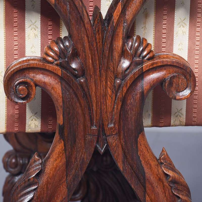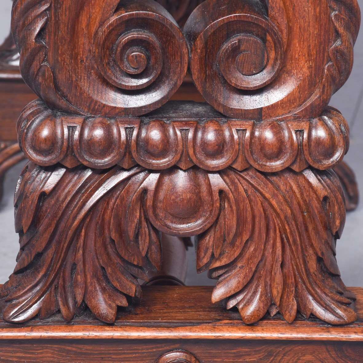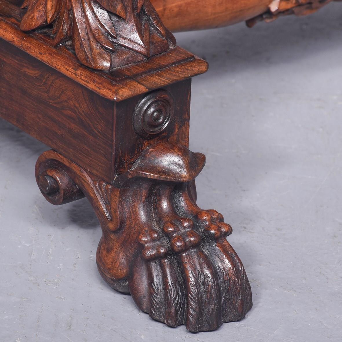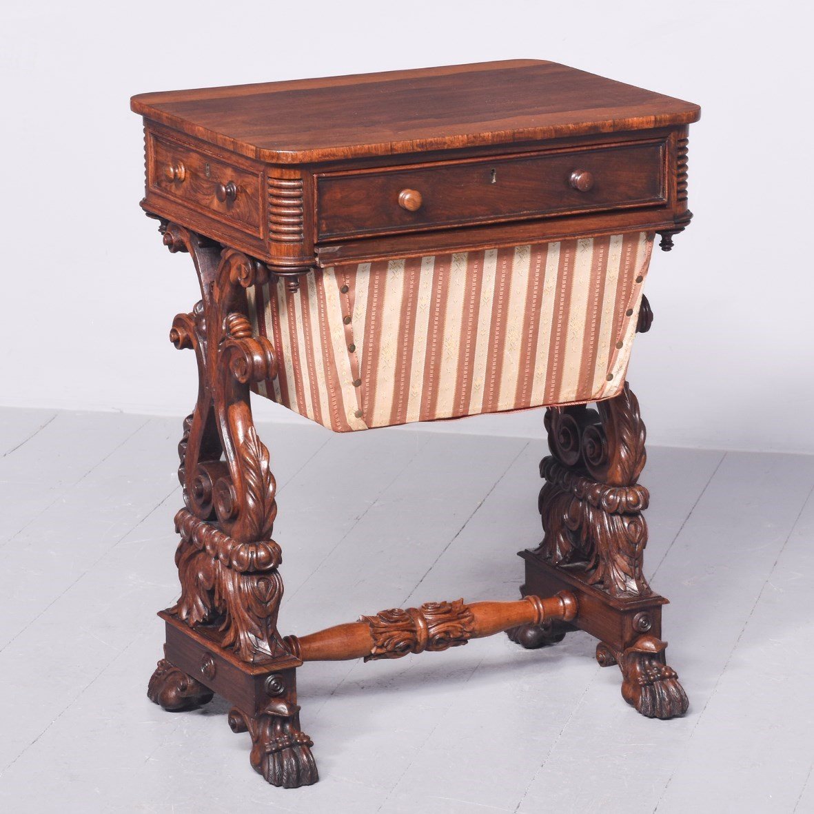Circa 1830. A quality George IV rosewood work table, the rounded top well-figured rosewood with ribbing on the corners, with a full-length drawer with knob handles with similar faux drawers on the sides and the back, beneath there is a pullout basket lined in fabric, resting in a pair of profusely carved and pierced trestle ends, sitting on a platform base, braced a by a well-carved and stylish stretcher, the platform is resting on four finely carved feet with scrolling.