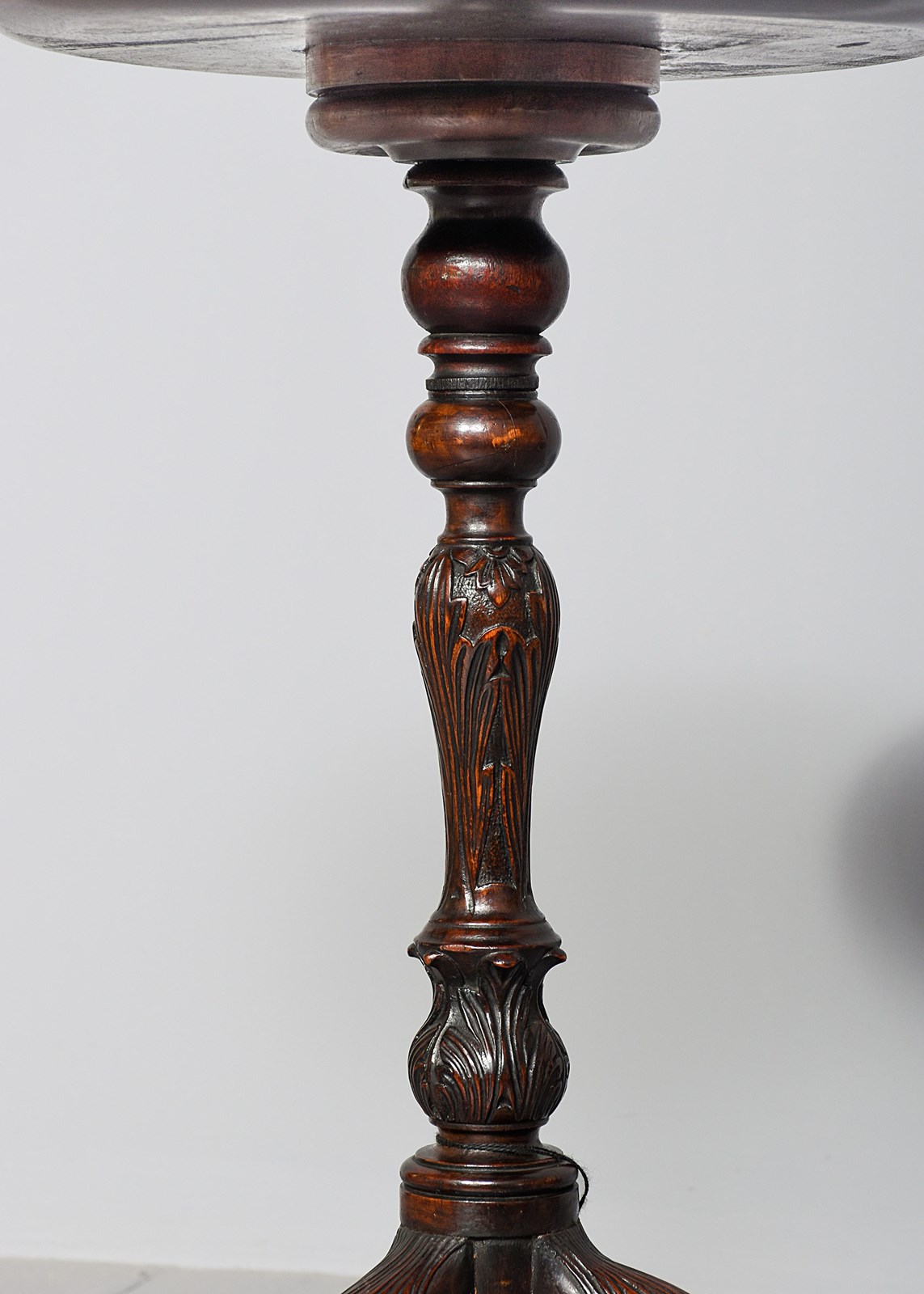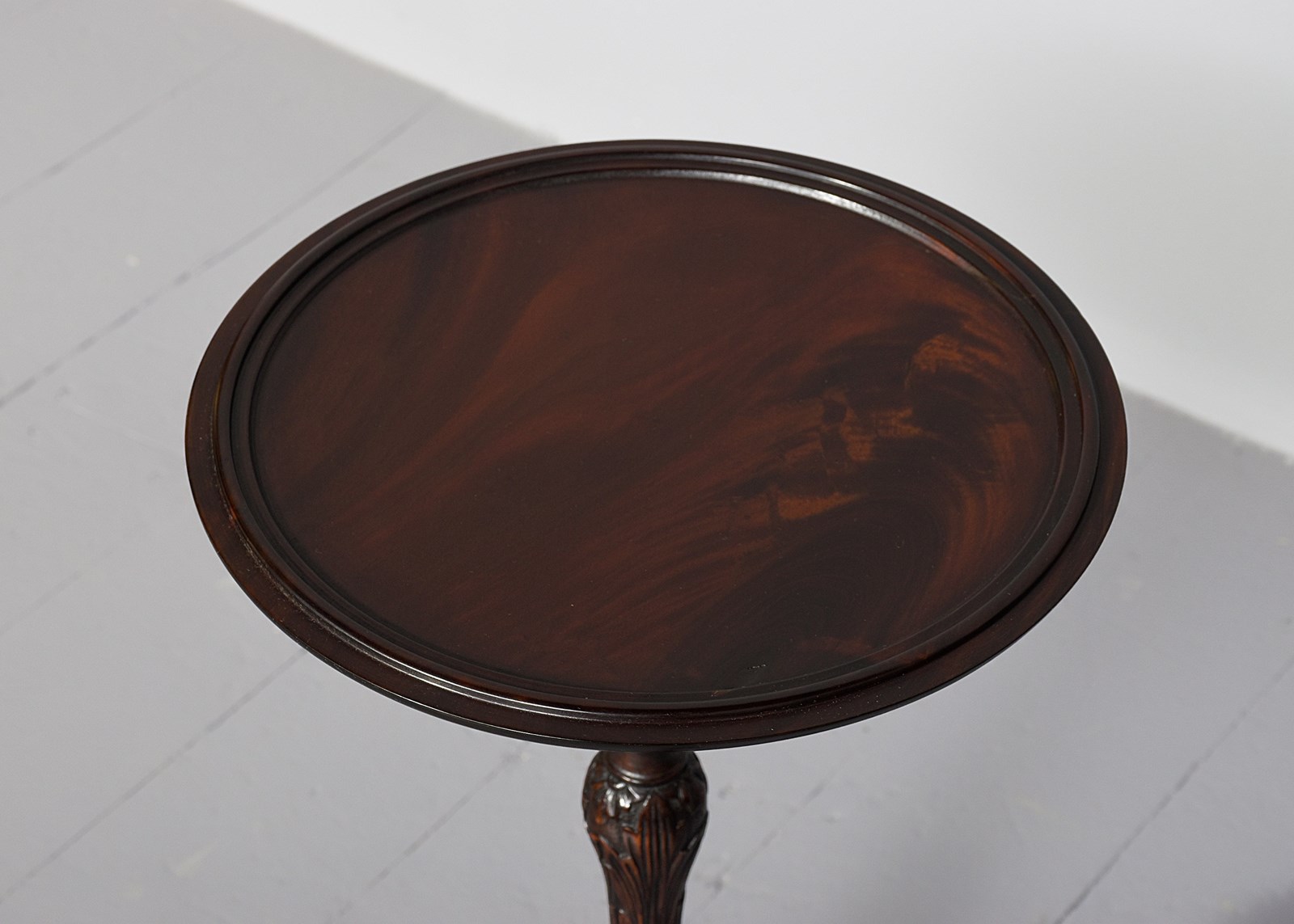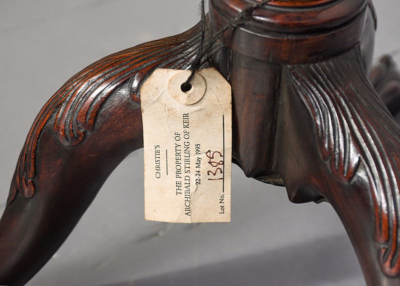 Circa 1800 with alterations. Georgian, Chippendale style-carved mahogany wine table. The base has a label from a Christie's sale 22nd May 1995, “Property of Archibald Sterling of Keir”, and bearing a coat of arms. The circular top with a moulded rim on an exceptional, vasiform stem with acanthus carvings above a cabriole base with acanthus carved knees and low ball and claw feet.