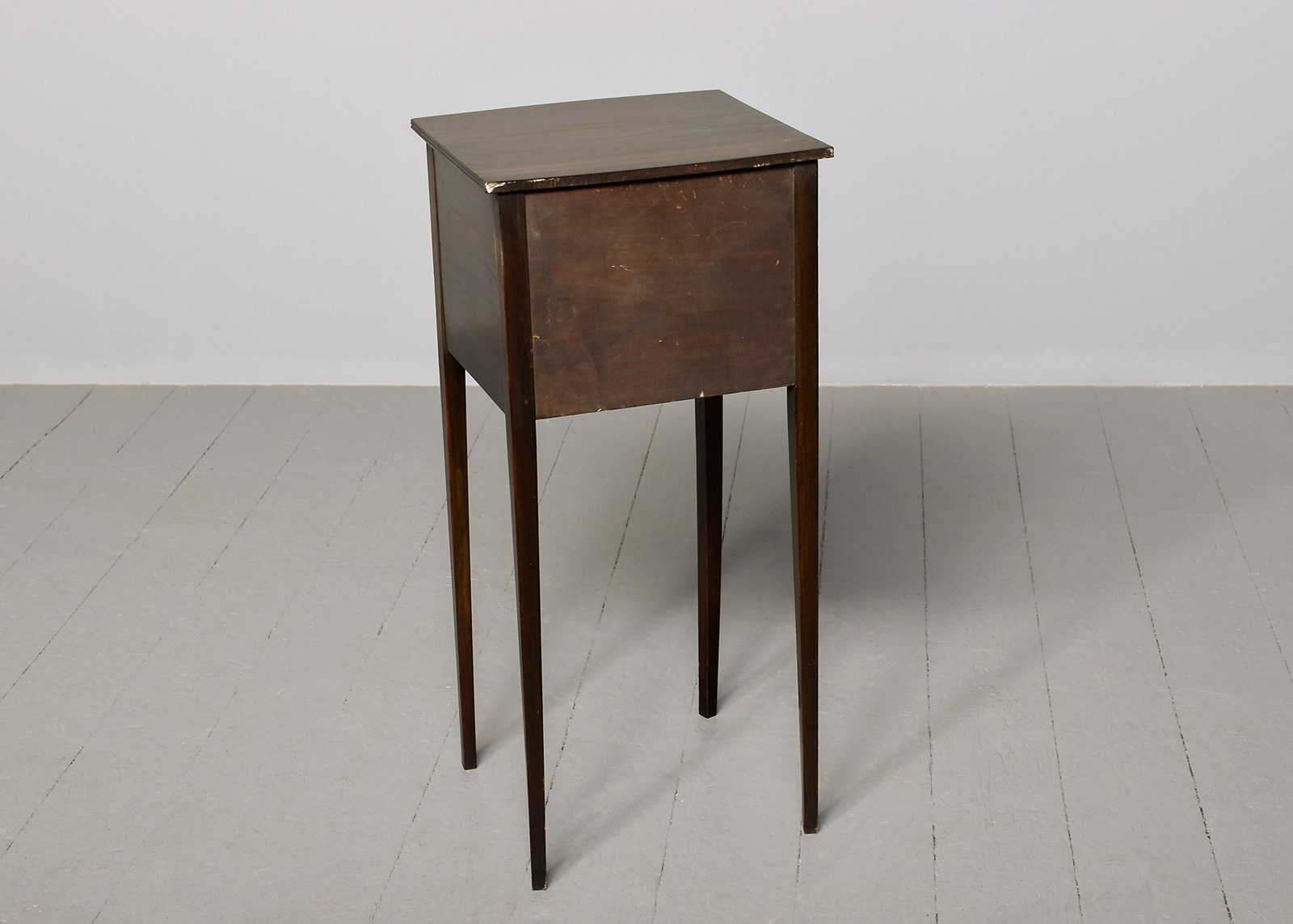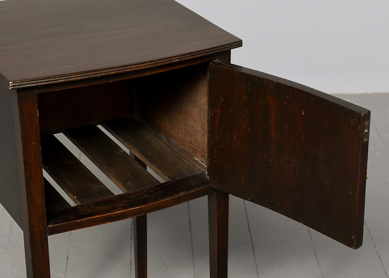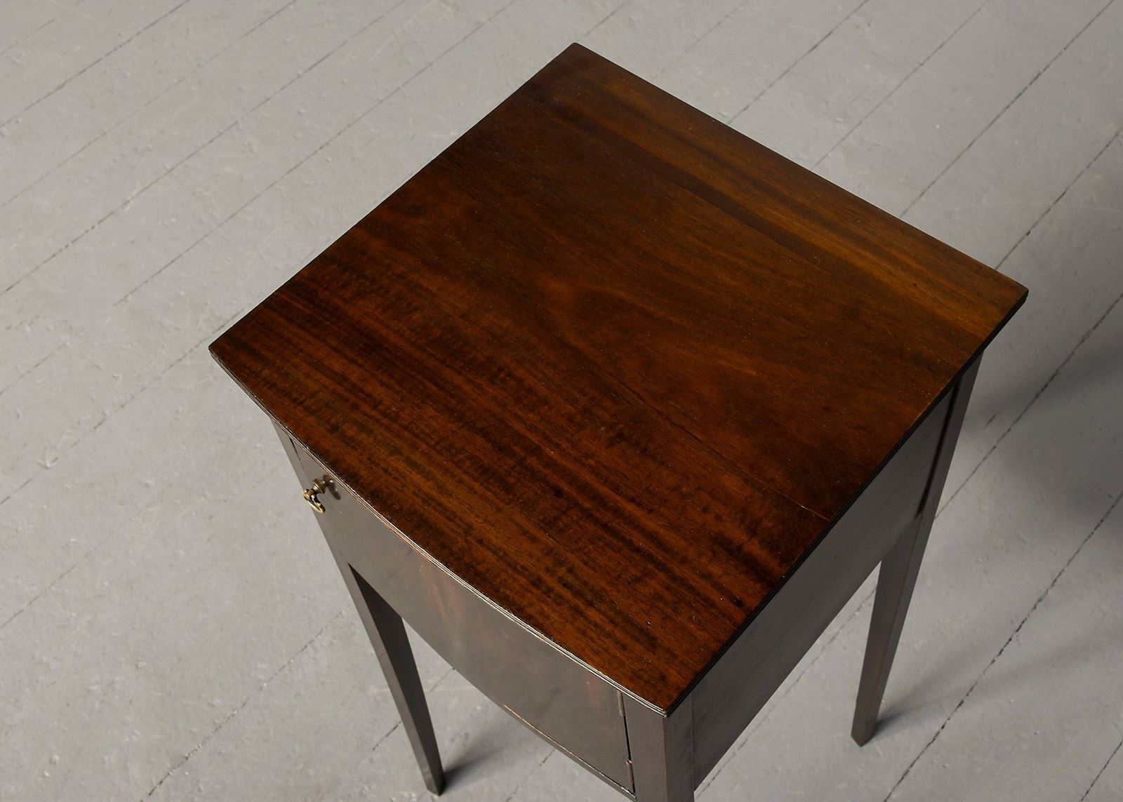 circa 1900. Georgian-style bow-front mahogany bedside locker. The bow front top in figured mahogany with fluted edges over a single door with a brass axe-head handle opening to a slatted interior. All supported on square tapering legs.