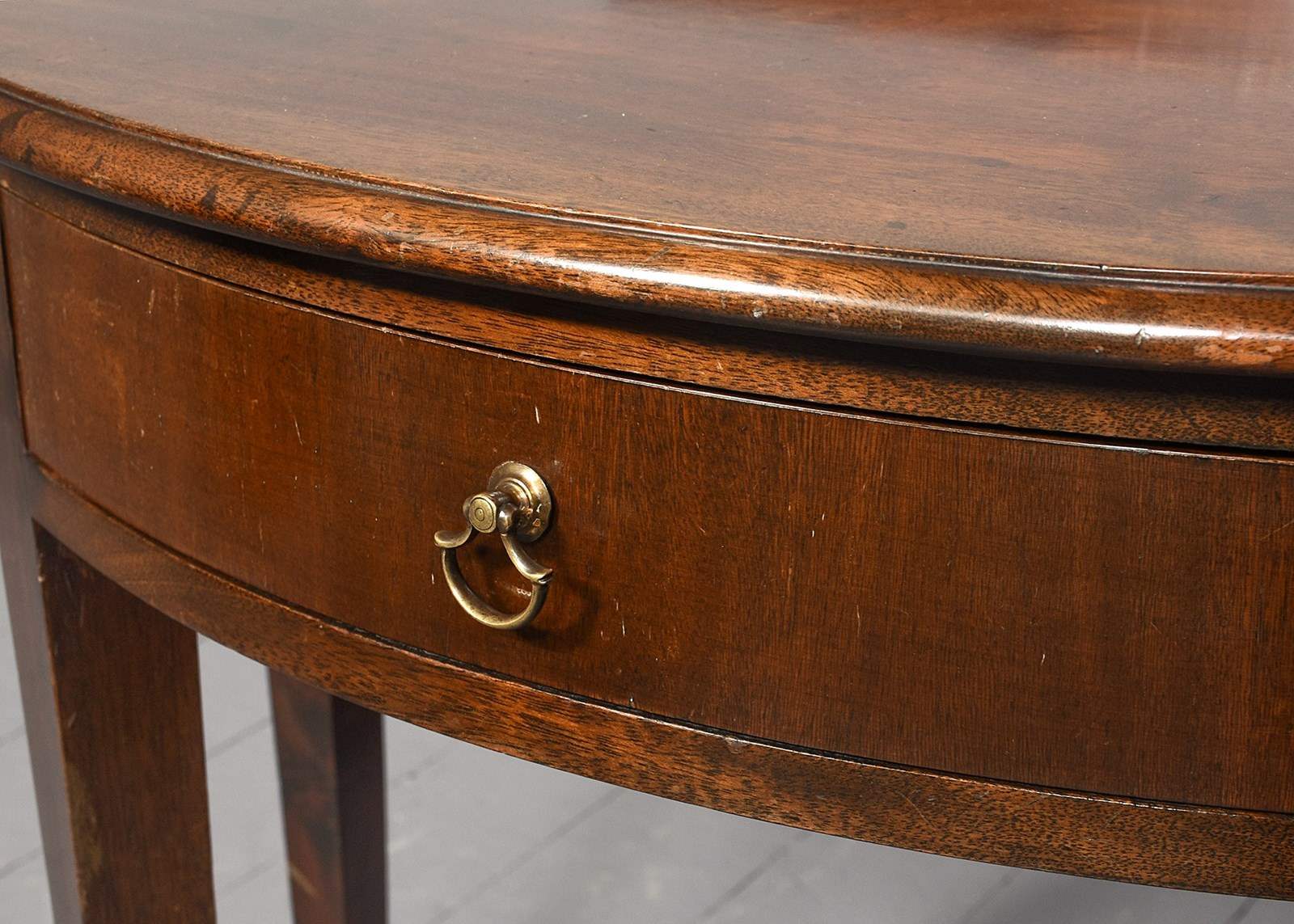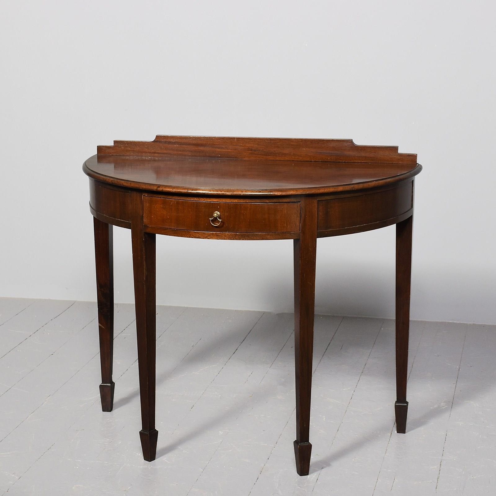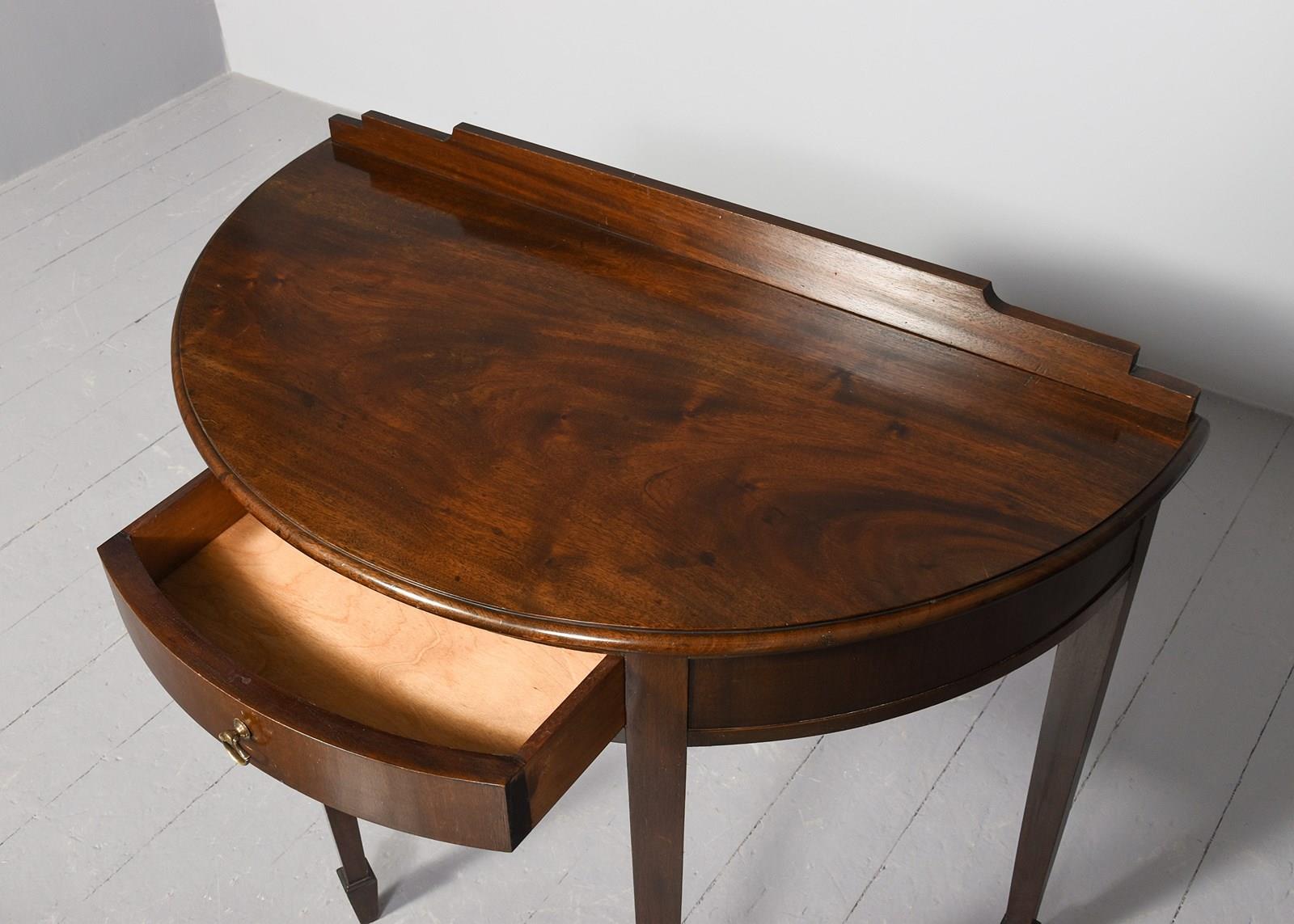 Circa 1900. A Georgian style D-shaped hall table, the top with finely figured mahogany with a shaped ledge to the back, the frieze with a bow-fronted drawer with a classic cast brass axe head drop, supported on four square tapering legs with extended spayed toes.