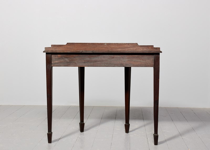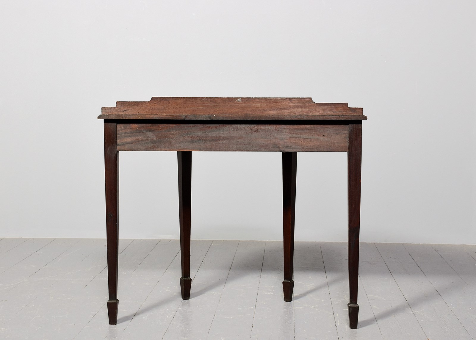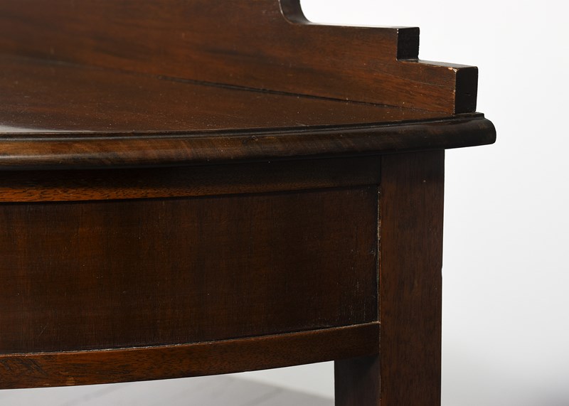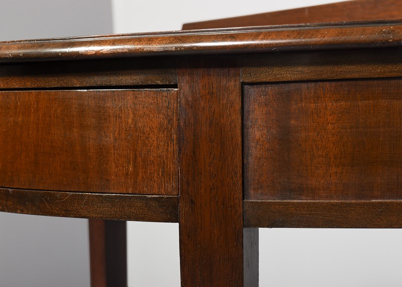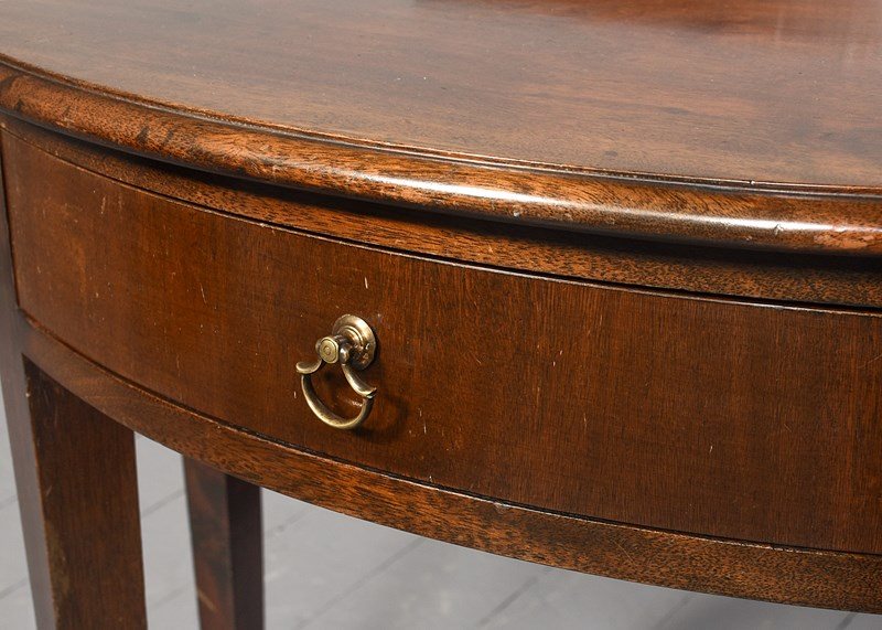 Circa 1900. A Georgian style D-shaped hall table, the top with finely figured mahogany with a shaped ledge to the back, the frieze with a bow-fronted drawer with a classic cast brass axe head drop, supported on four square tapering legs with extended spayed toes.