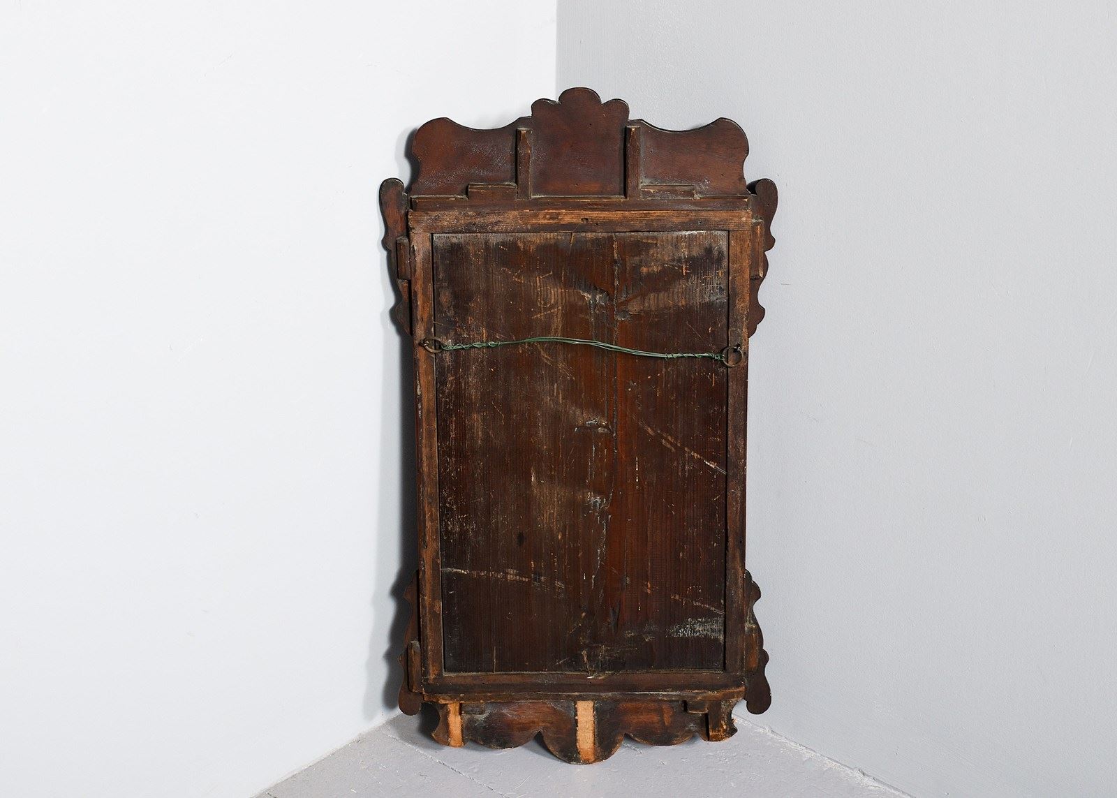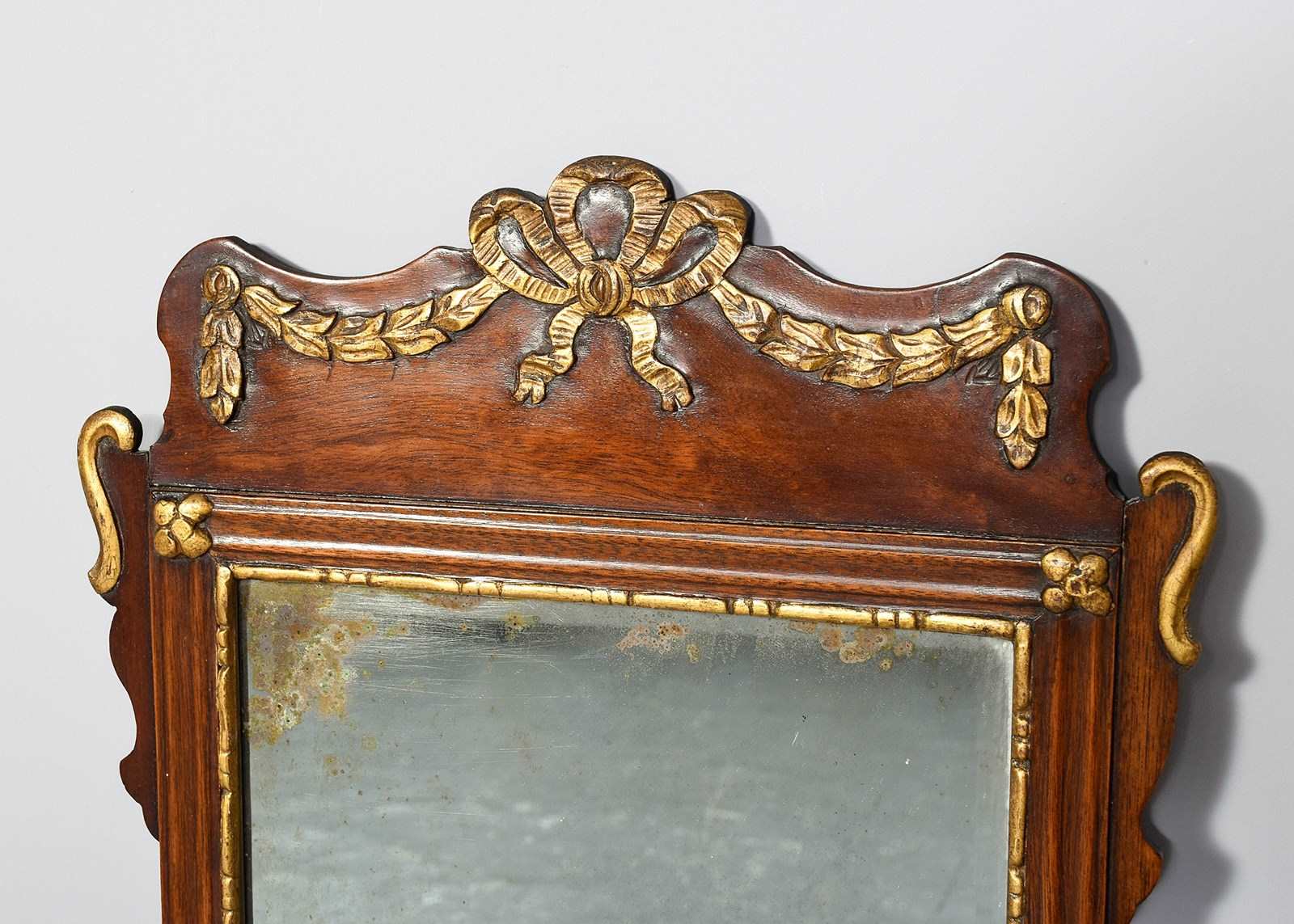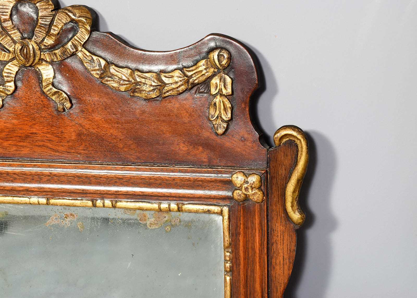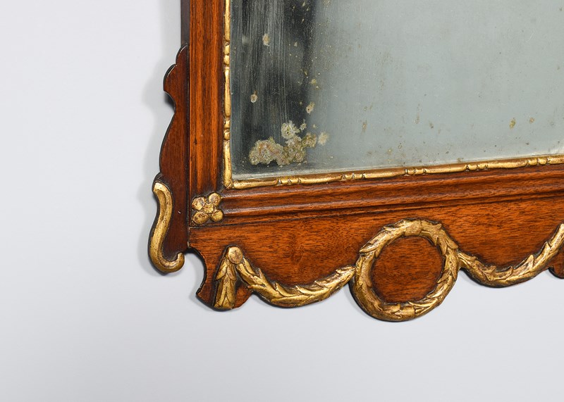 Circa 1870. A George III style mahogany fretwork and gilded mirror, the shaped top with gilded carved swags, ribbons and tails, with extended S scrolls at the top and the bottom, the bevel edge mirror with slight foxing, held in place by a gilded beaded slip, the base of the mirror with a carved gilded wreath, with swags each side which follow the form of the fretwork.