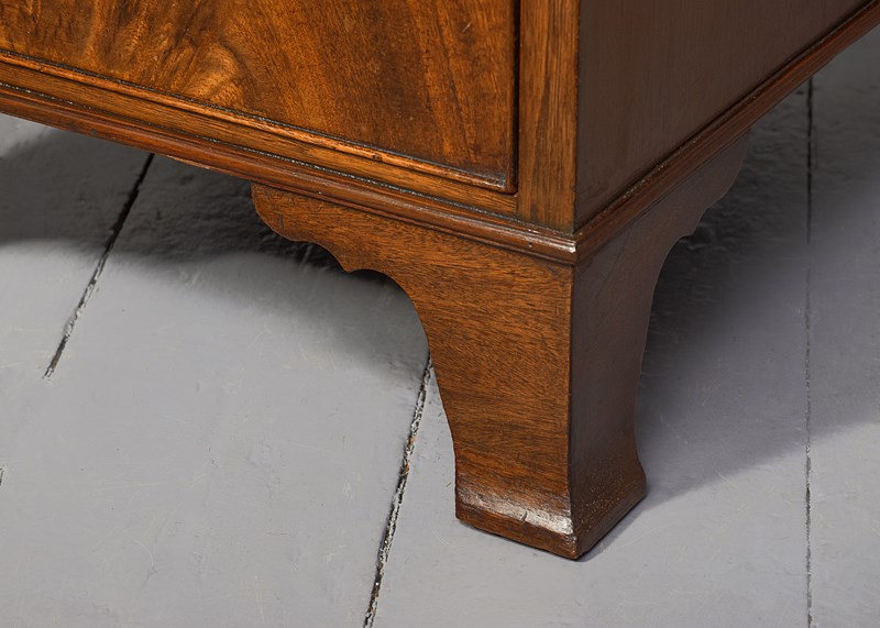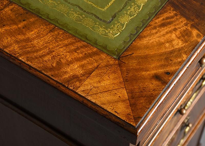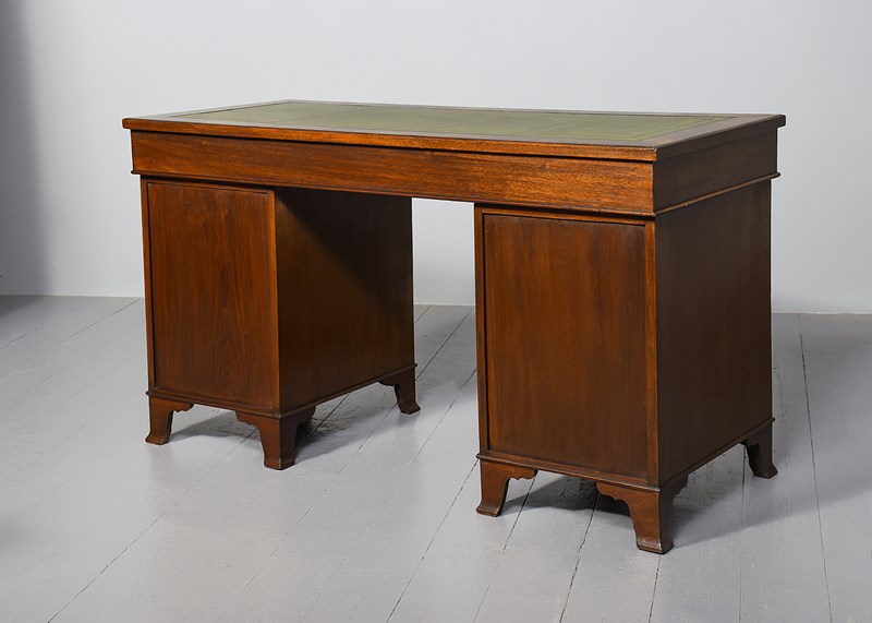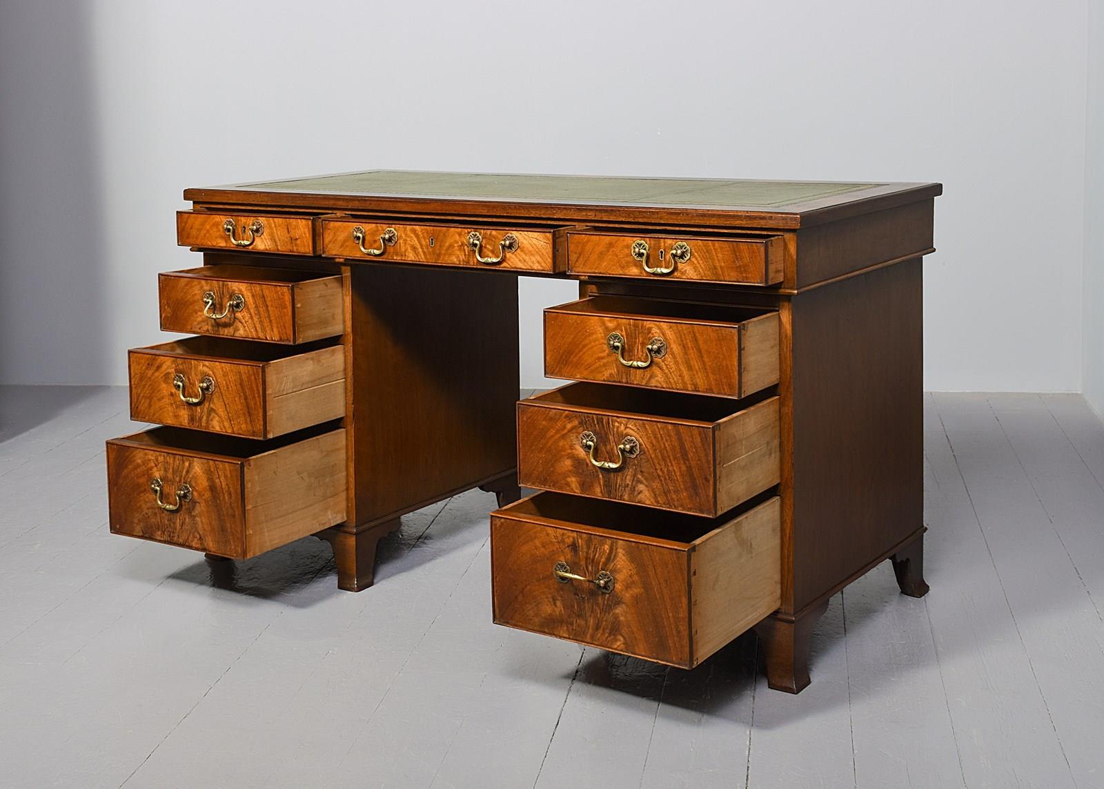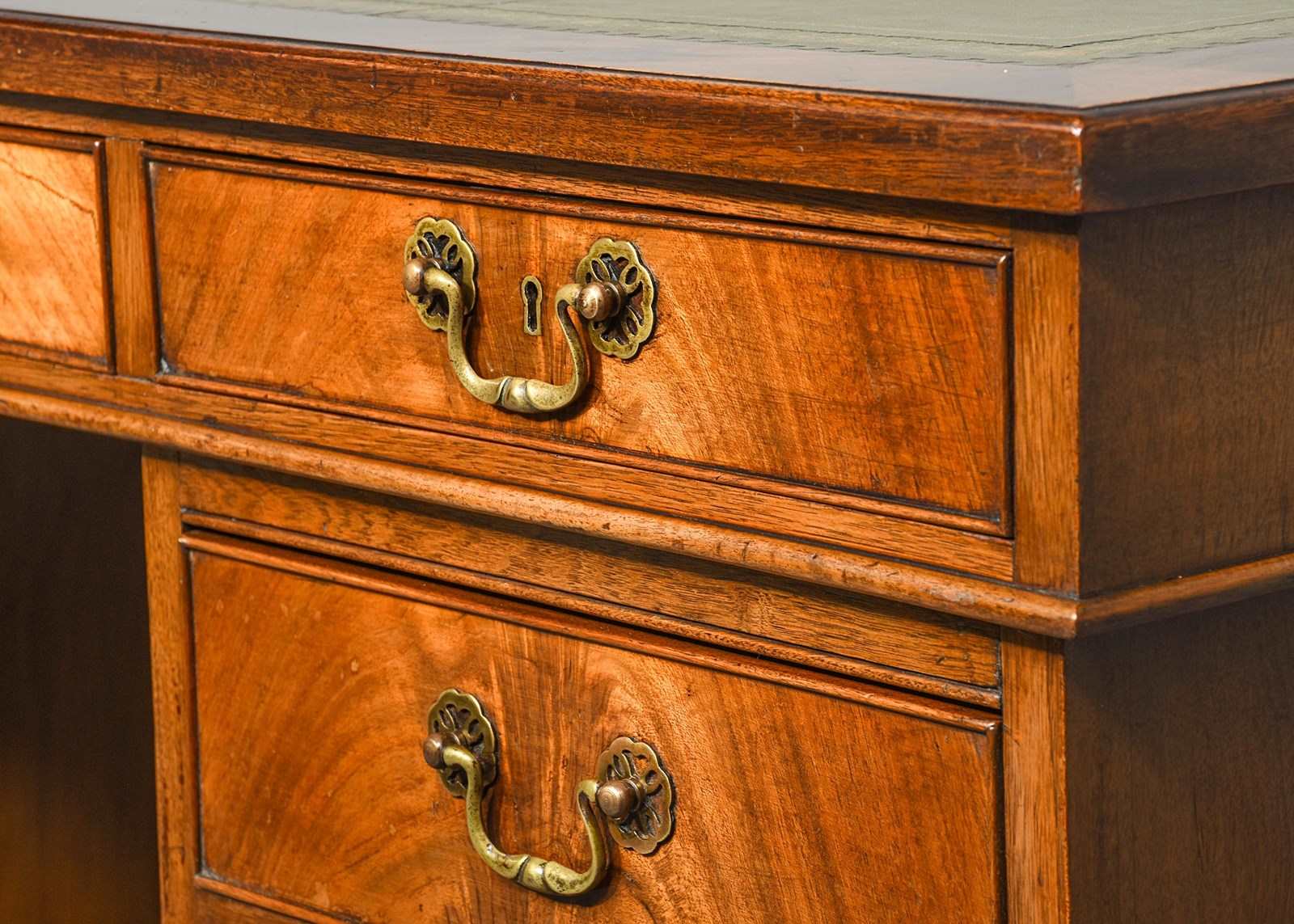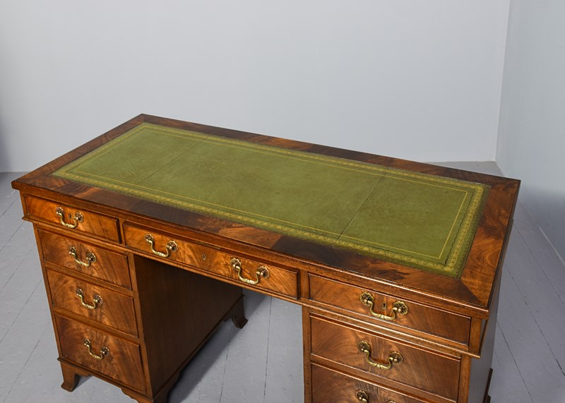 Circa 1880. Quality George III style mahogany pedestal desk, the top with insert green embossed and gilded leather, with broad flamed mahogany cross banding with a simple moulded fore-edge, the frieze with a configuration of one long drawer flanked by a pair of shorter ones, all with cast brass swan neck handles with pierced flower shape back plates, the drawers in the top have ‘Chubb patent locks, London’, resting on a pair of pedestals each with a bank of three graduating drawers with similar handles to the top with flame mahogany facings and cock beading, beneath the bottom drawer there is a beading that runs around the entire desk which is polished on all sides making it freestanding, each of the pedestals are supported on four French bracket feet.