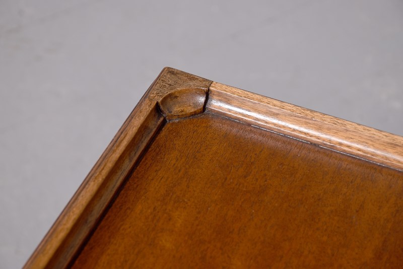 The rectangular top in a nice quality mahogany with a low, wrap-around gallery and a frieze drawer with a brass swan-neck handle and a faux drawer on the opposite side. Beneath is a shaped under-tier and all supported on chamfered scroll legs.