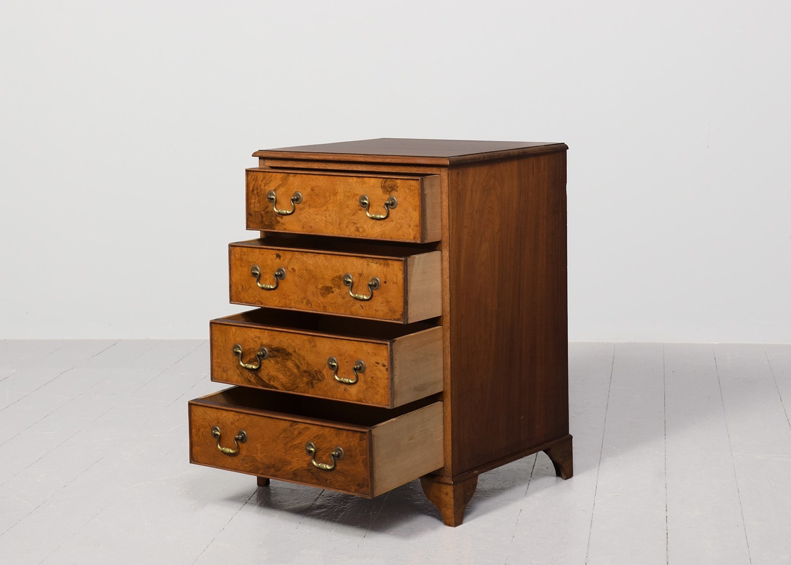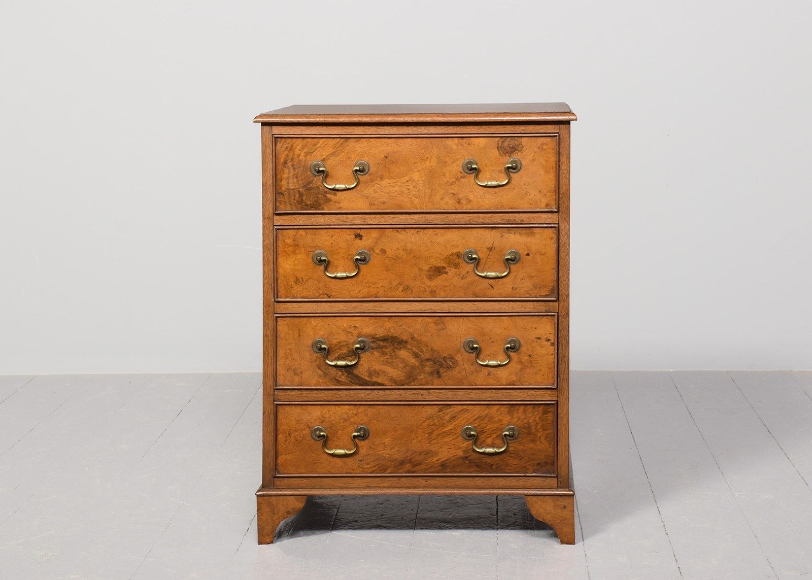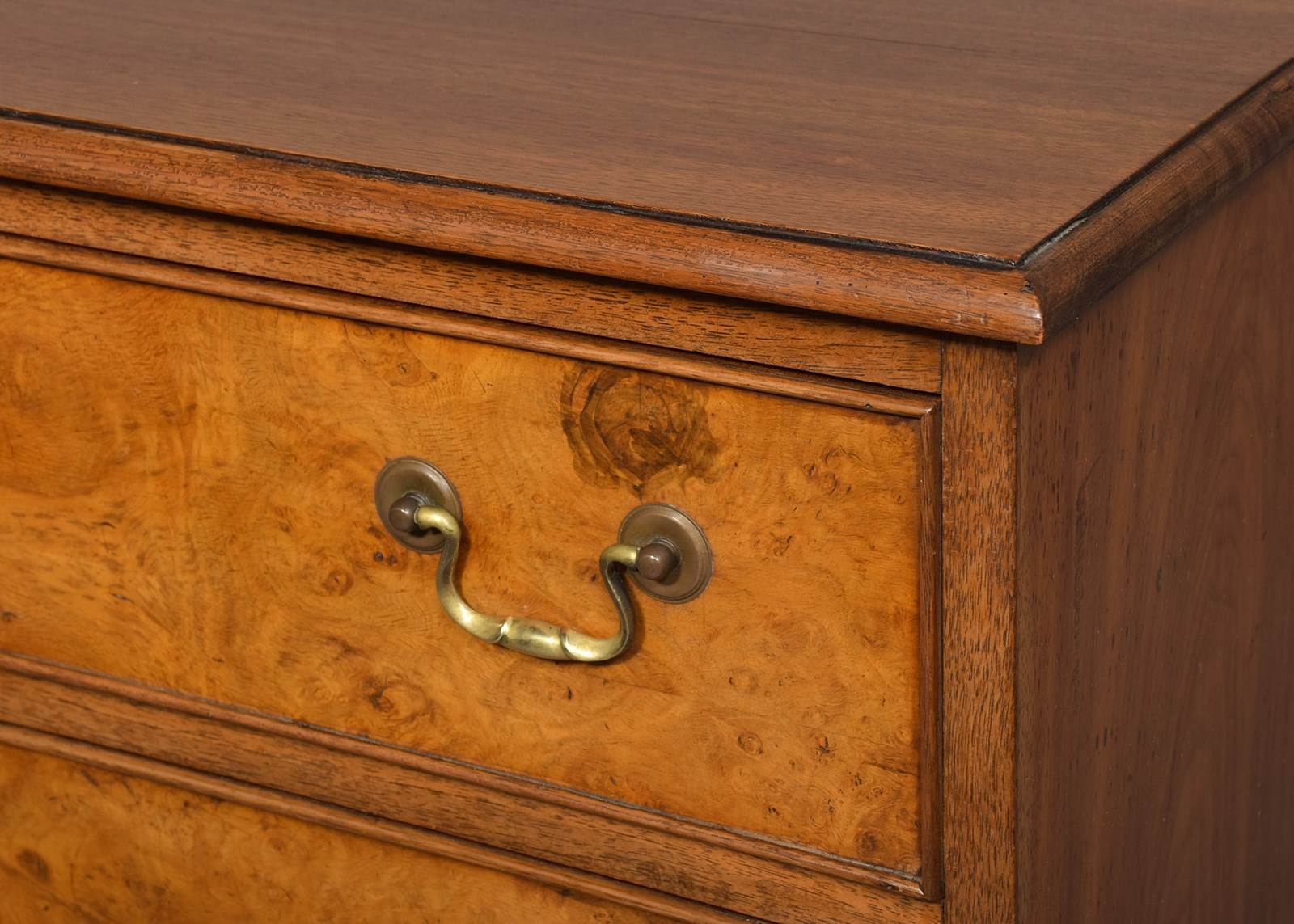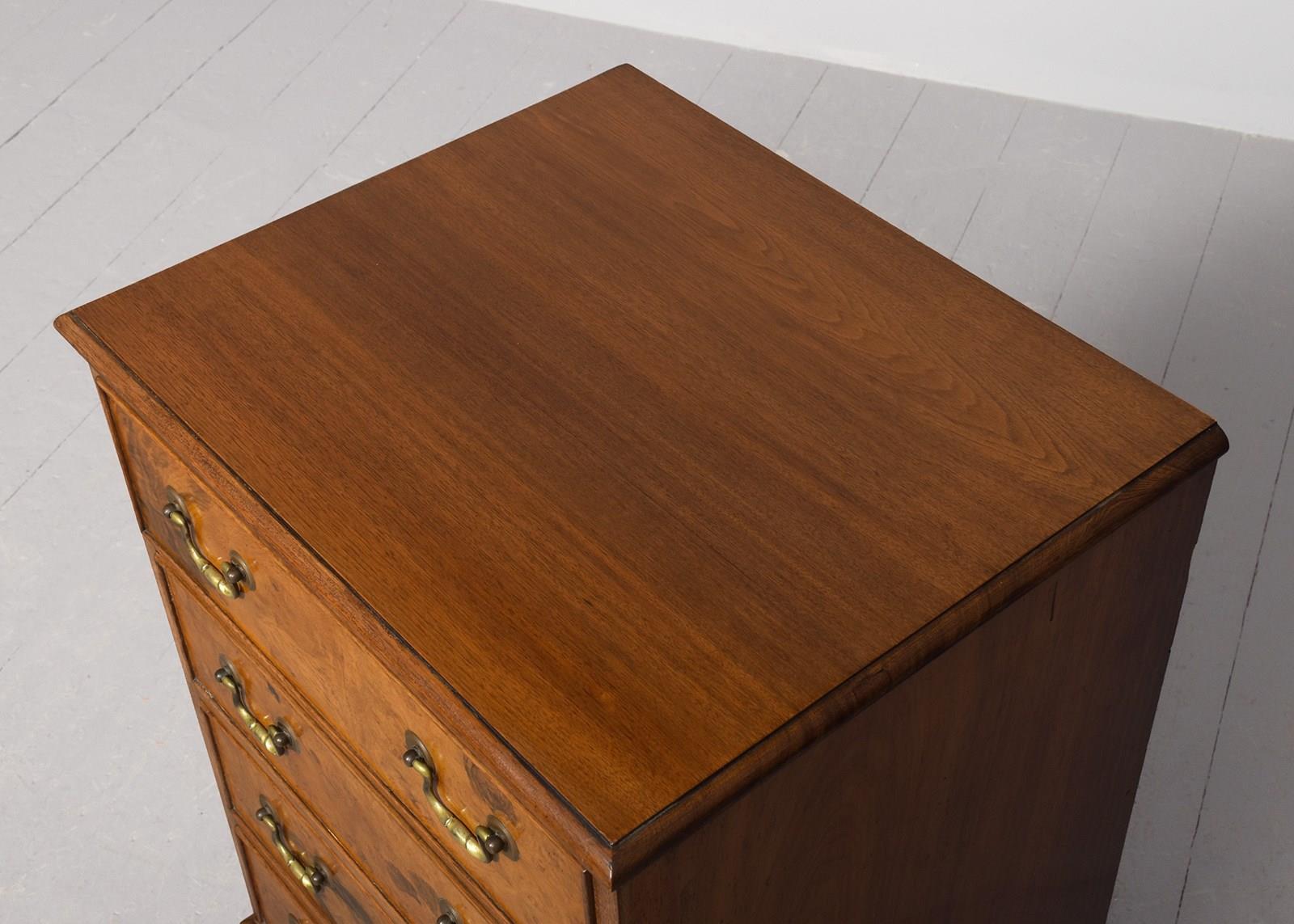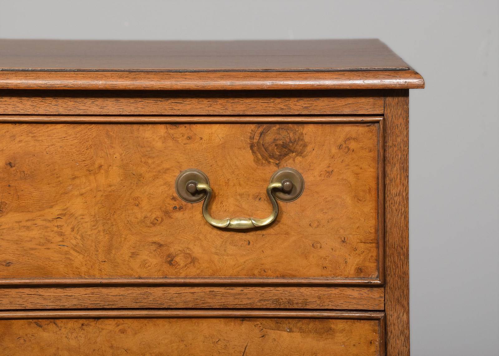 Circa 1920s. A George III style walnut and burr walnut chest of drawers, the top in figured walnut with a moulded fore-edge, the front four full length beaded drawers in burr walnut, with swan neck handles, beneath the bottom drawer there is a simple moulding, resting on four French-style bracket feet.