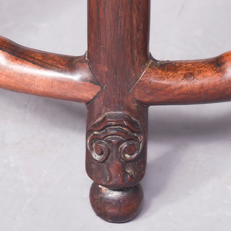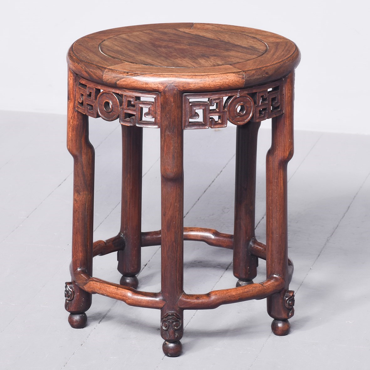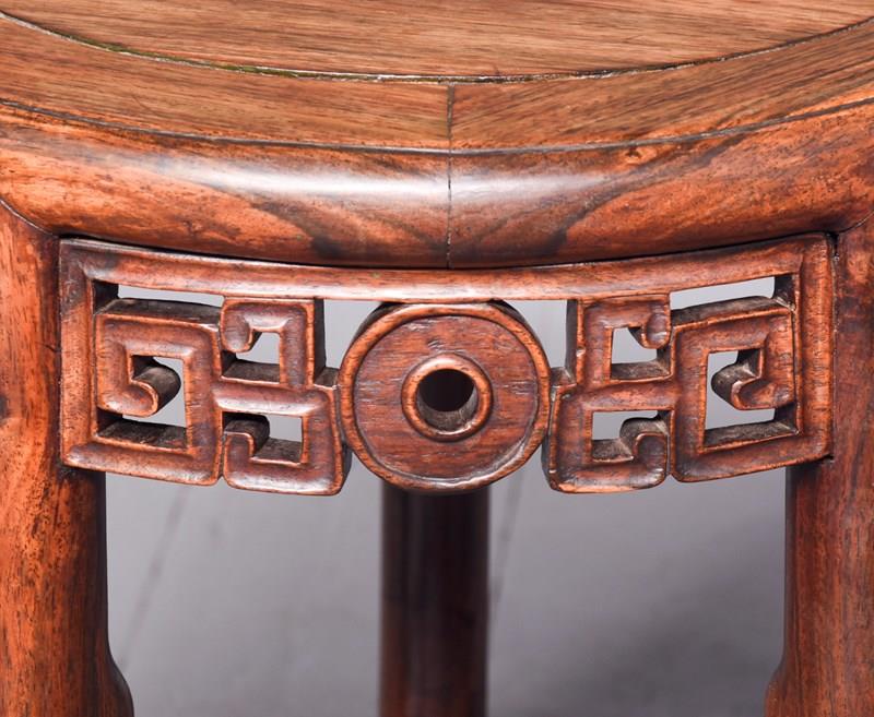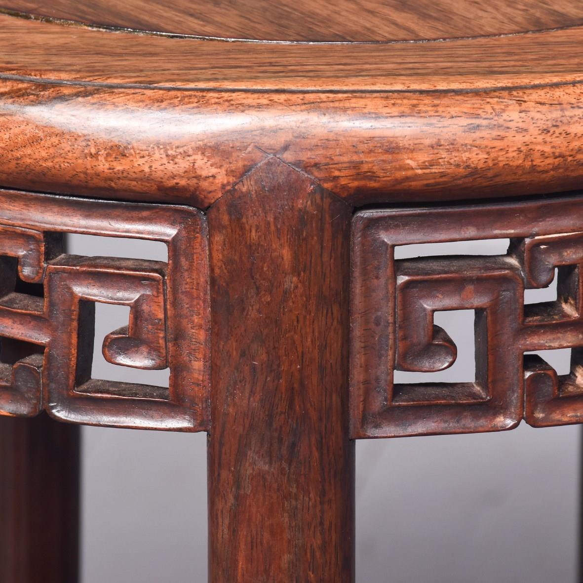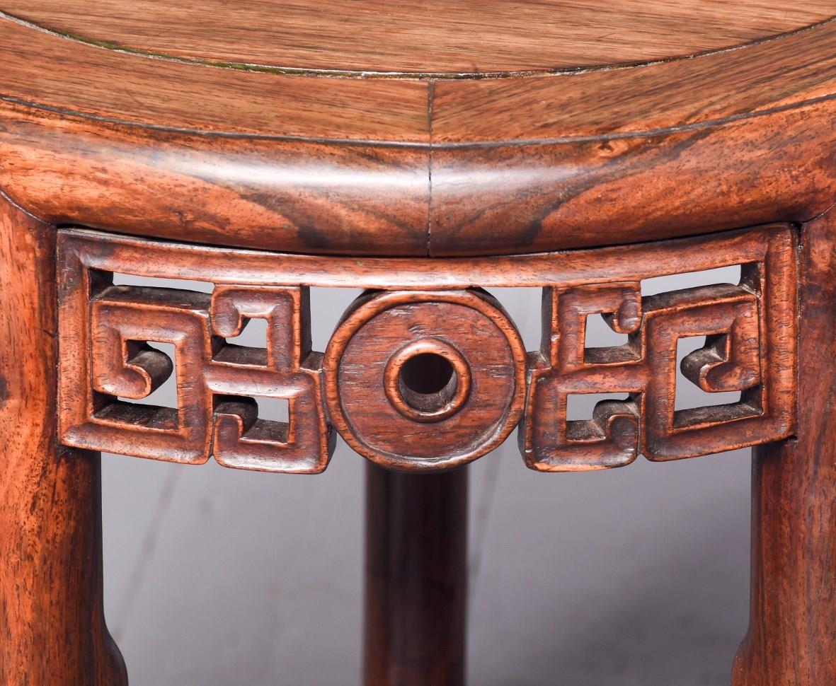 Circa 1890. A quality Qing Dynasty Hongmu circular solid top occasional table. The well figured insert top held with five panels forming a circle, with a moulded edge and pierced frieze with Chinese motifs, resting on five turned and shaped leg, intersected by shaped and wavy stretchers, with foliate carving beneath finishing on a circular bun foot. Excellent colour and patination.