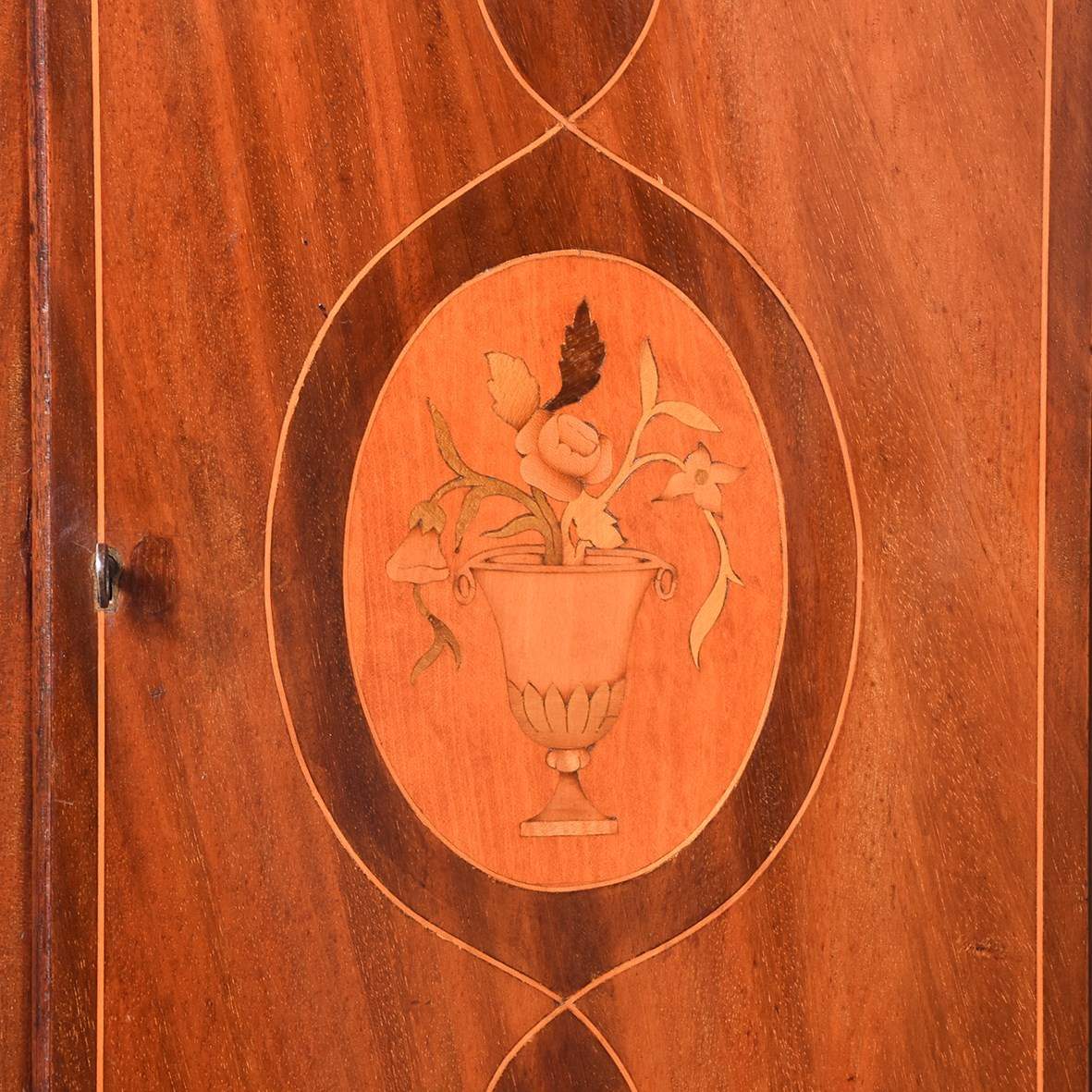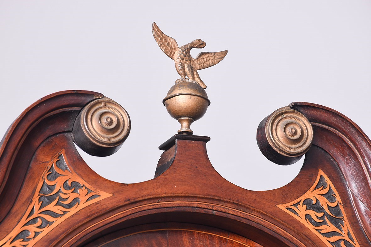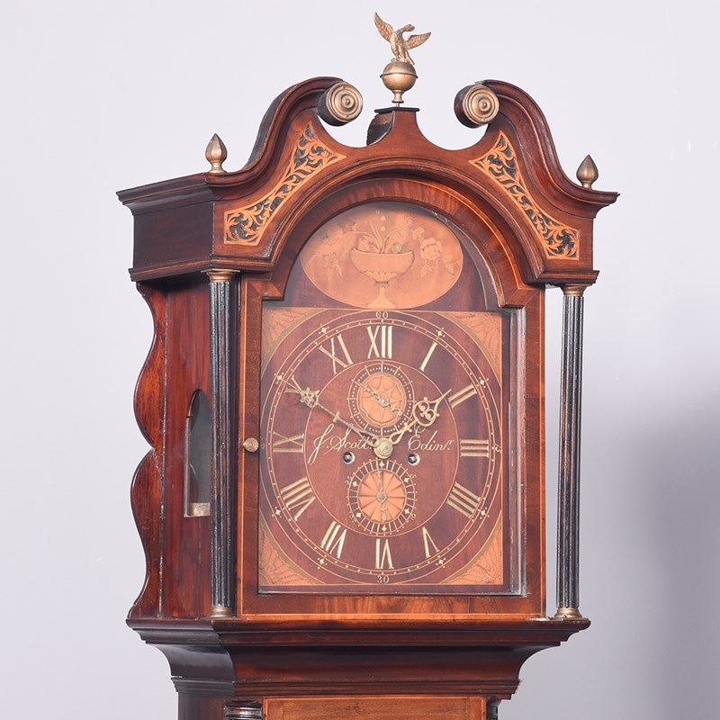 Circa 1800. Inlaid mahogany-faced Scottish Georgian grandfather clock in excellent condition. The hood surmounted by a swan neck pediment and eagle finial over a satinwood fretted frieze. The arched mahogany clock face with Roman numerals, two accessory dials and satinwood urn and fan inlays. The case with fluted corners and a boxwood and marquetry inlaid door, the base with rosewood and boxwood inlay and inlaid corners over ogee bracket feet. The dial engraved J Scott Edin.