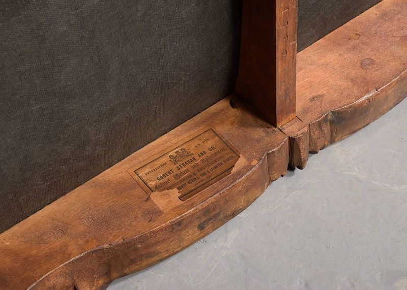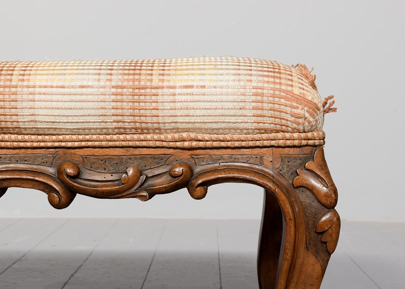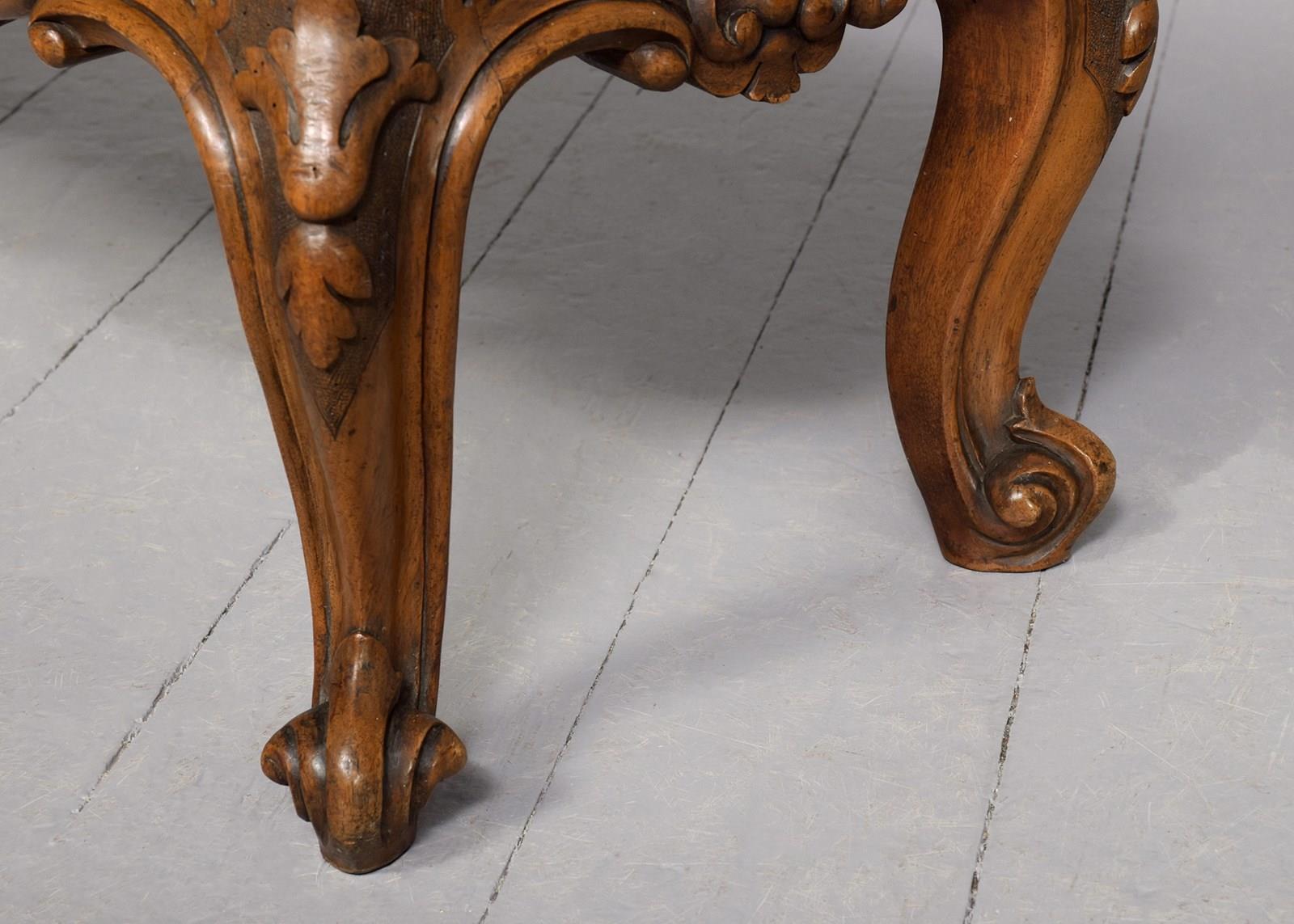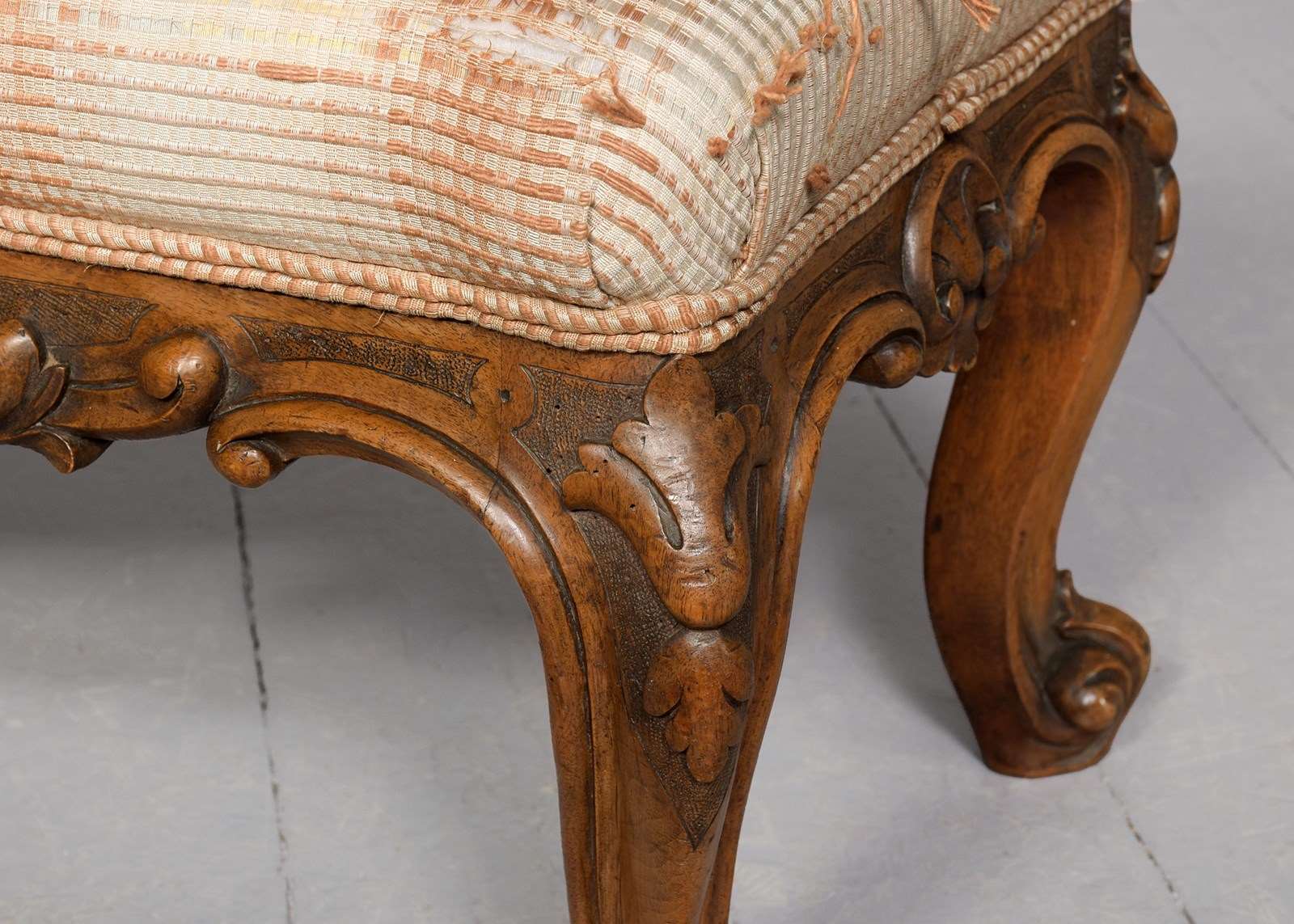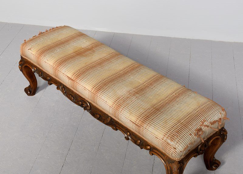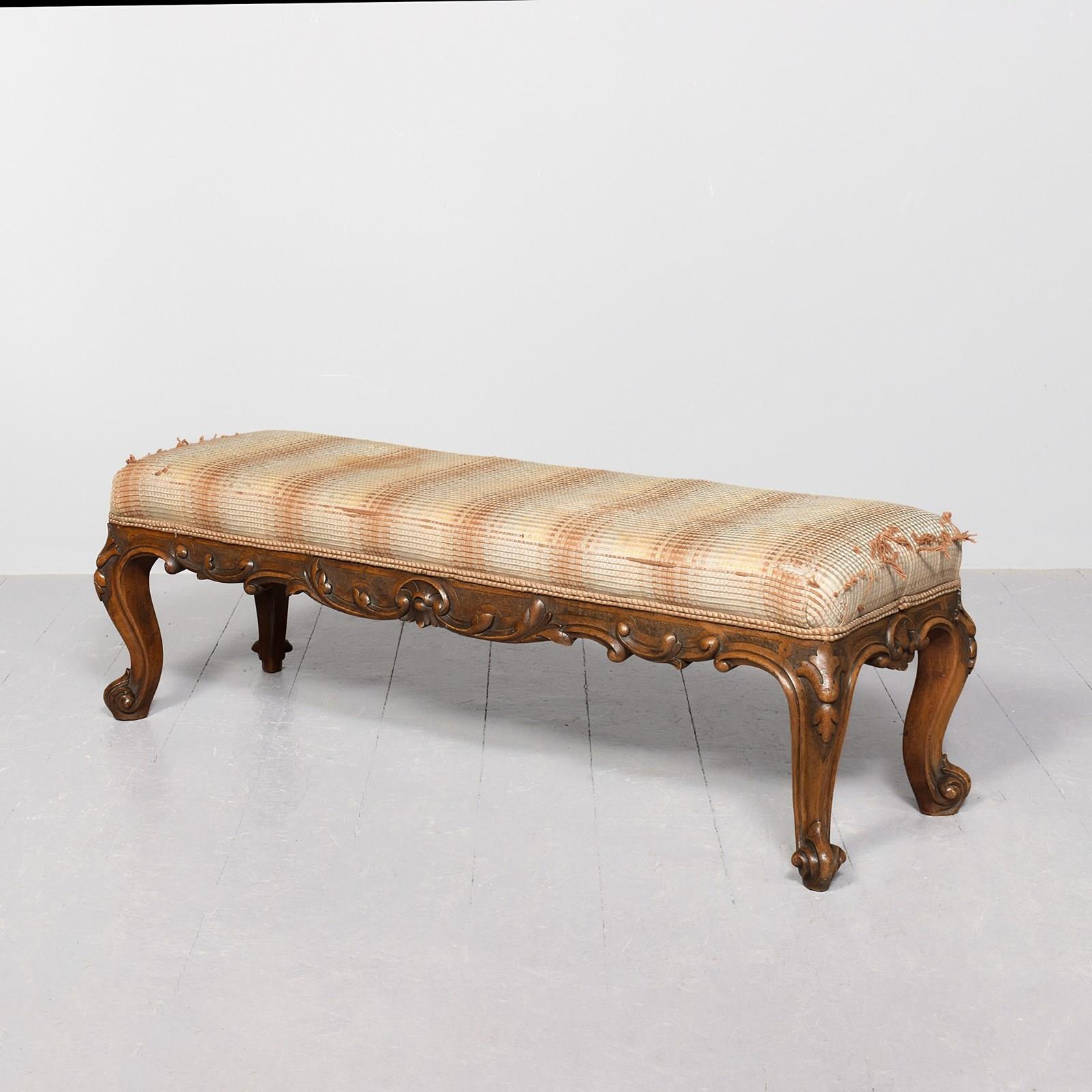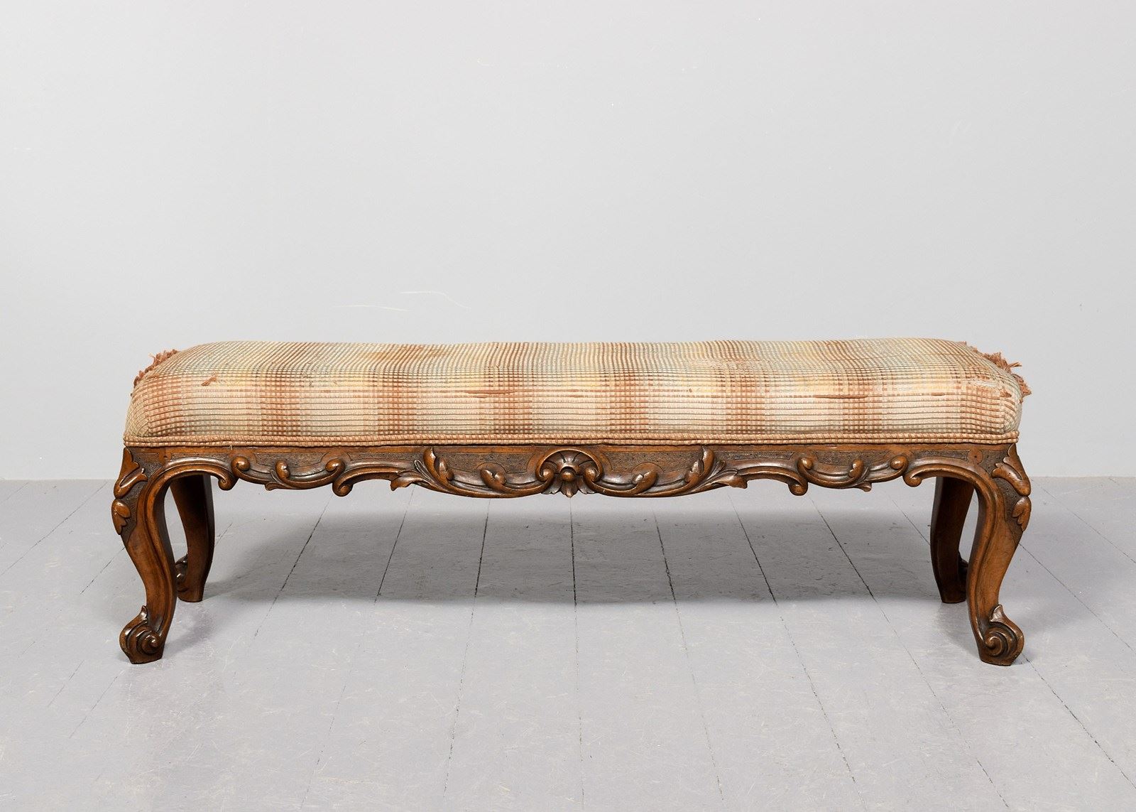 Circa 1860. Impressive, large carved mahogany stool by Robert Strahan of Dublin. The rectangular stool with overstuffed seat (needs recovering) with beautifully carved seat rails with rococo scrolls and acanthus decorations. Supported on bold cabriole legs with foliate carved knees and scrolled toes, bearing stamp ‘Robert Strahan & Co. Cabinetmakers and upholsterers, Henry Street and Leinster Street, Dublin. Est 1776.’