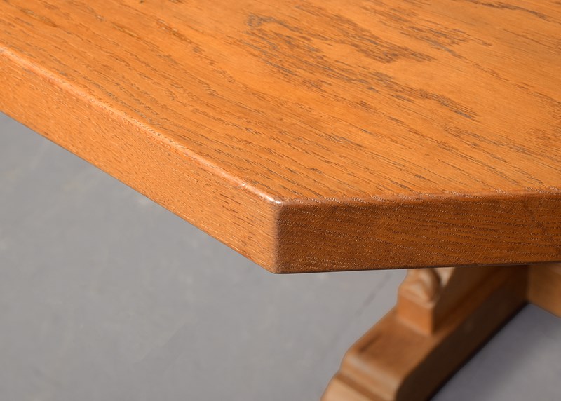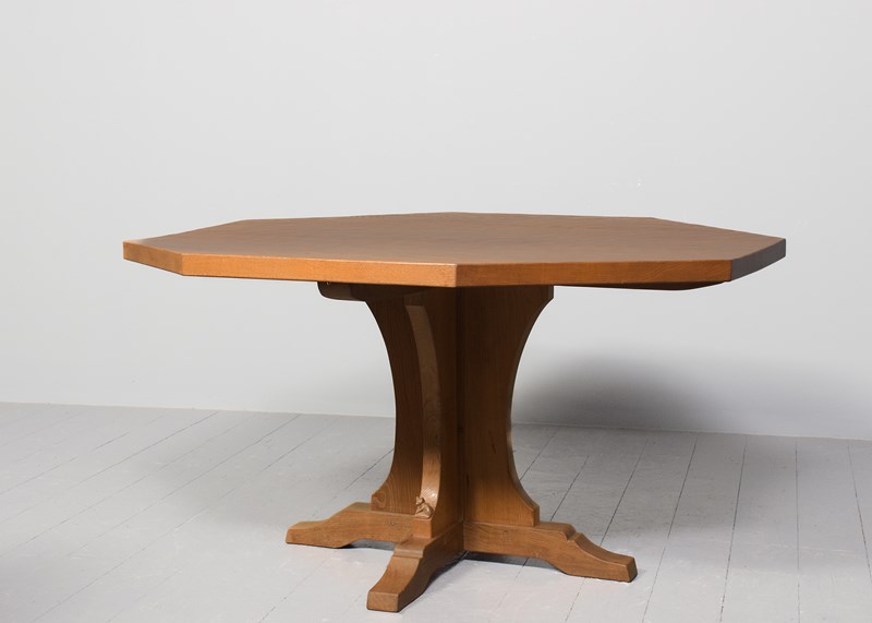 Circa 1960s. Impressive large handmade Yorkshire “critter” Foxman (Don Craven, Oldstead, Thirsk- ex Robt Thompson)_ hexagonal oak dining table. The 4.5cm thick, solid hexagonal top in a lovely, figured oak and with adzed finish with good colour and patina, supported on a cruciform plinth with the signature carved fox, over shaped plinth bases. Lovely original colour and patina. Comfortable seats 8.