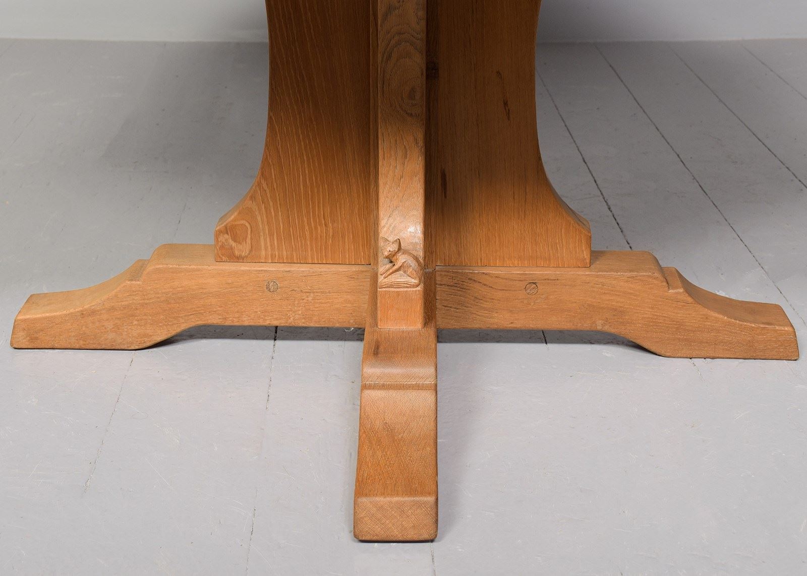 The full fox carving shows this table was made by Don Craven, Oldstead, Thirsk (who trained with Robt Thompson). Malcom “Benny” Pipes was also known as Foxman, but he used low-relief fox head carvings as a signature