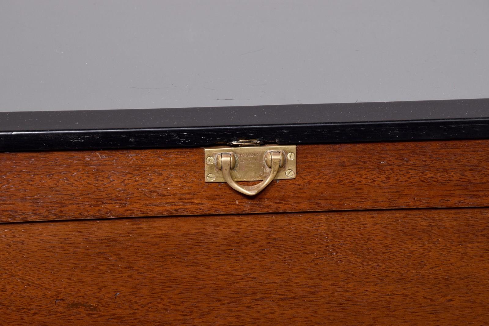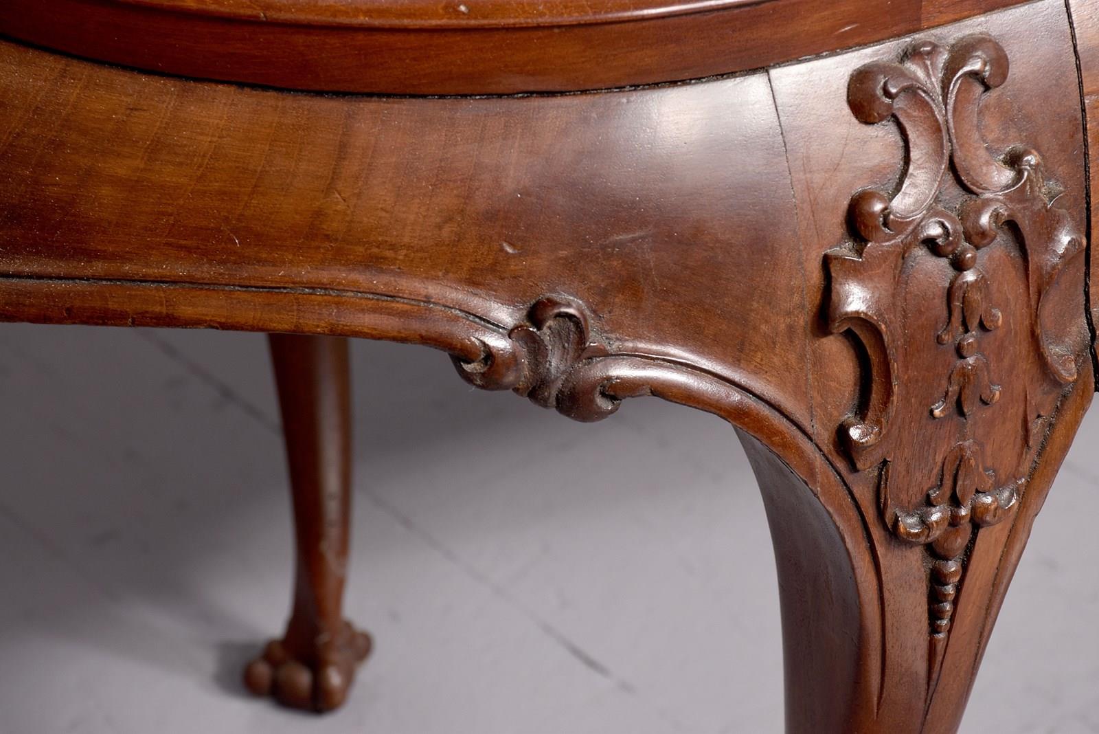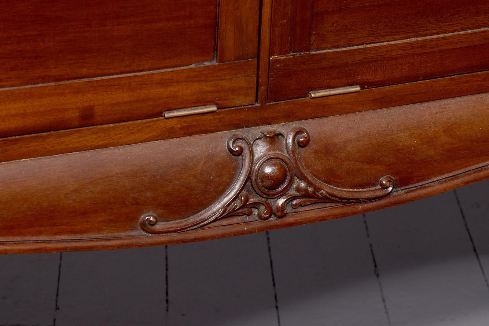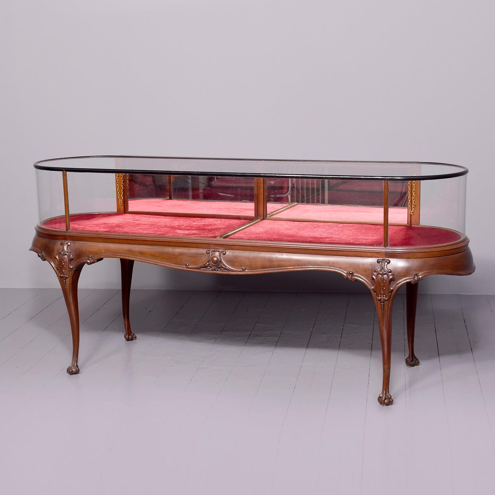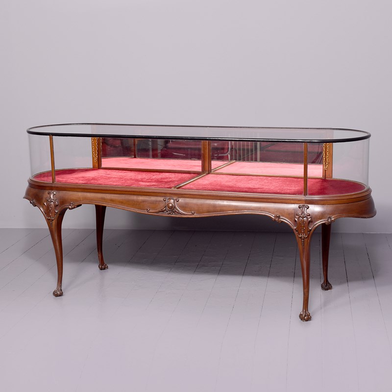 Circa 1880. A large stylish mahogany glass and mirrored display counter, the elongated counter with curved ends, glazed top and sides, the back section with two hinged mirror doors the inside is lined in red velour, with the fore-edges ebonized, with a shaped and carved frieze, the table rests on four elegant cabriole legs with cartouches carved on the top of the legs, finishing on an elegant neat sized ball and claw foot.