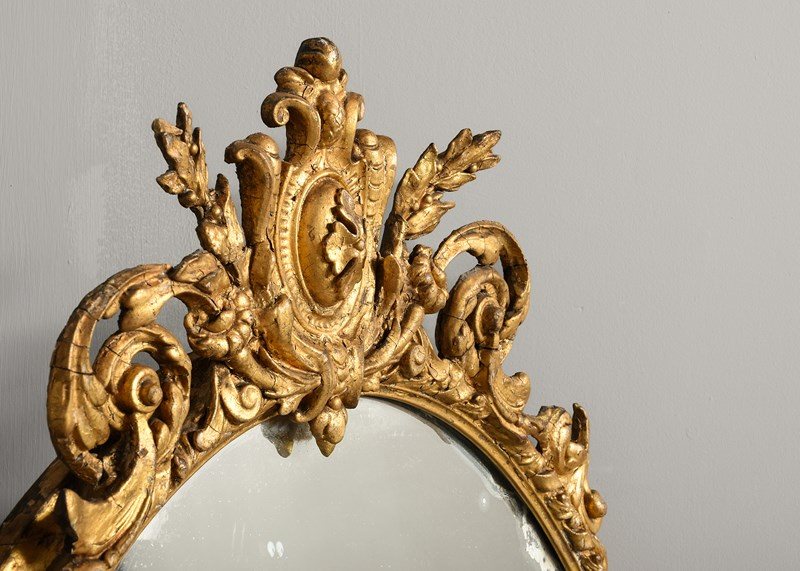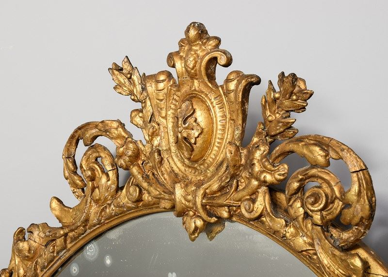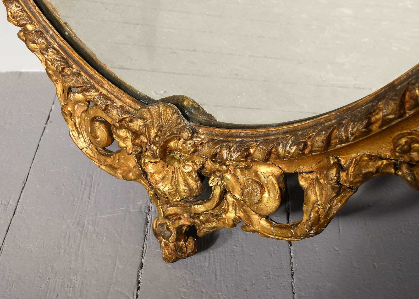 Circa 1850. Large Mid-Victorian carved giltwood oval mirror. The original mirror plate with some “foxing” around its edges in a moulded foliate decorated gilt frame surmounted by C scrolls, central cartouche and acanthus leaves. The base with further acanthus leaf and shell decorations.