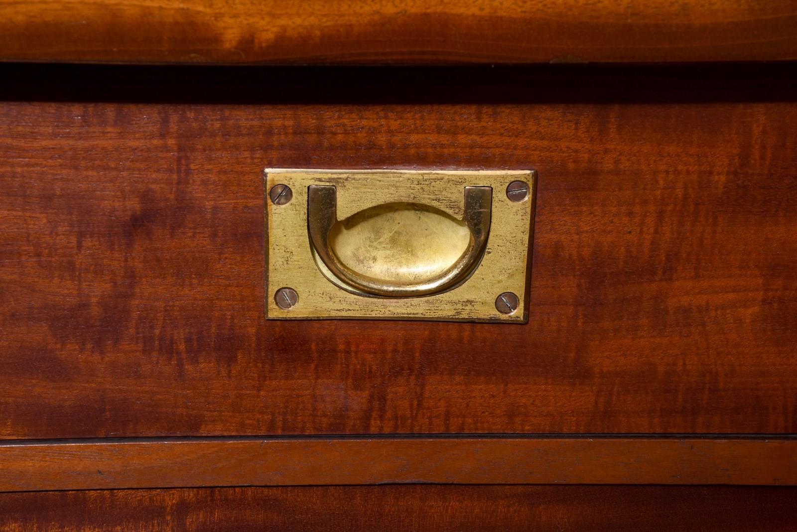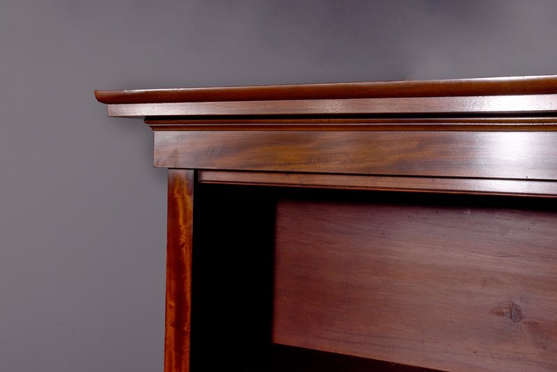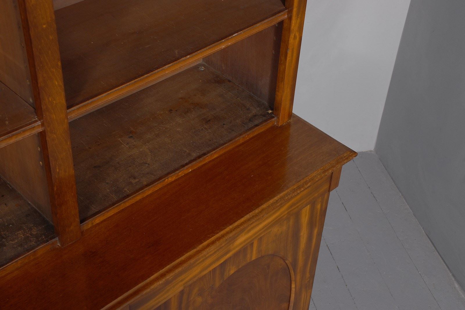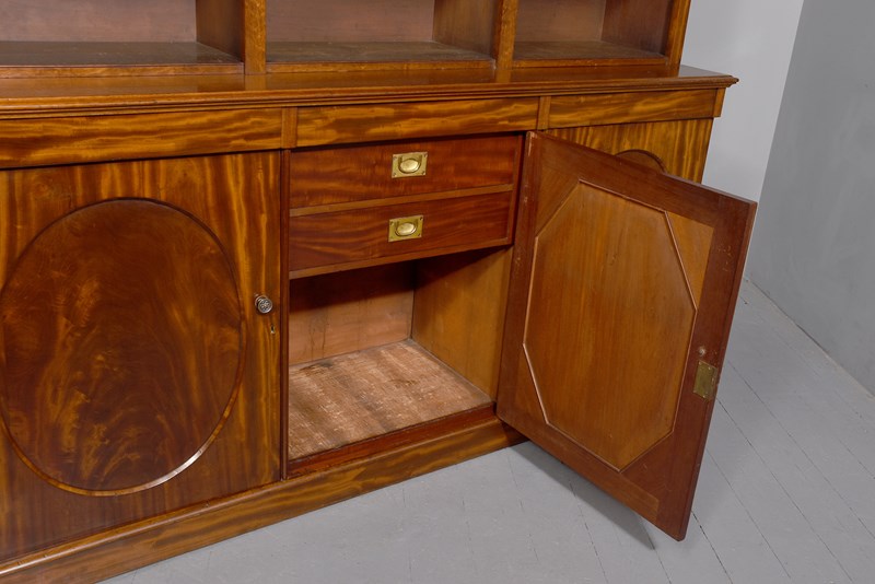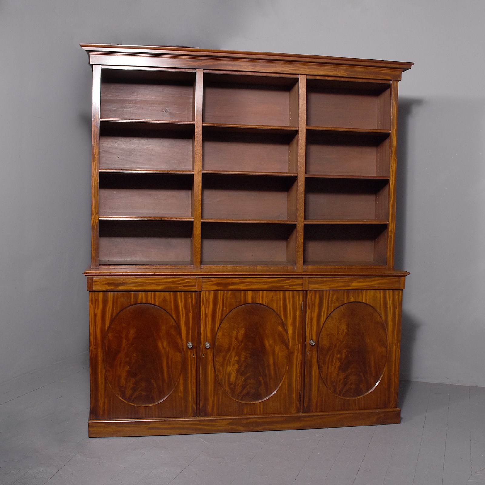 Circa 1850. An early Victorian mahogany three section open bookcase, the top with stylish moulded cornice with a simple beaded frieze, the top section with three open sections, each with three adjustable shelves separated by flat pilasters, the base with three concealed drawers in the frieze and three doors with oval flame mahogany panels with and cast brass knob handles, inside a variations including drawers and shelving, resting on an enclosed mahogany plinth.
