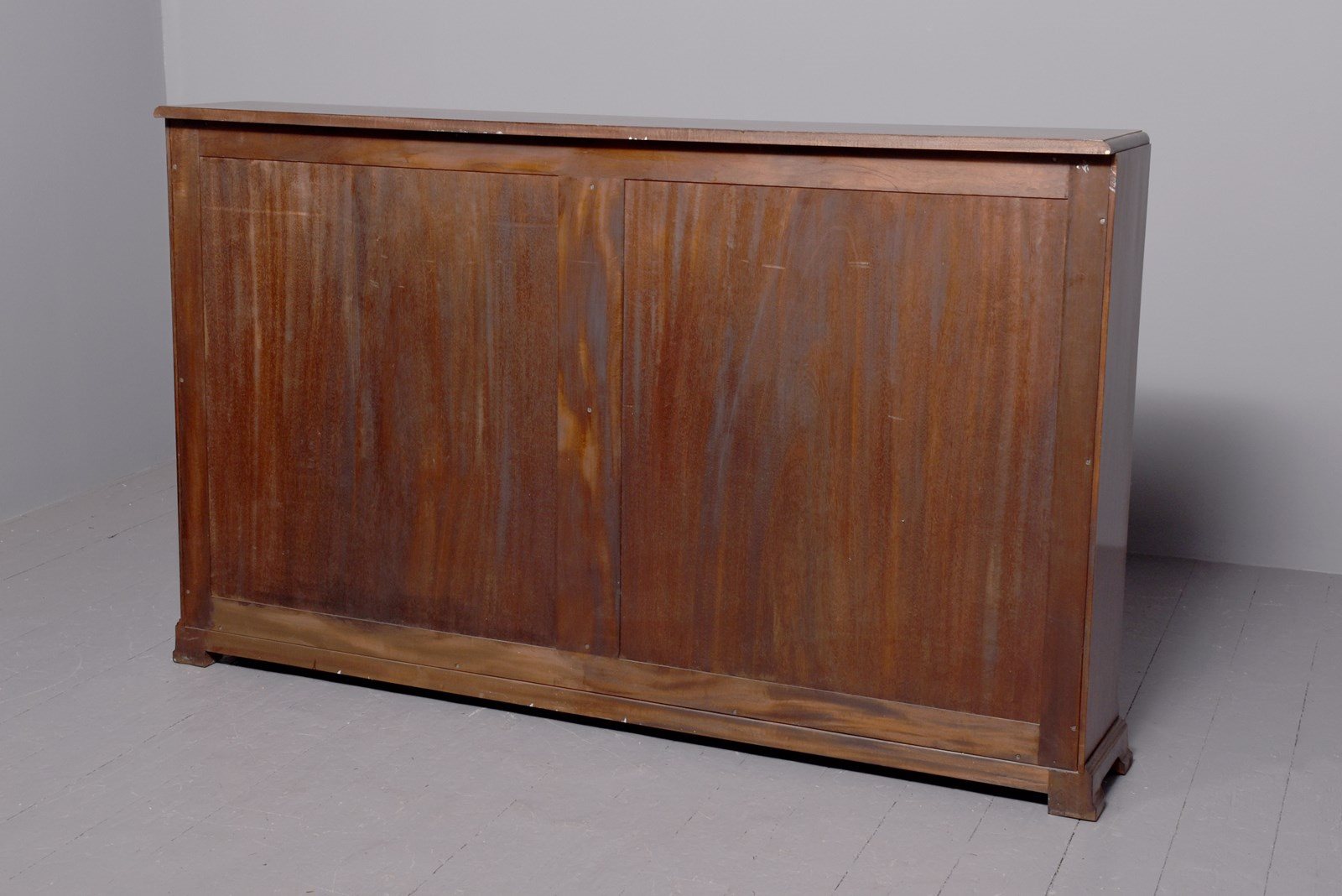 Circa 1930s. A large mahogany double fronted open bookcase by ‘Whytock & Reid of Edinburgh,’ the solid top with rounded corner and simple moulding, the front with two sections, polished on the inside, each with three adjustable shelves, beneath the bottom drawer there is a simple moulding and frieze all resting on four classic ‘Whytock & Reid’ feet.